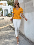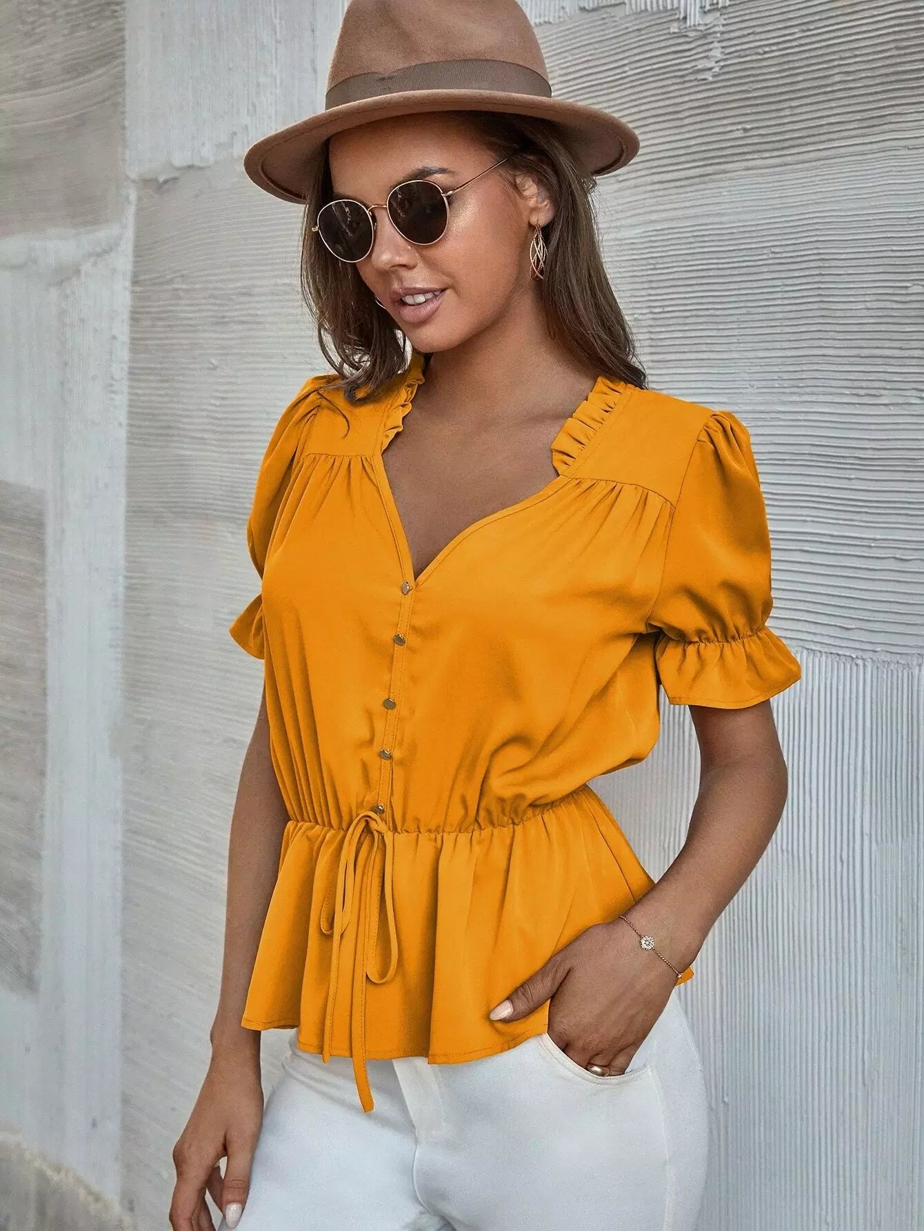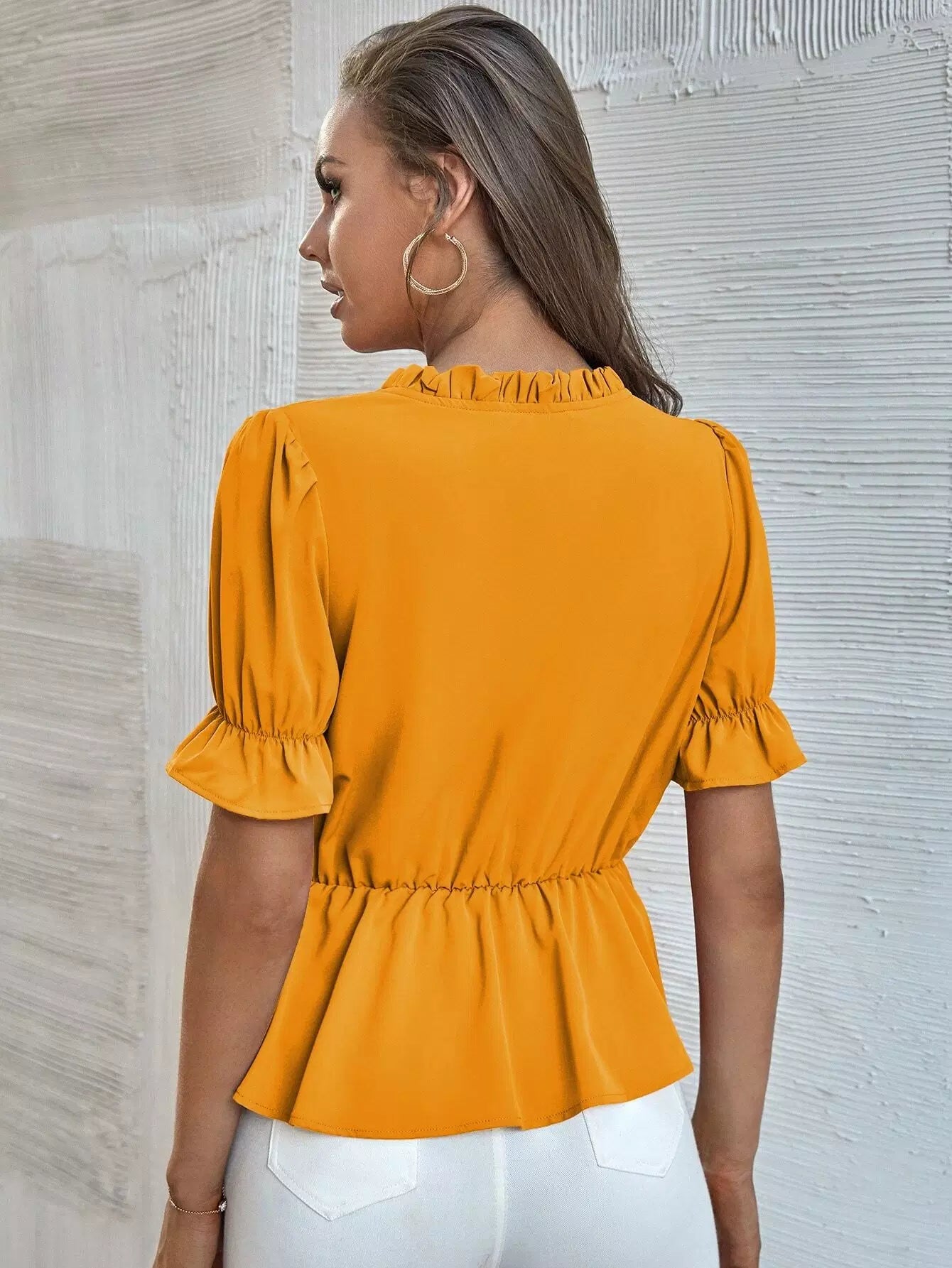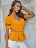 Women - Knot Waist Ruffle Hem Smock Blouse