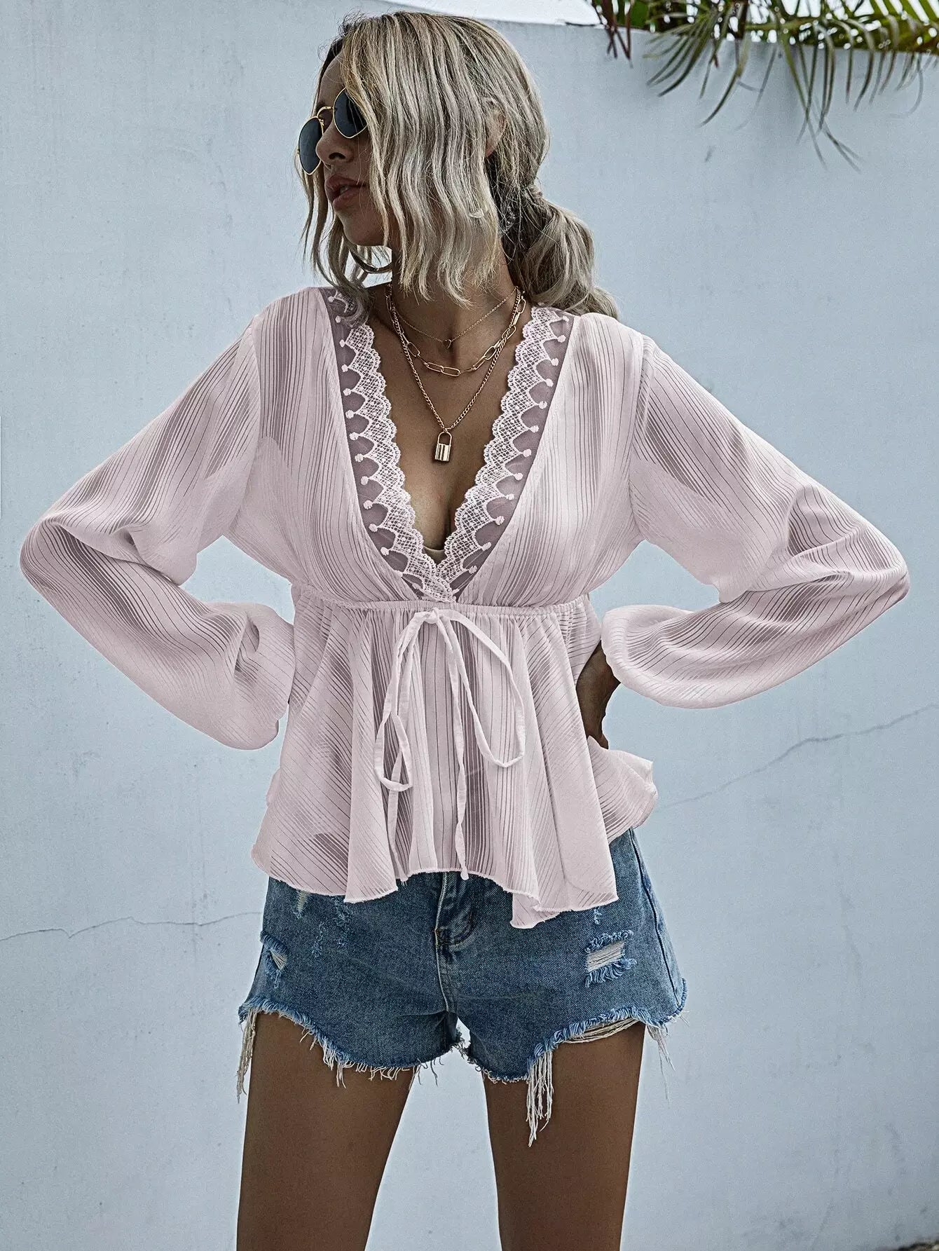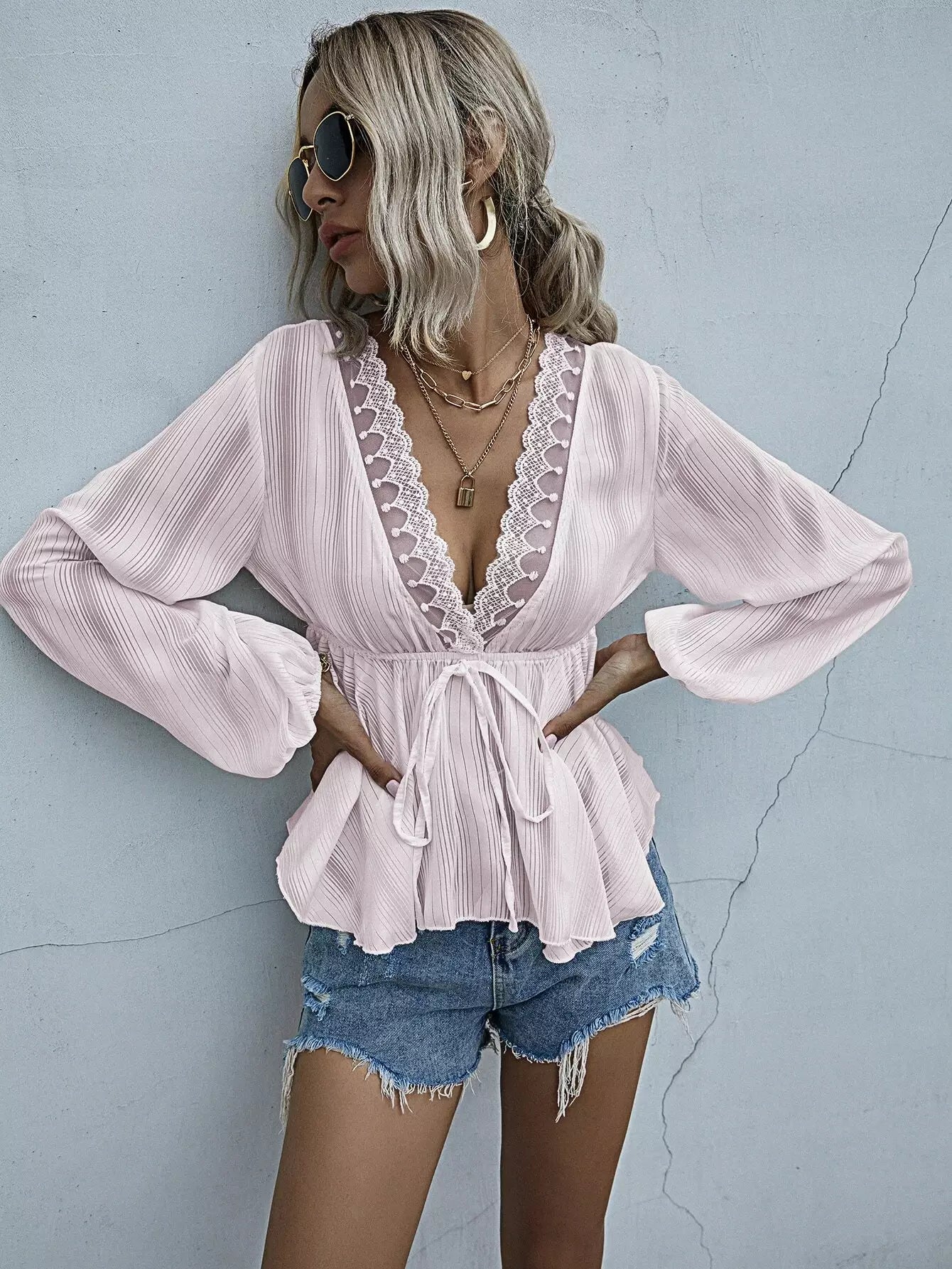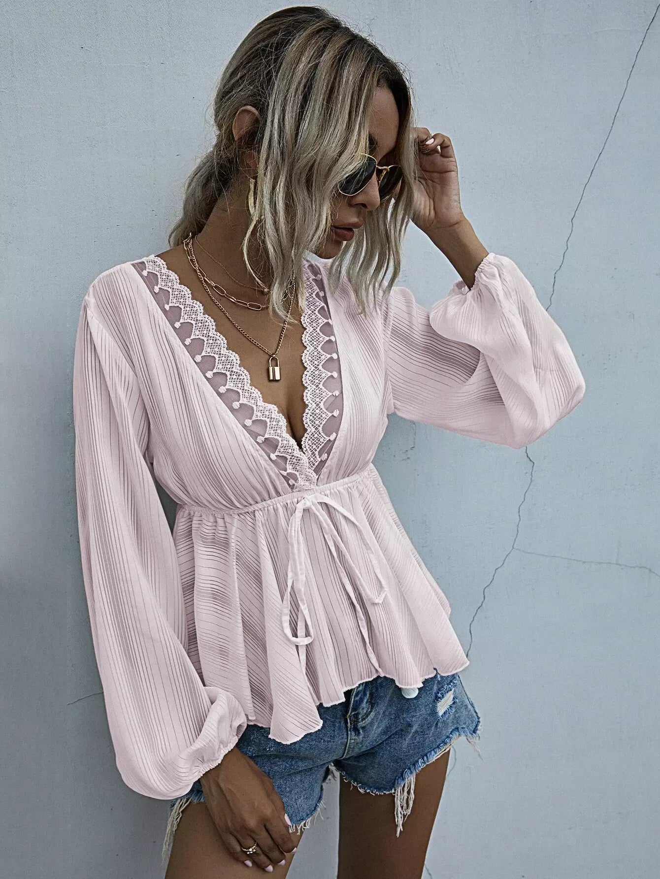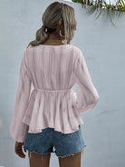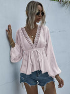Lace Trim Knot Front Peplum Blouse