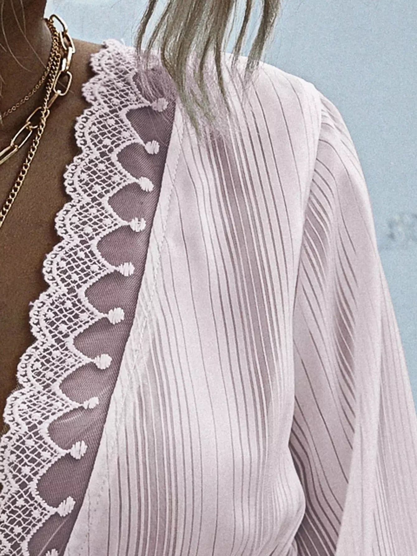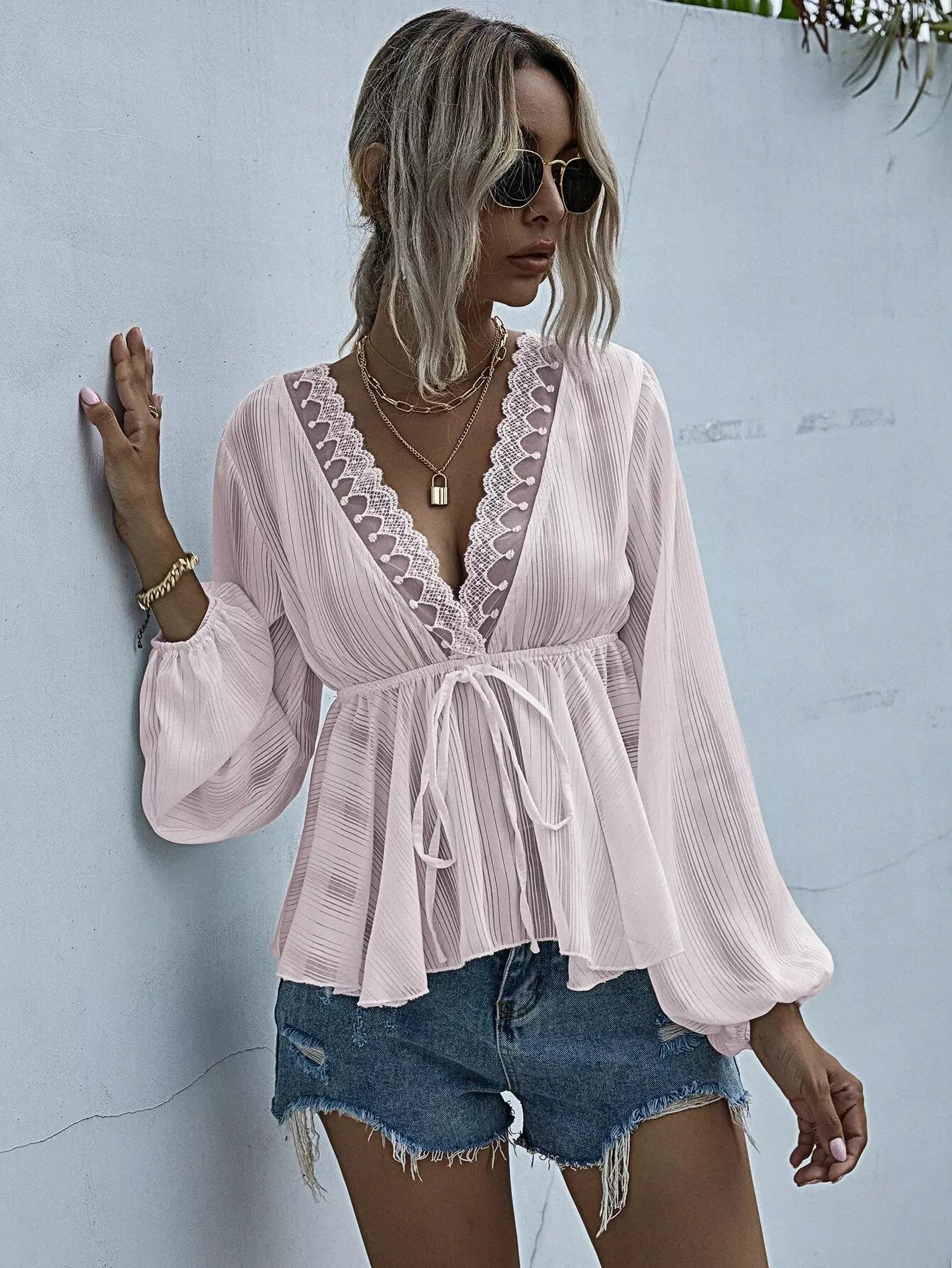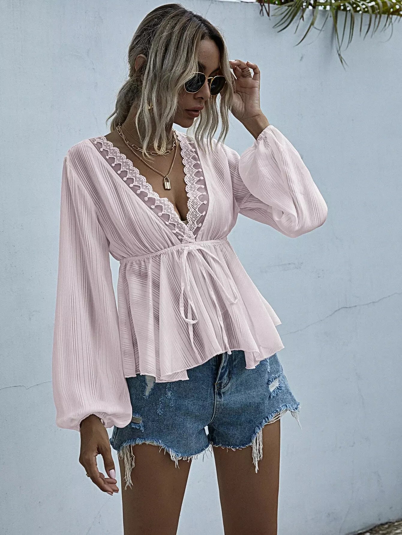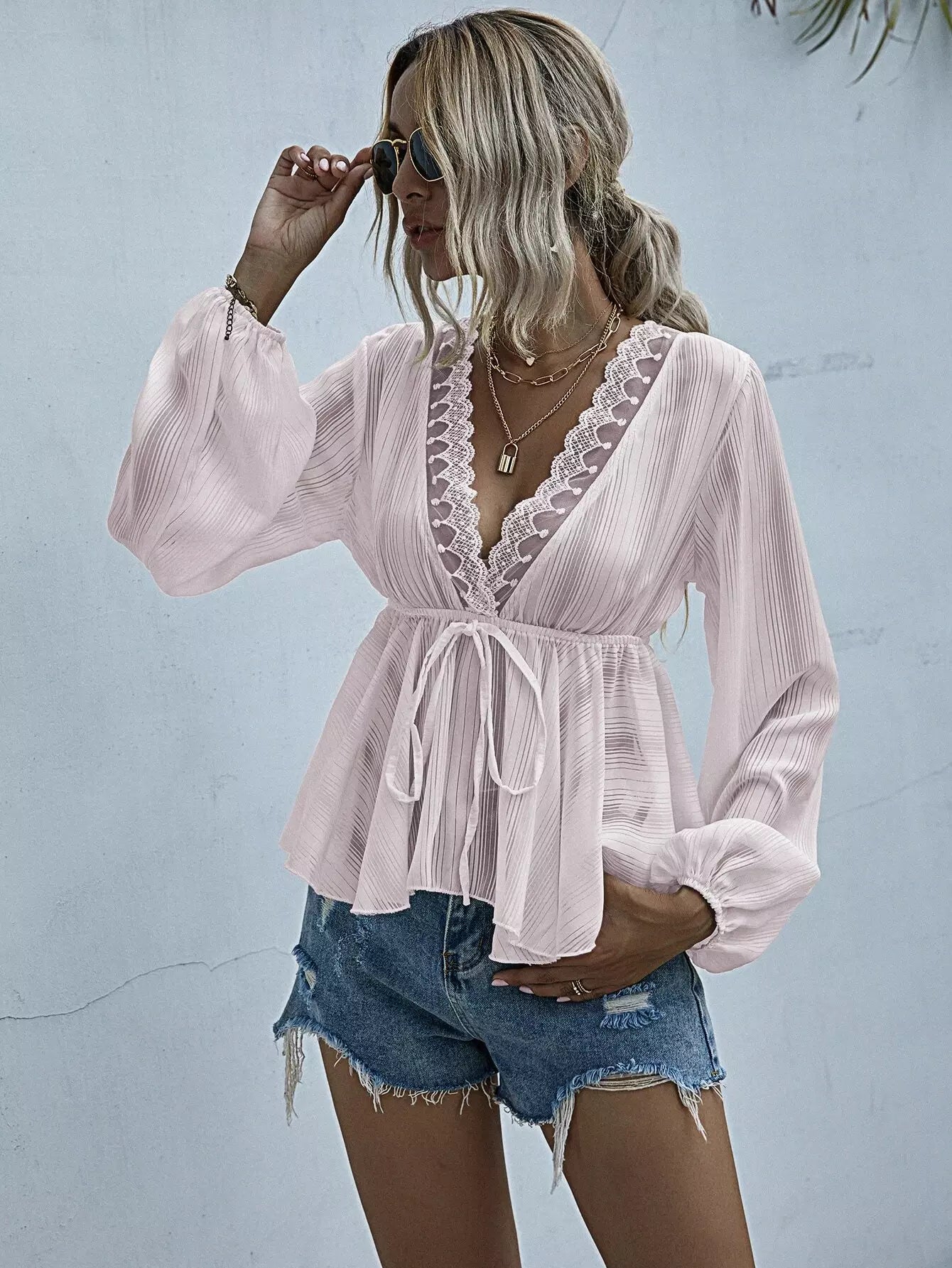 Lace Trim Knot Front Peplum Blouse