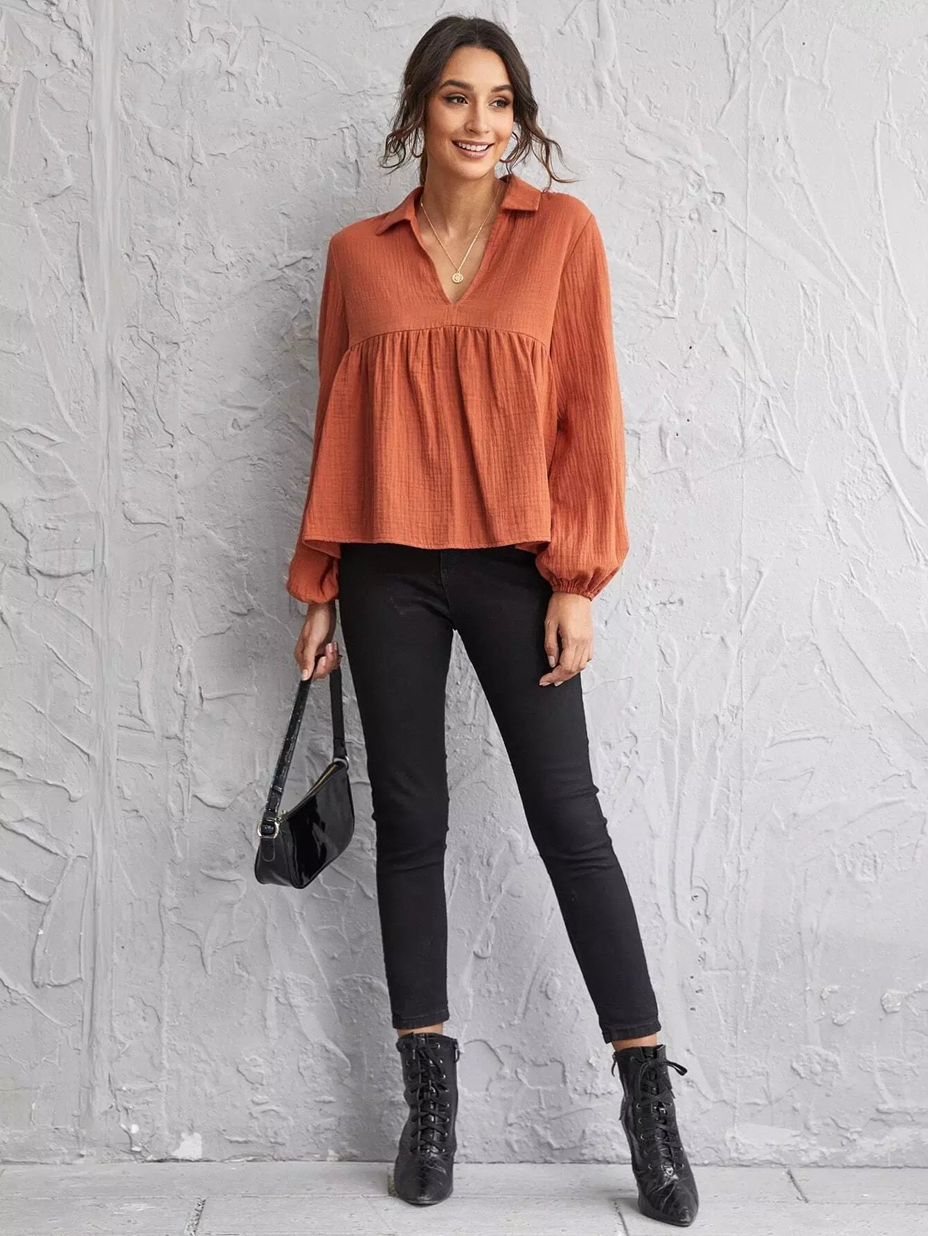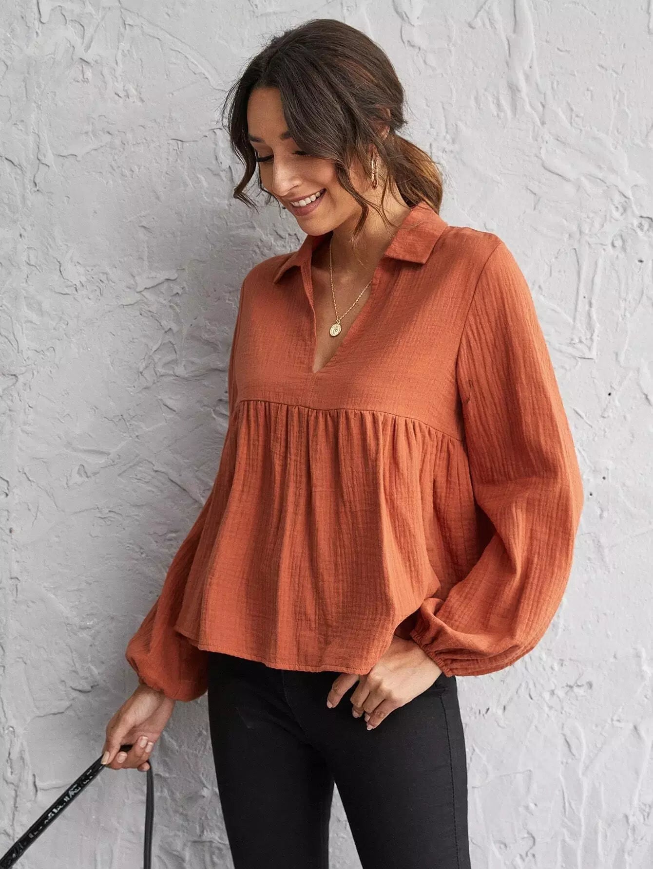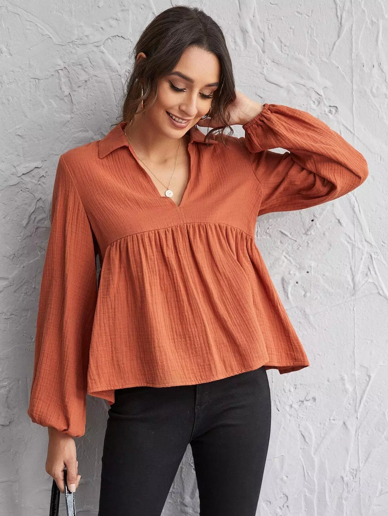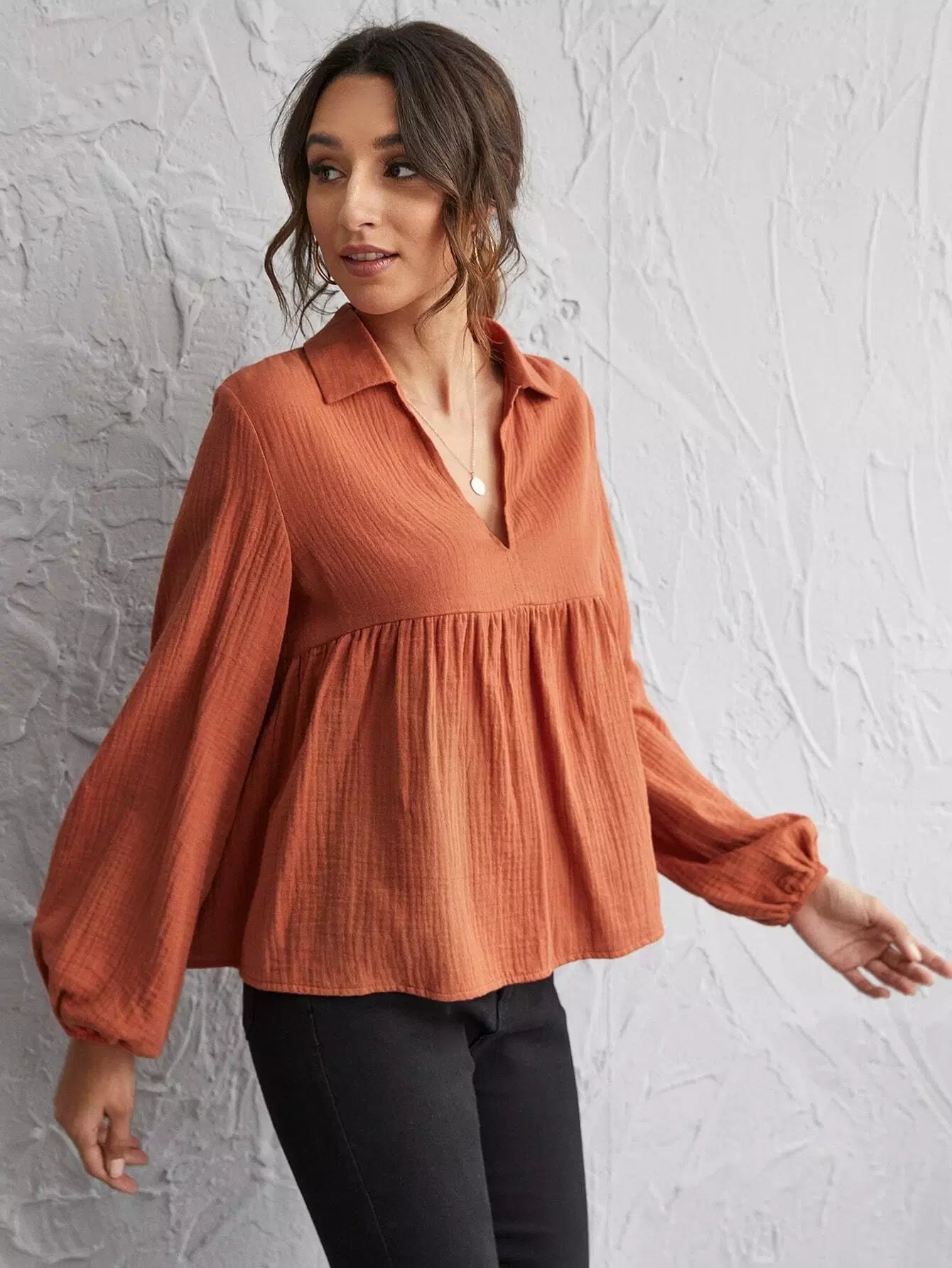Lantern Sleeve Notch Neck Smock Top