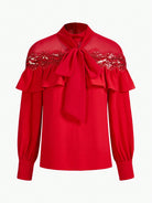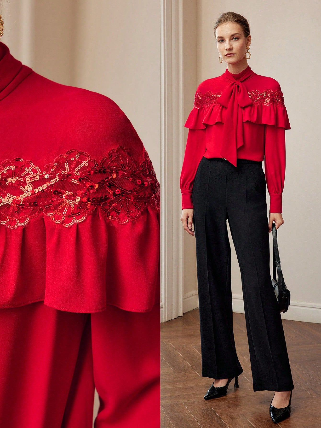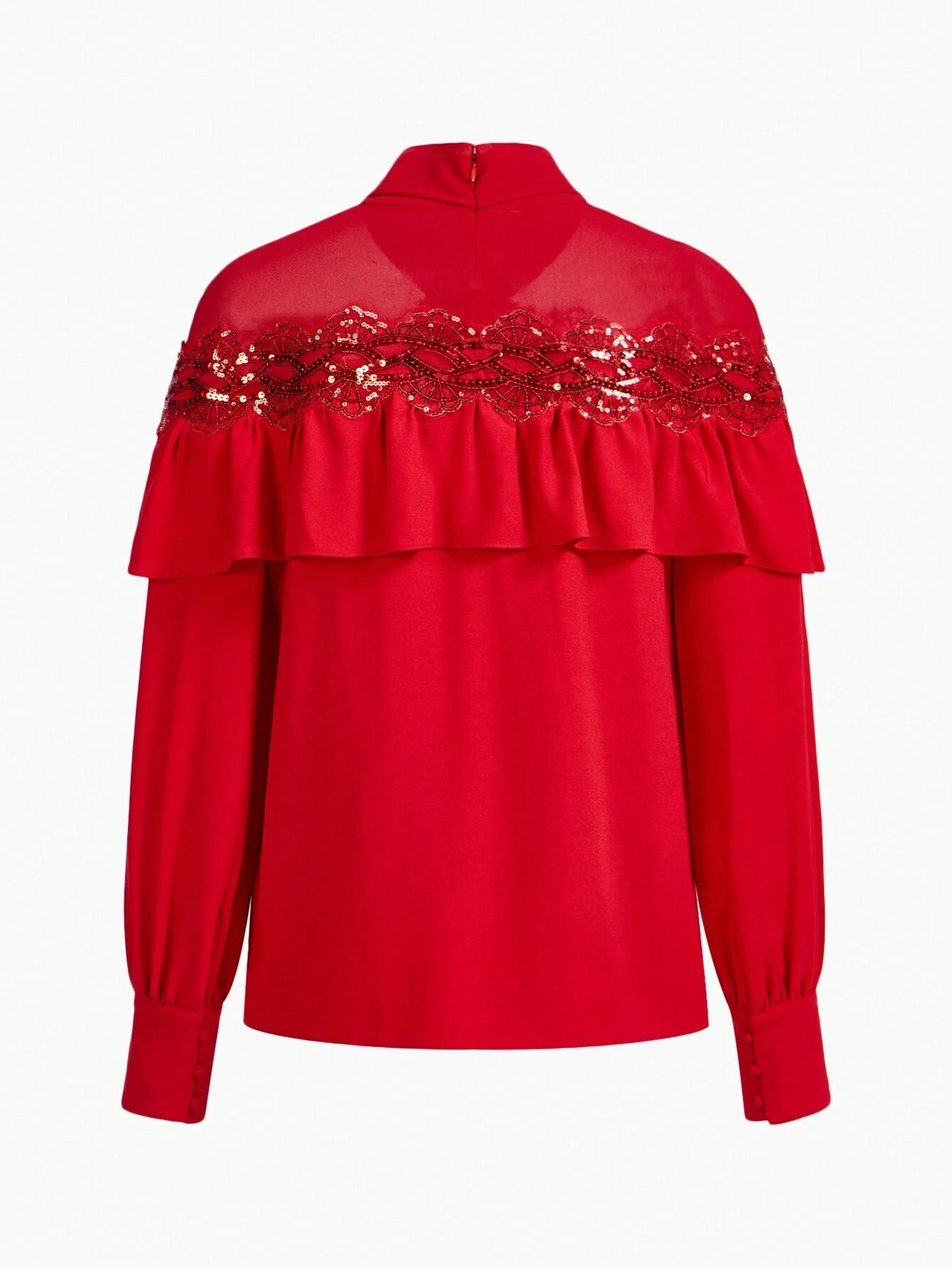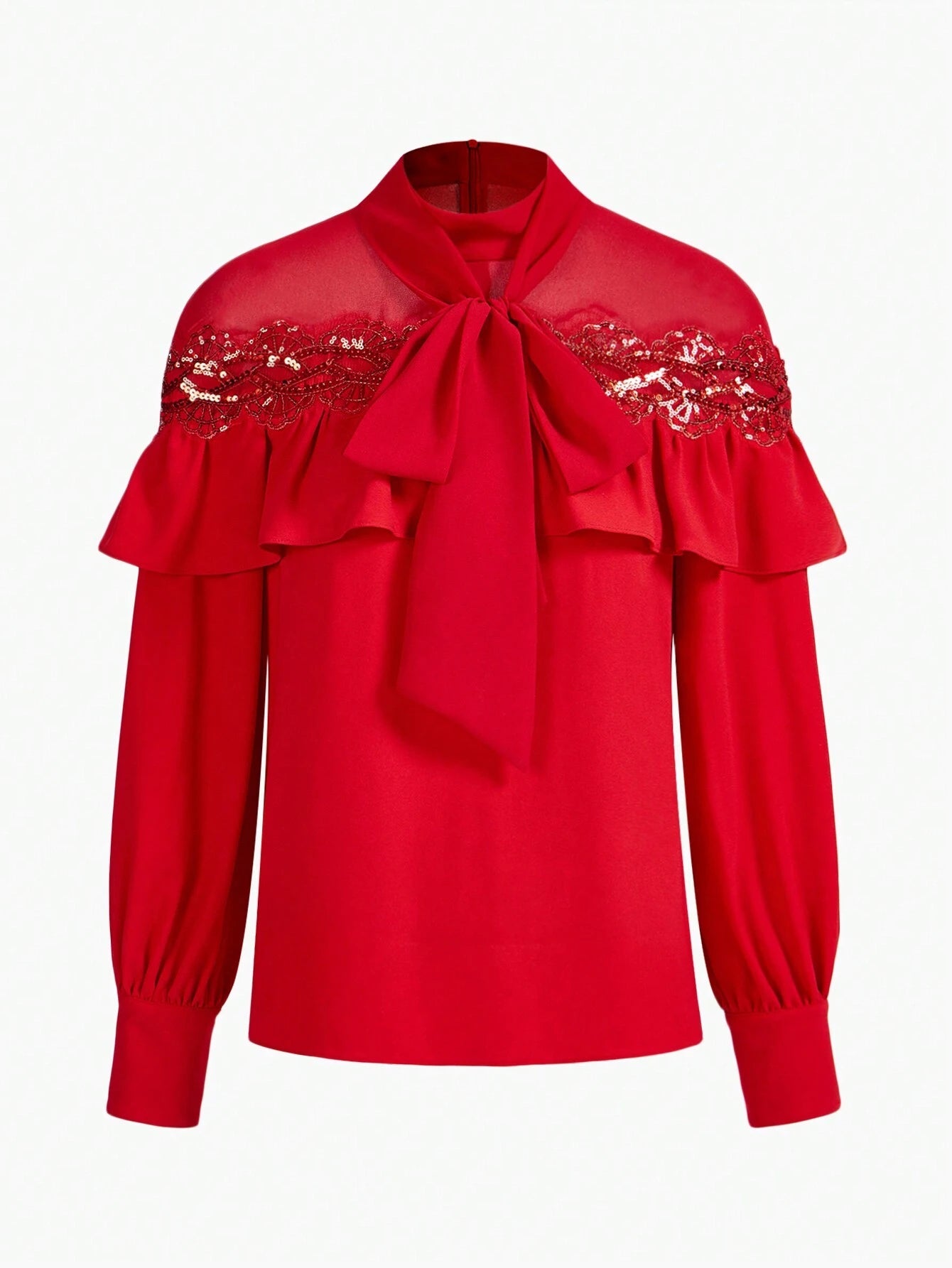 MOTF PREMIUM TIE NECK SEQUIN DETAIL RUFFLE TRIM LANTERN SLEEVE BLOUSE
