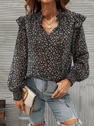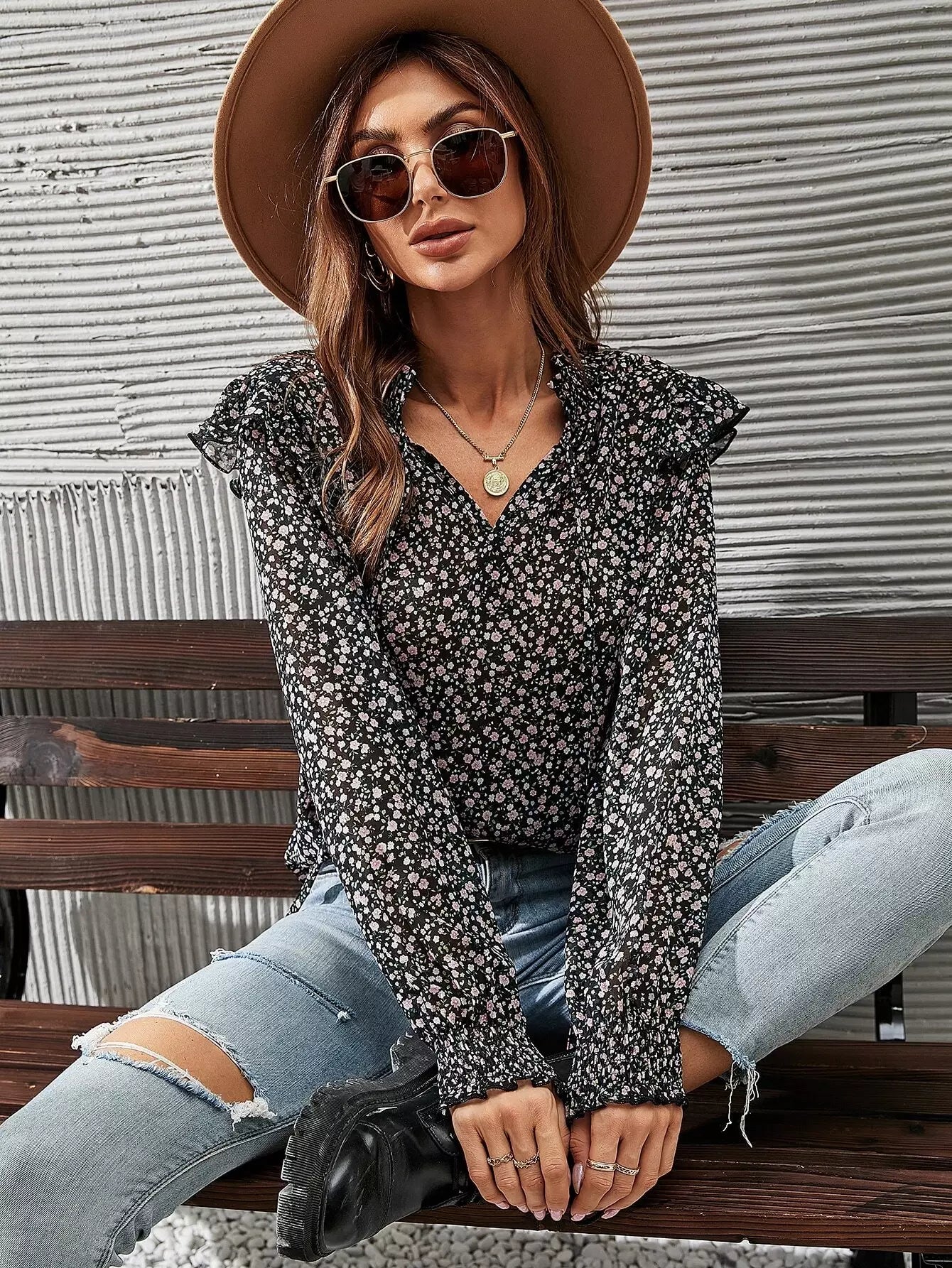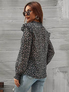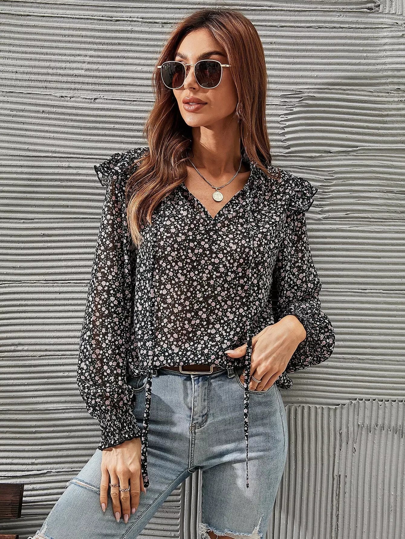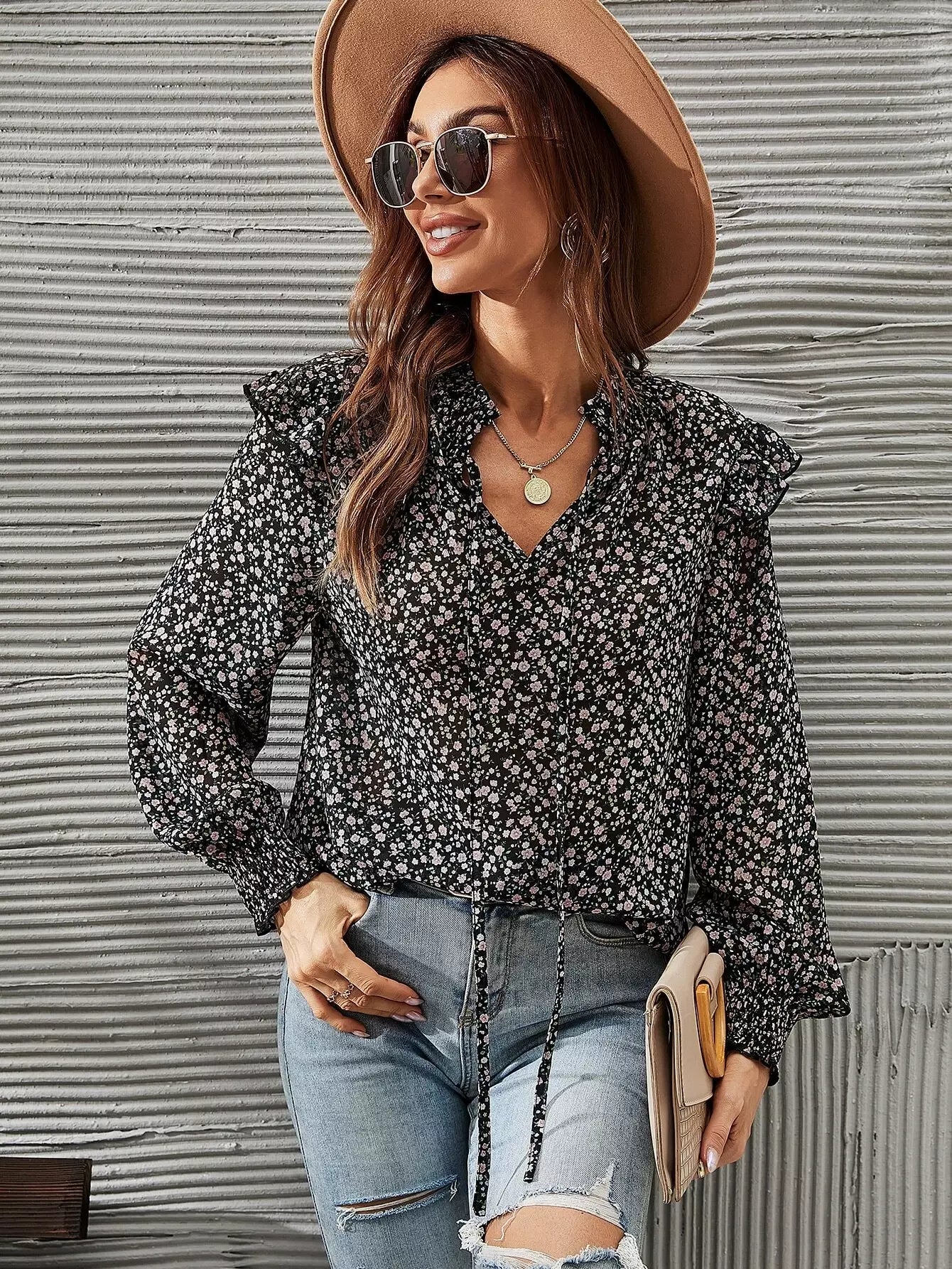 Notched Neck Ditsy Floral Lantern Sleeve Blouse