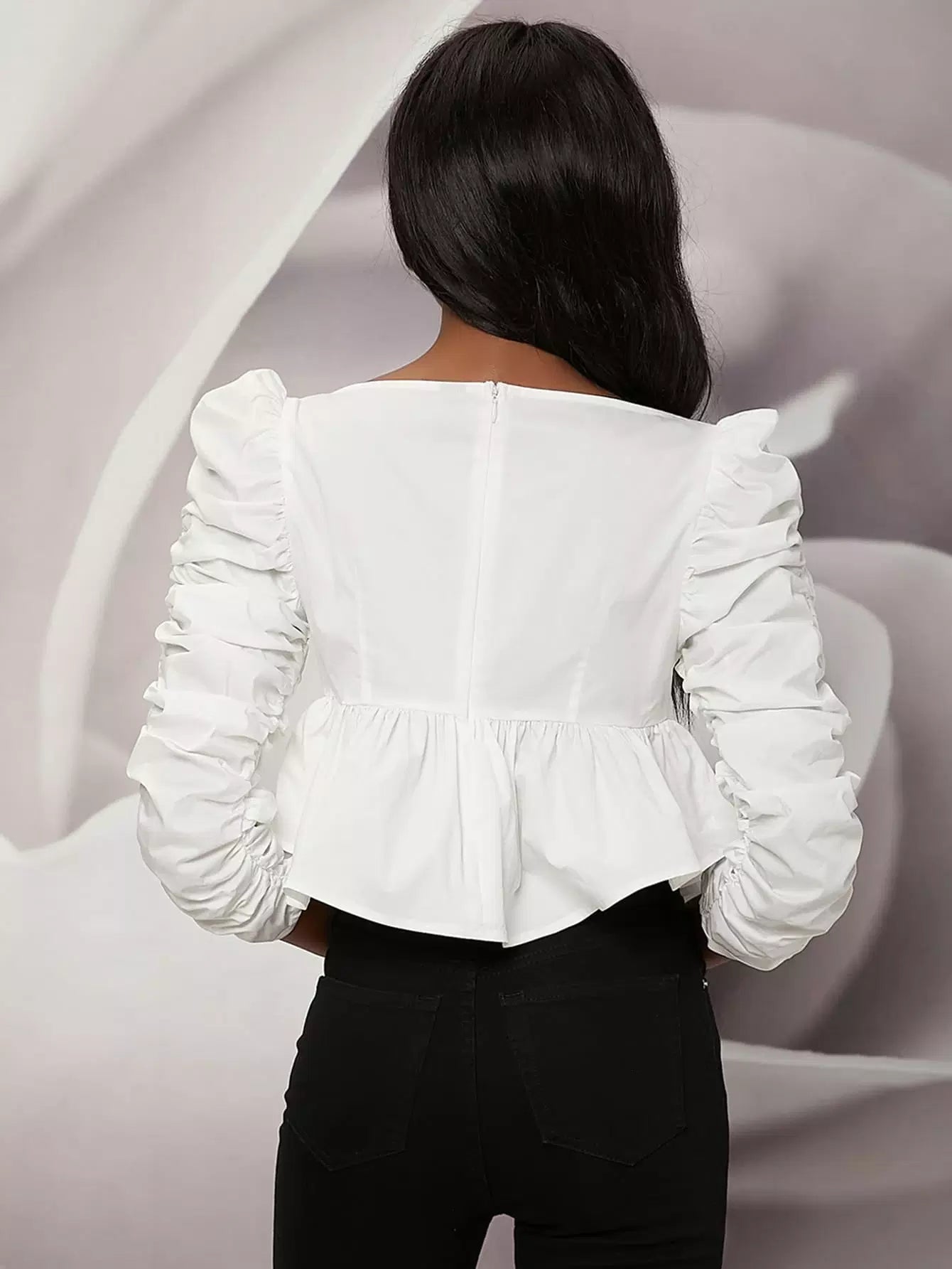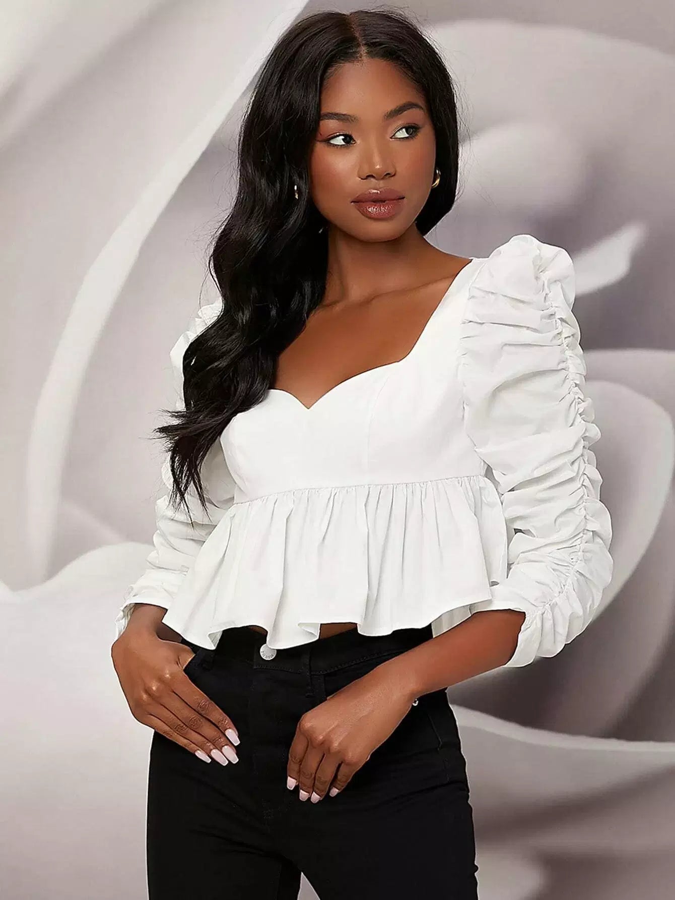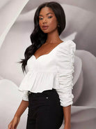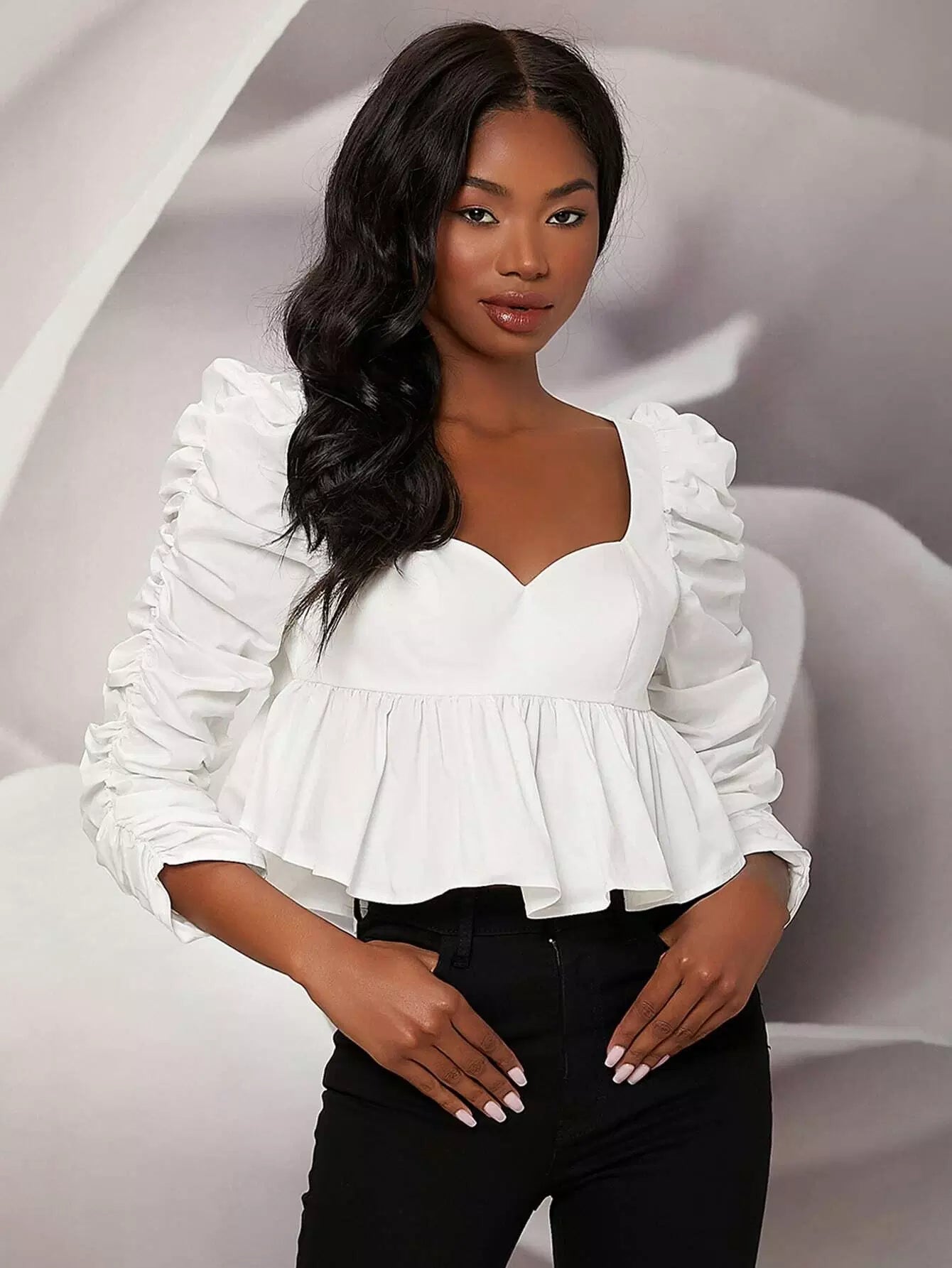 Peplum Hem Ruched Puff Sleeve Sweetheart Neck Top