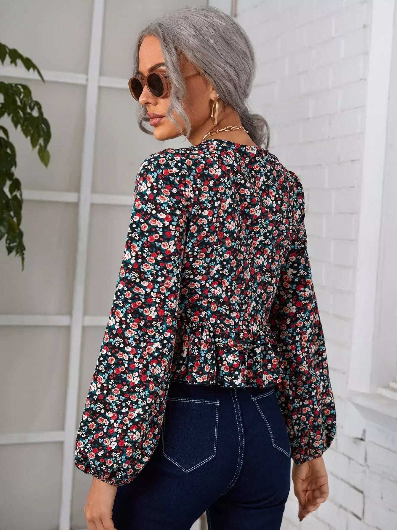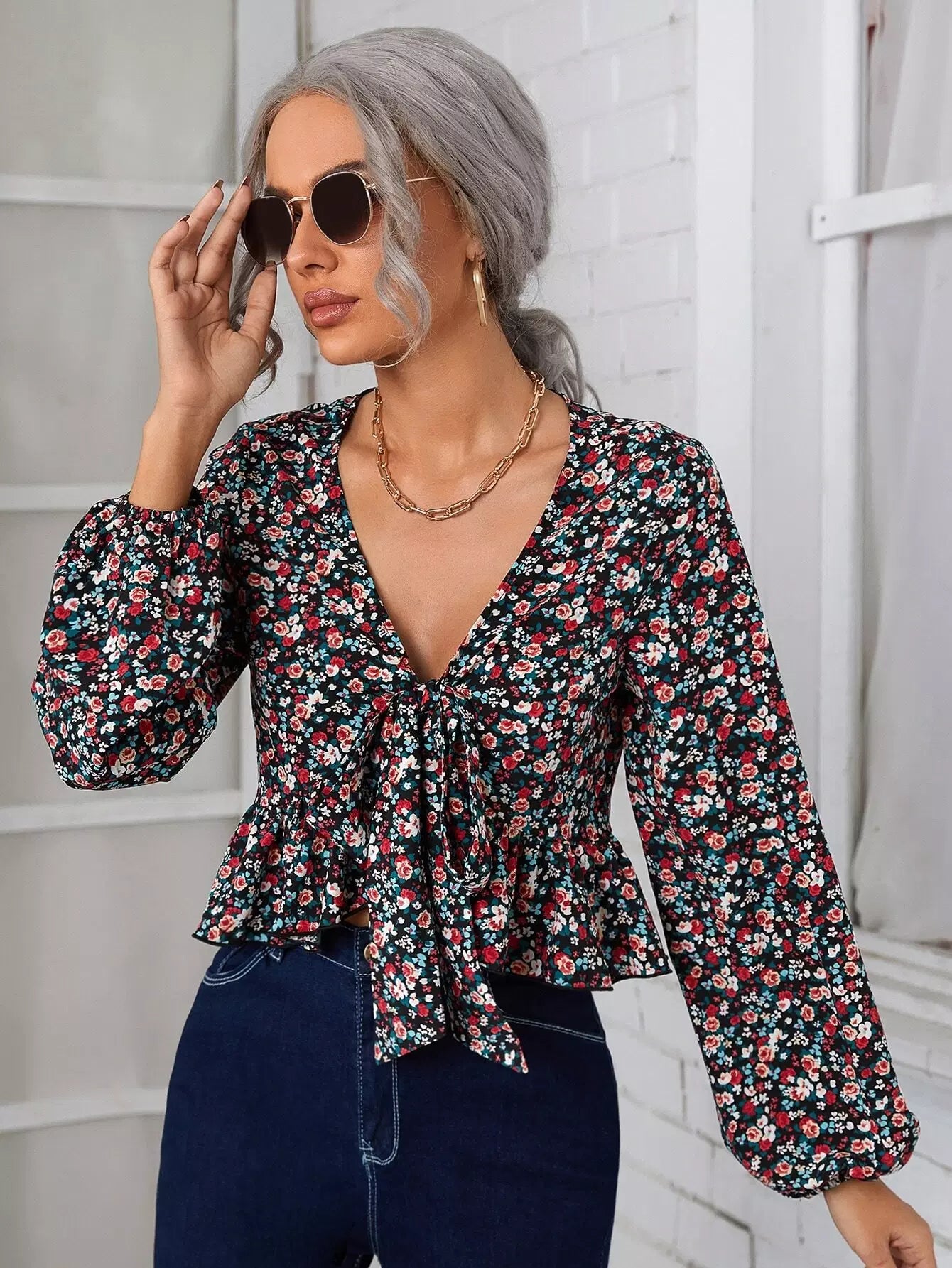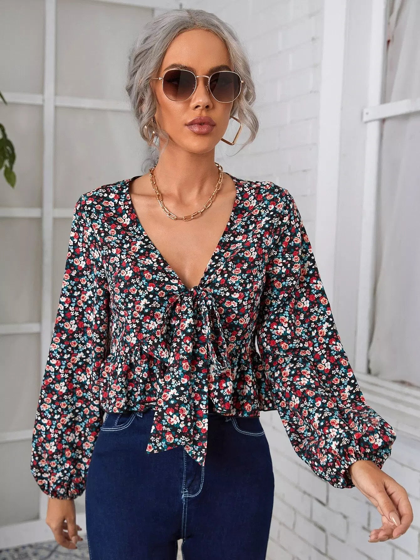 Plunging Neck Ditsy Floral Knot Front Ruffle Hem Top