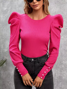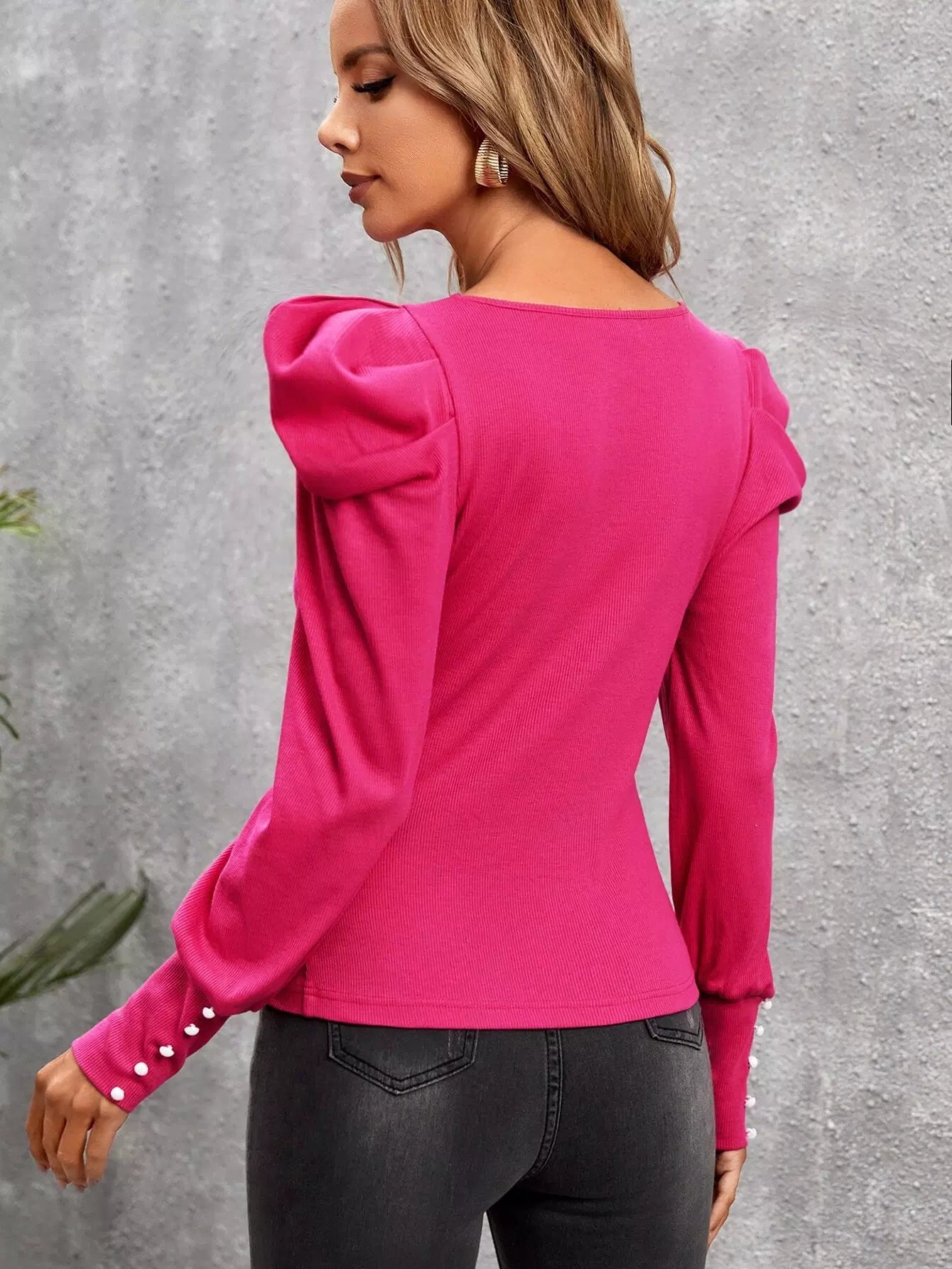 Puff Sleeve Pearls Detail Rib Knit Tee