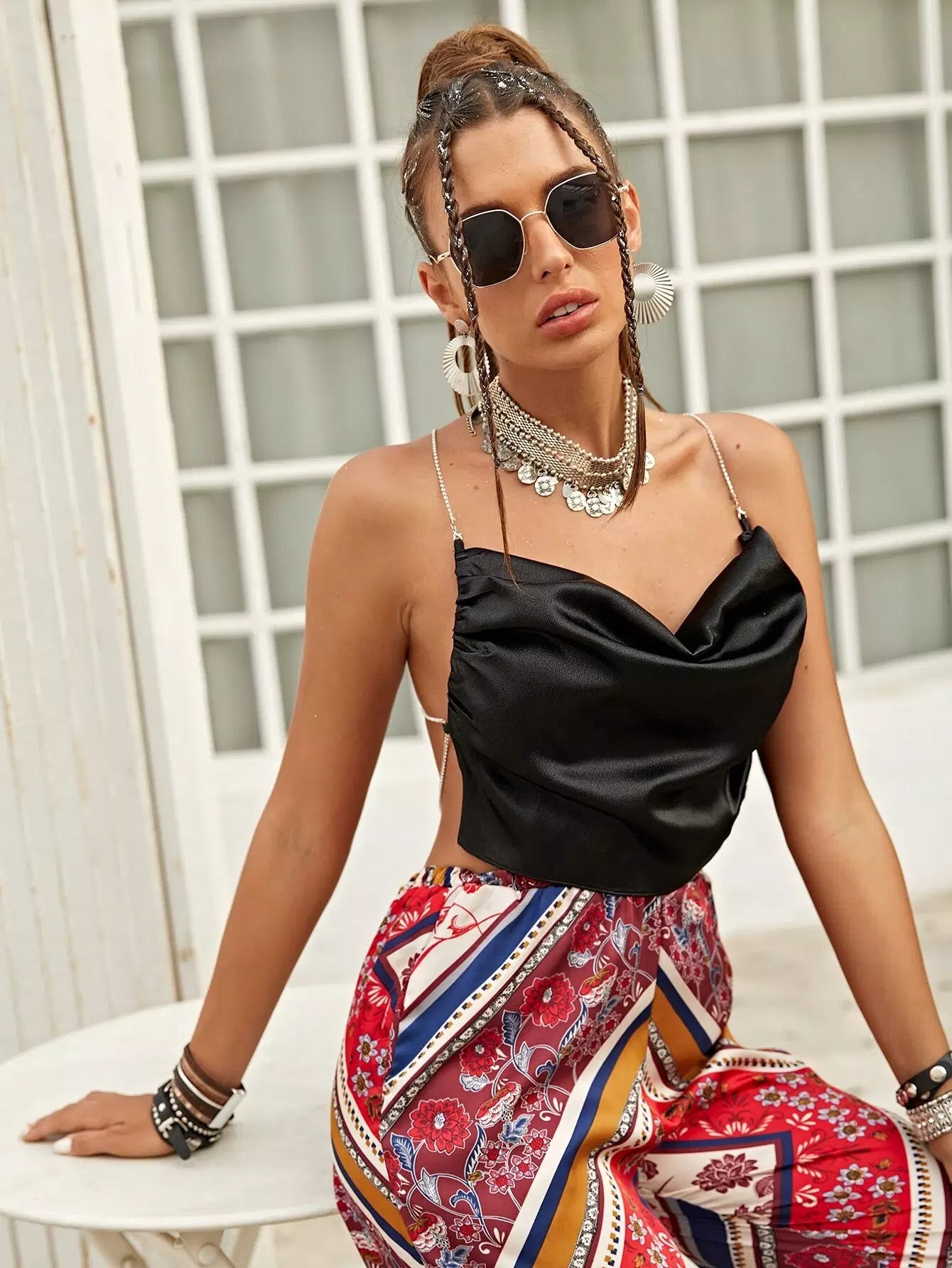 Rhinestone Crisscross Backless Cowl Neck Cami Top