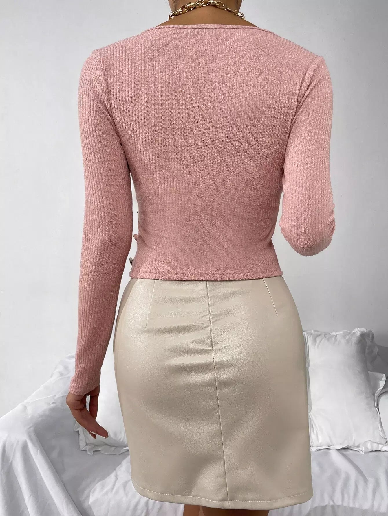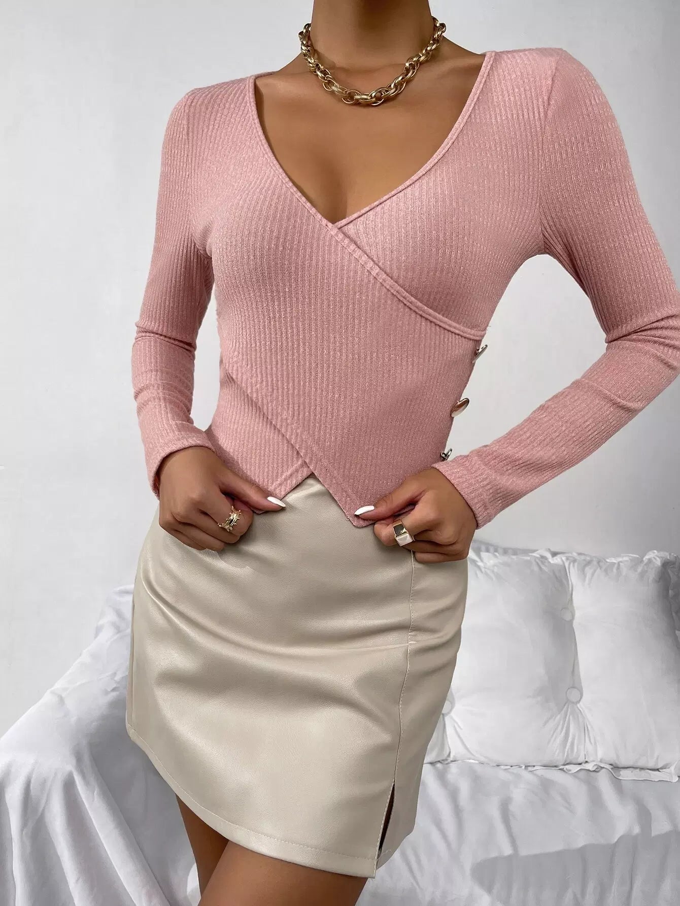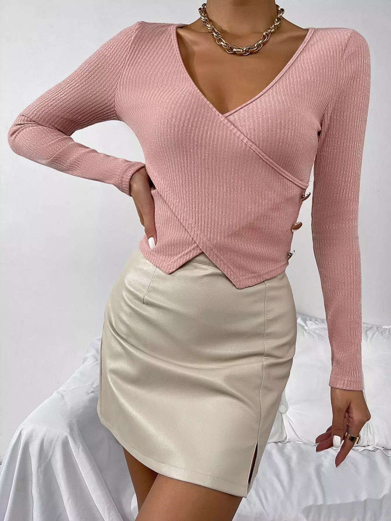 Ribbed Knit Cross Wrap Front Button Detail Tee