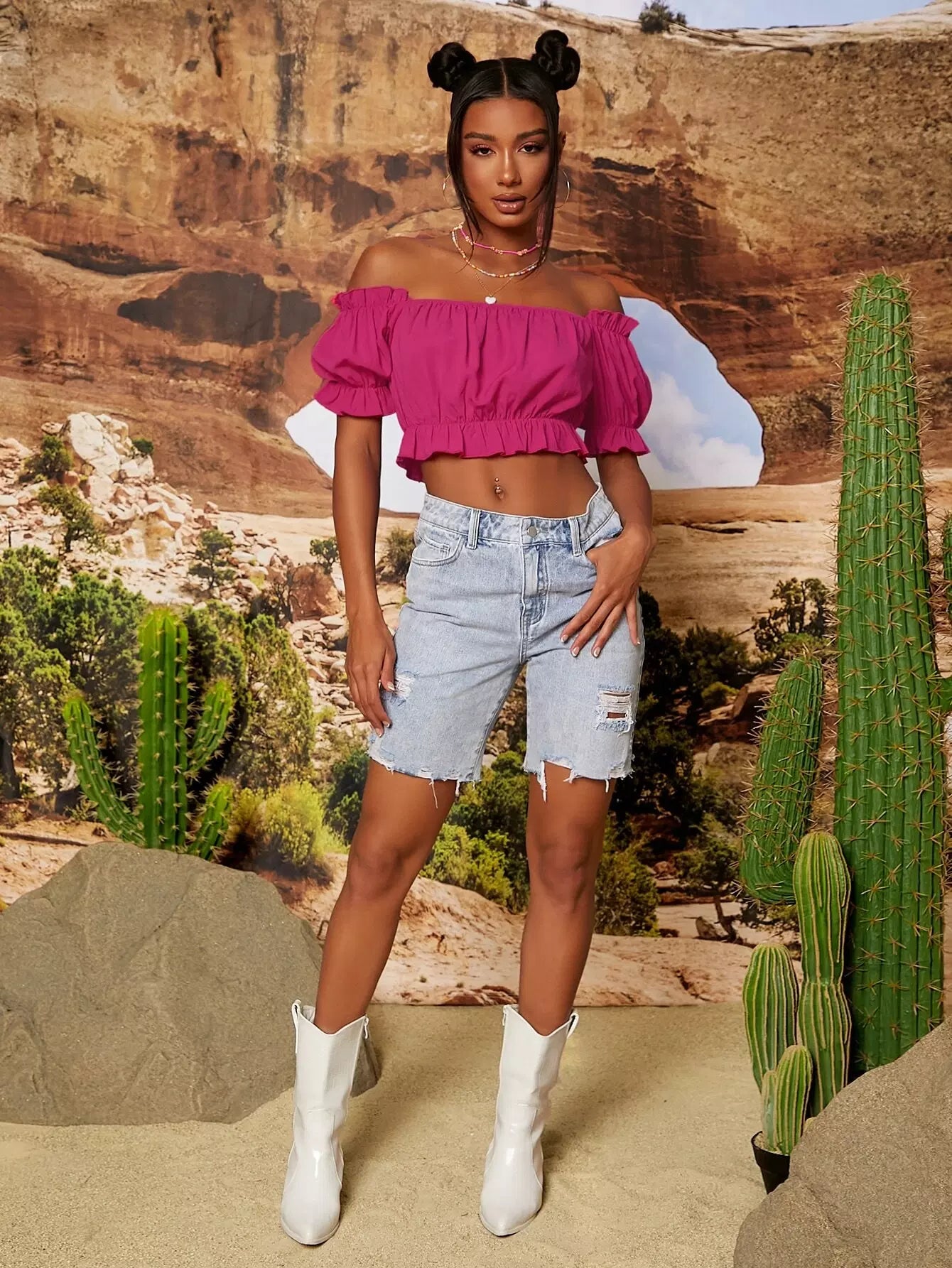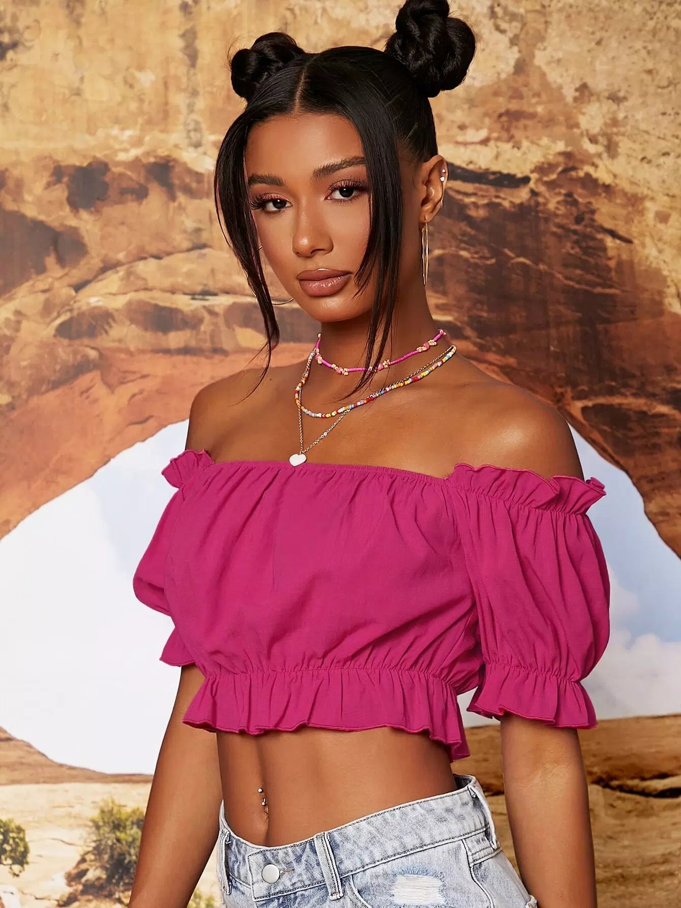 Ruched Bust Ruffle Hem Off Shoulder Top