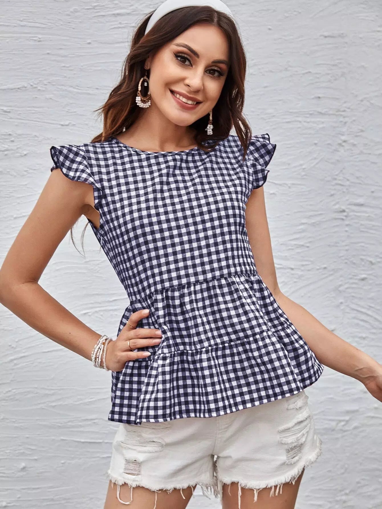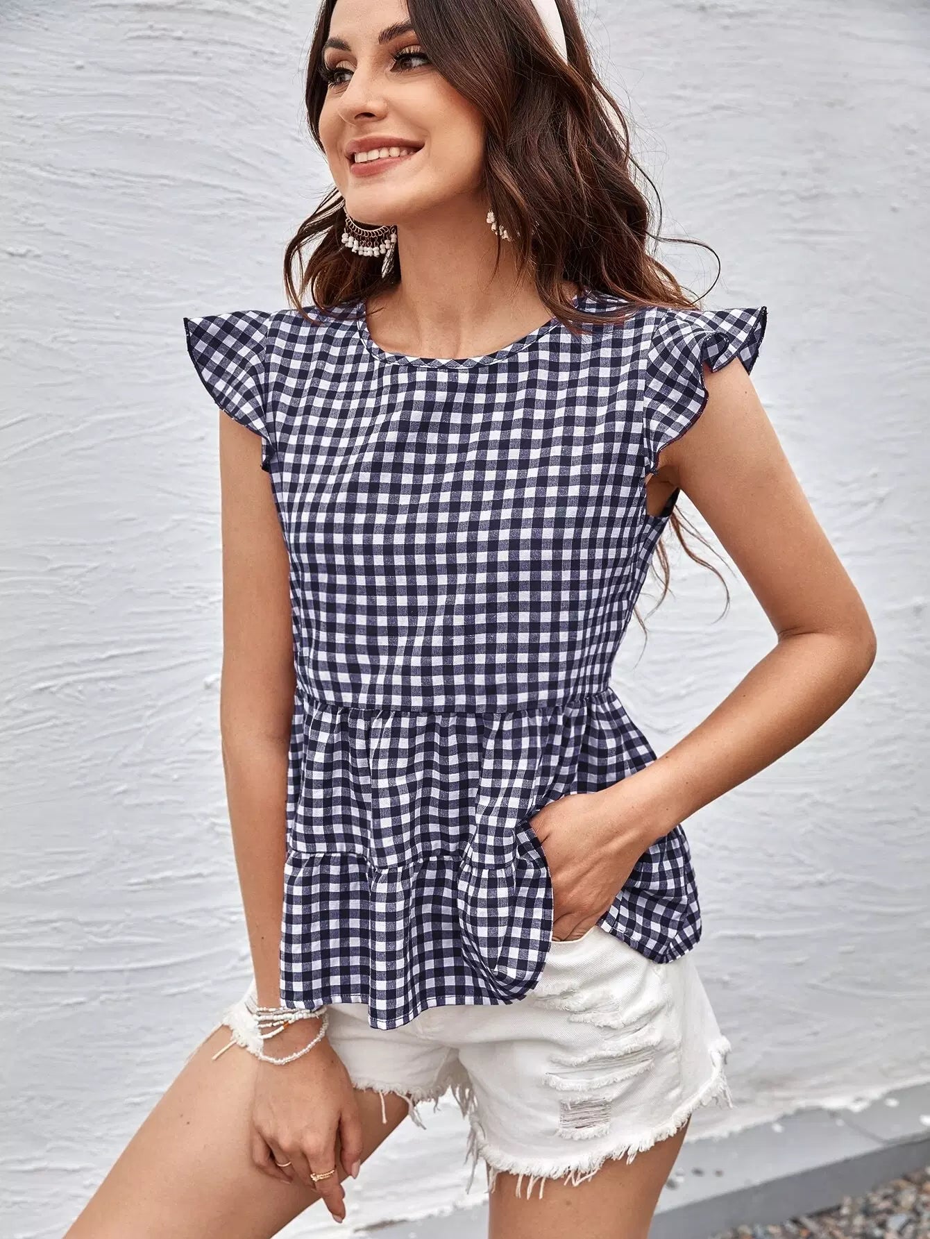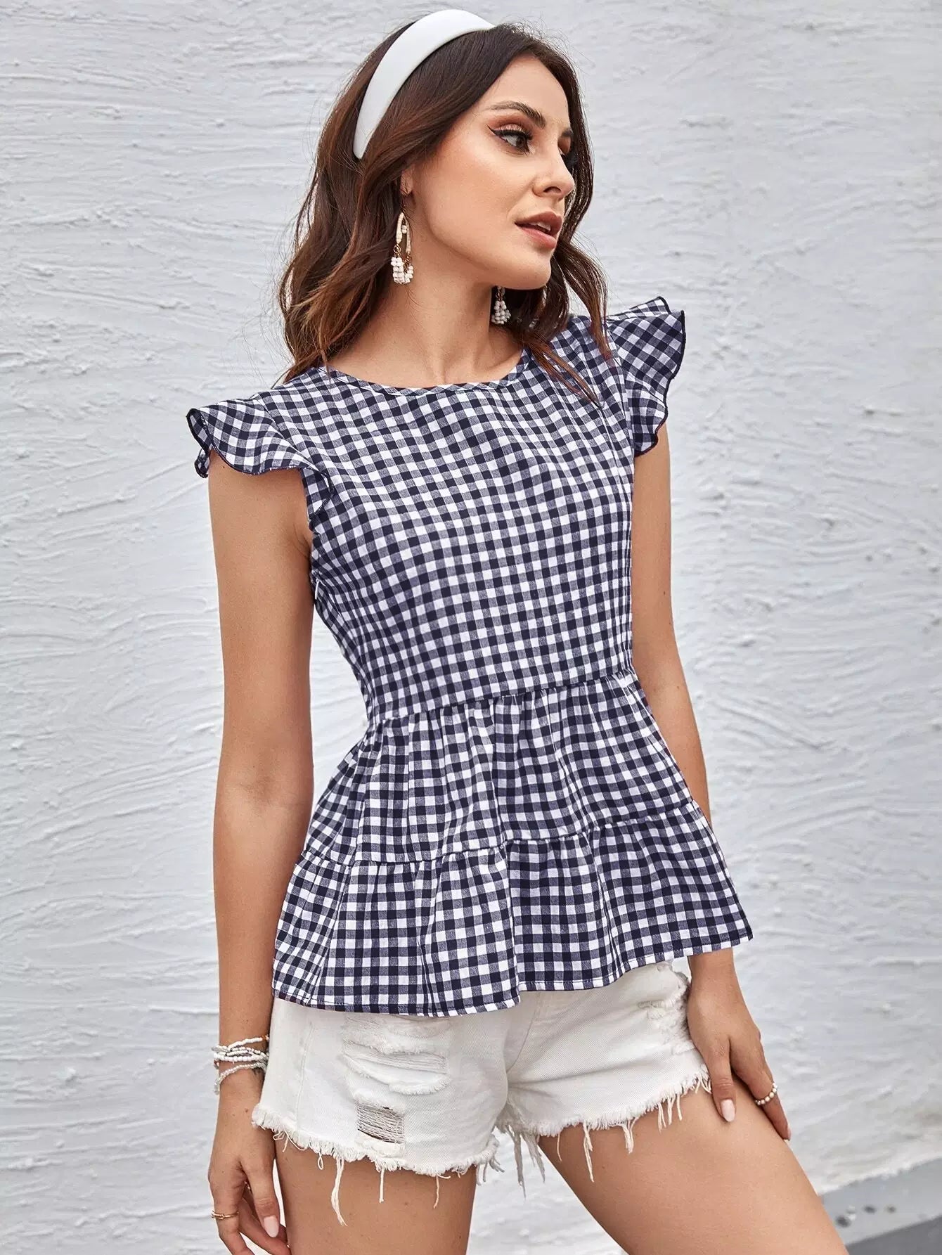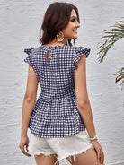 Ruffle Trim Gingham Peplum Top