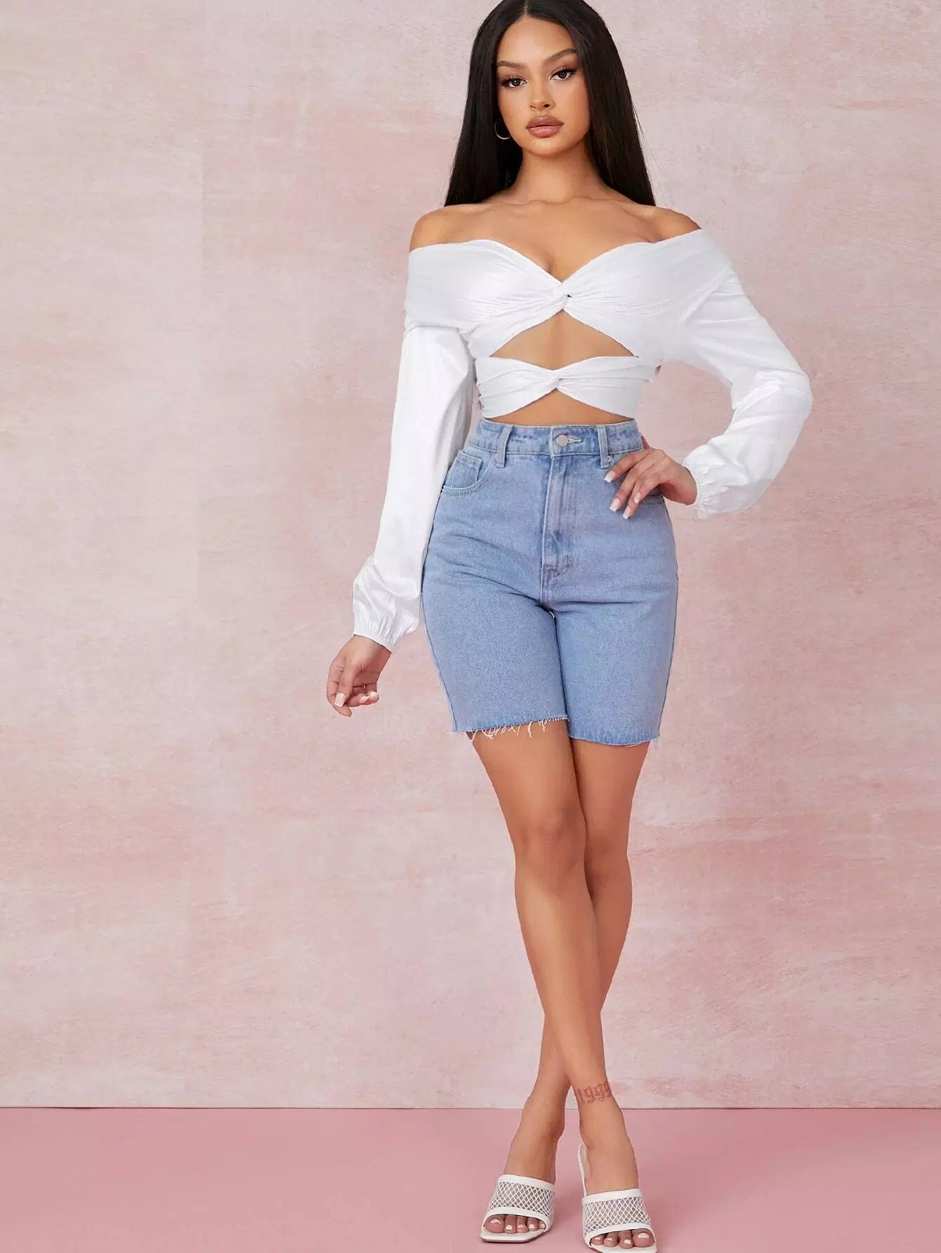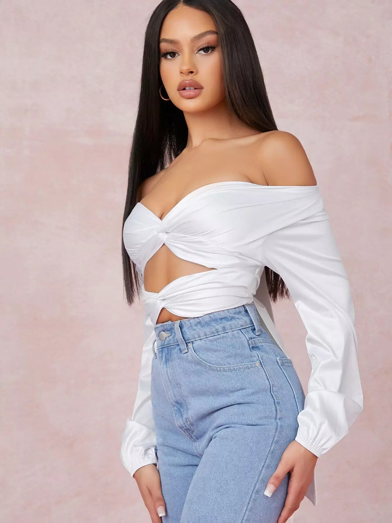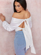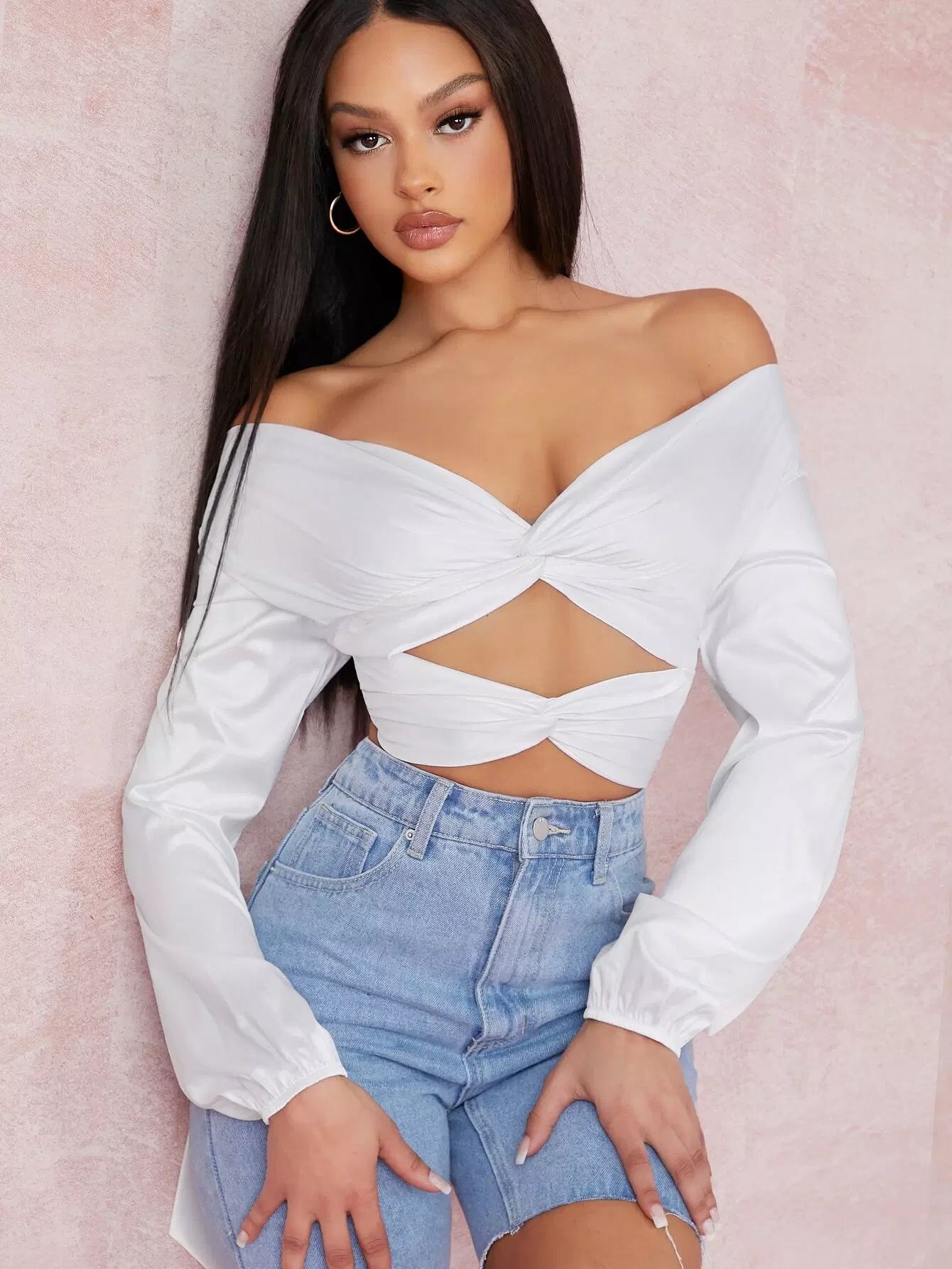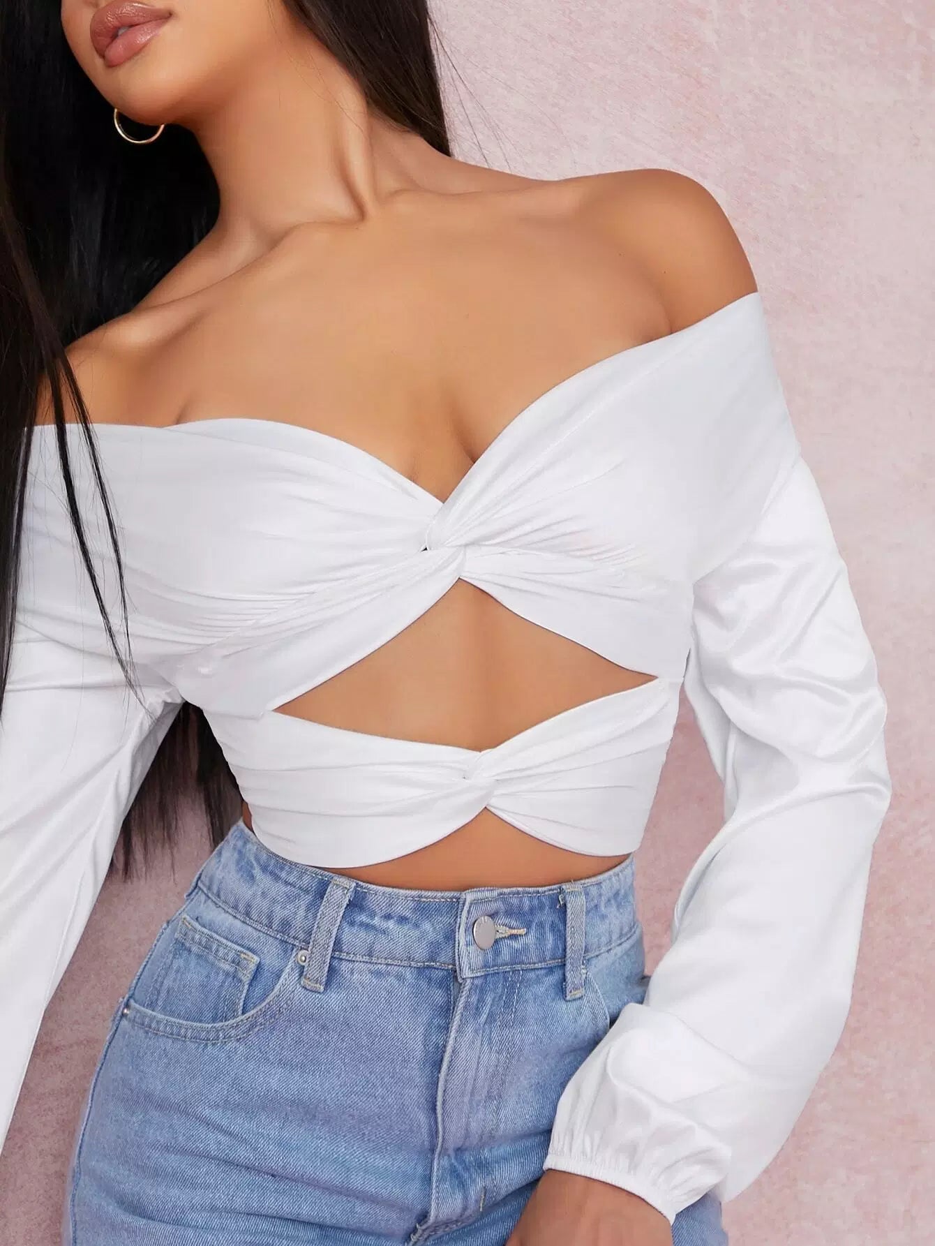 Satin Twist-Hem Cutout Off-the-Shoulder Crop Top