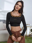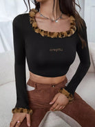 Scoop Neck Fuzzy Trim Letter Print Crop Tee