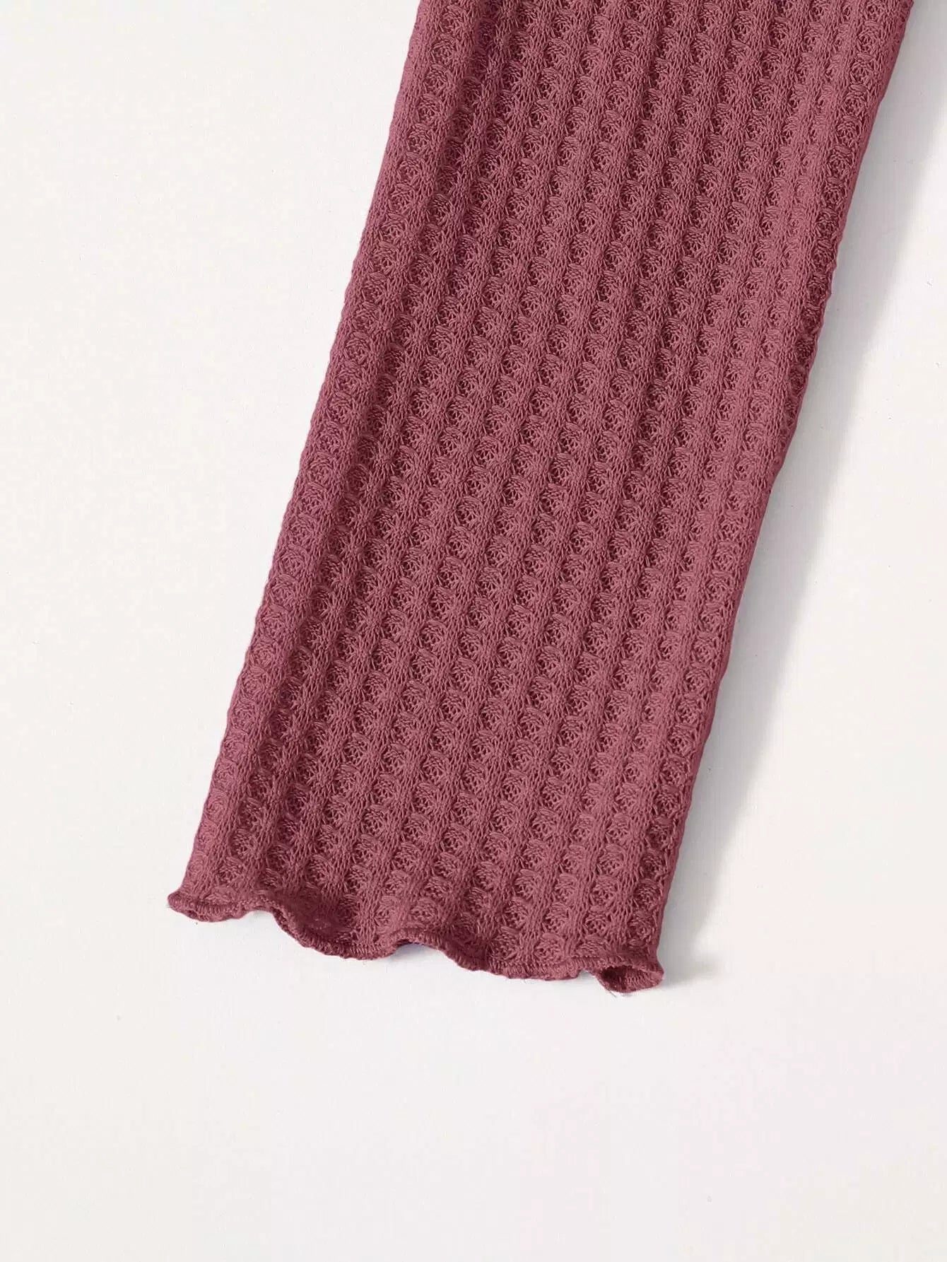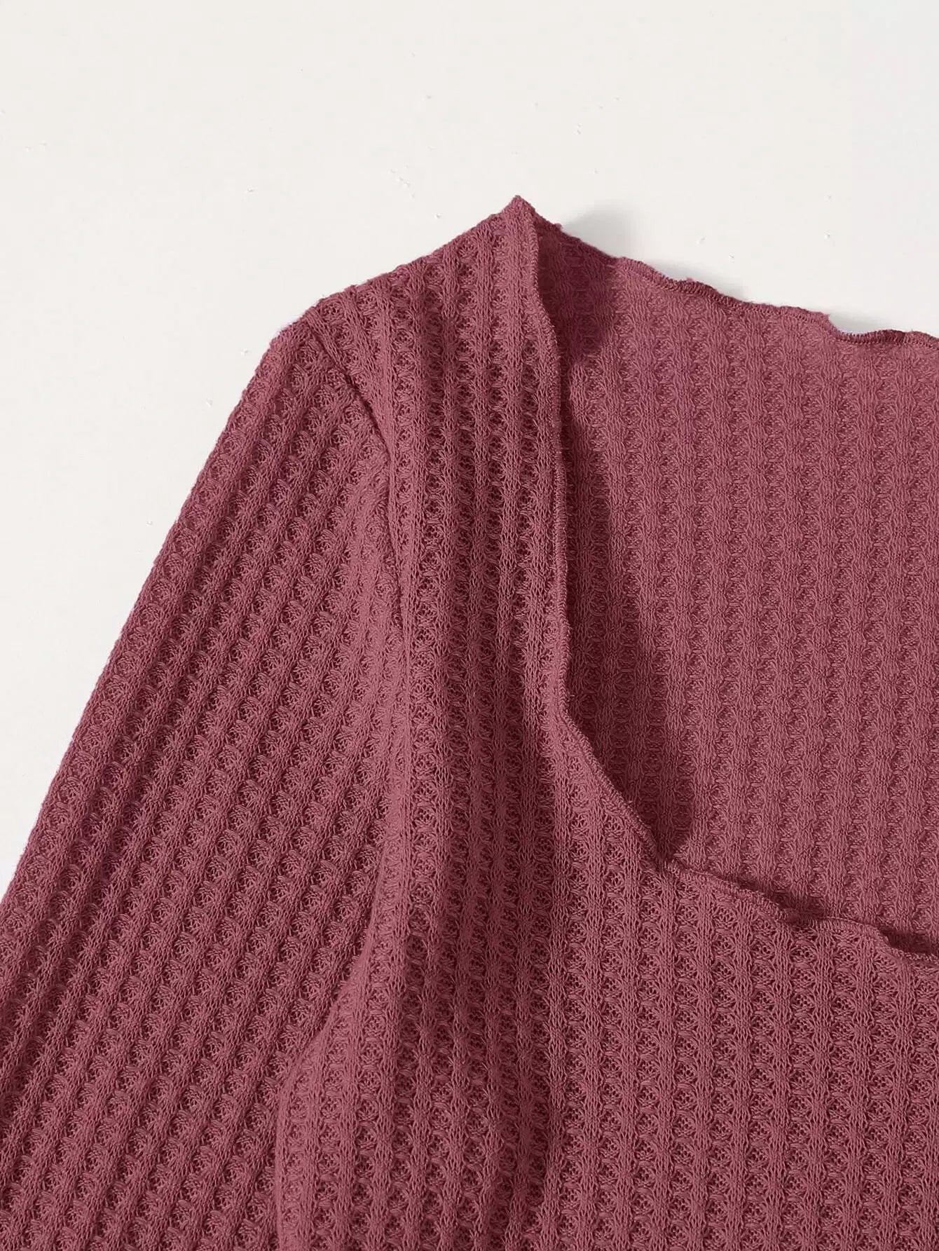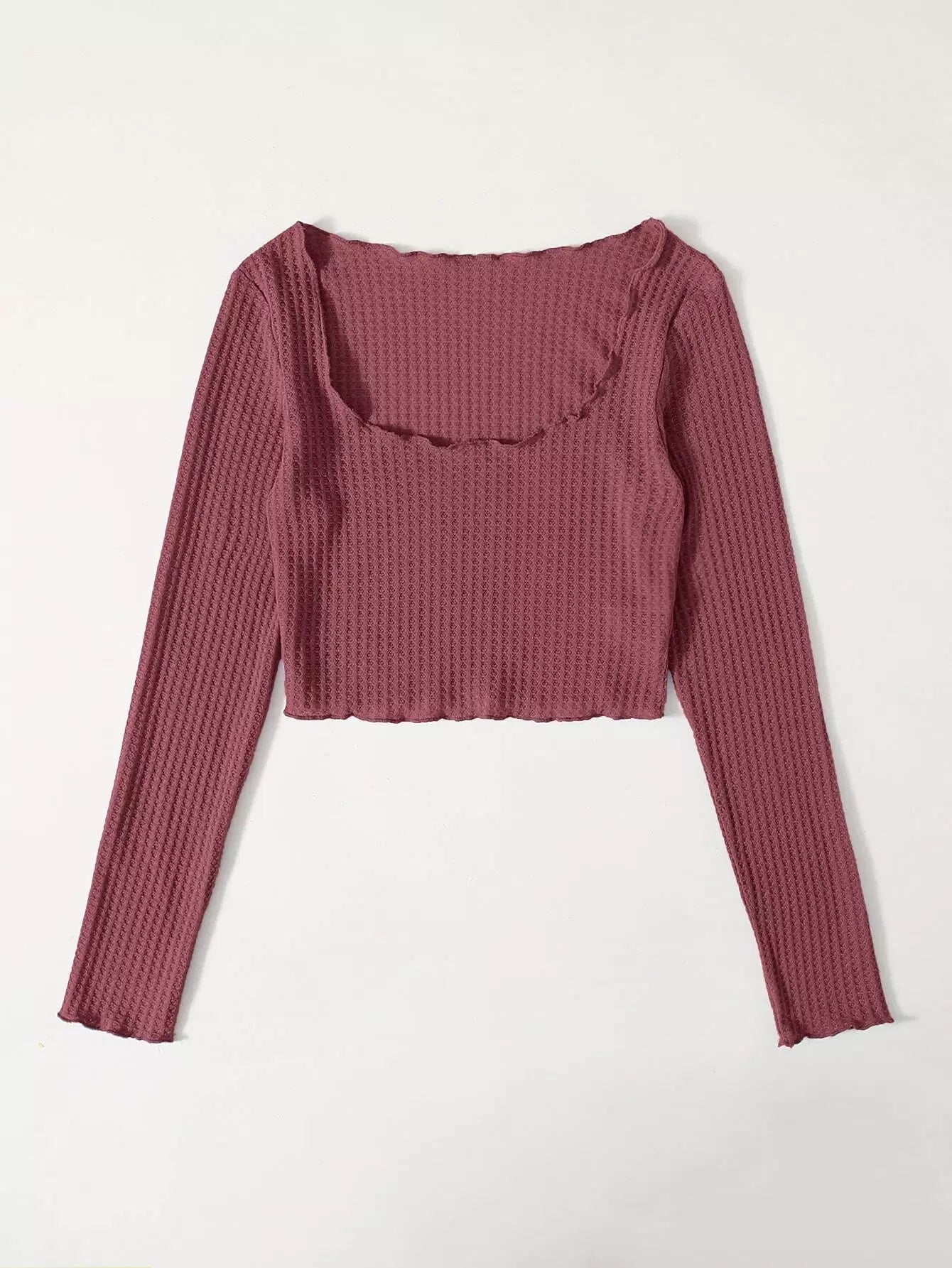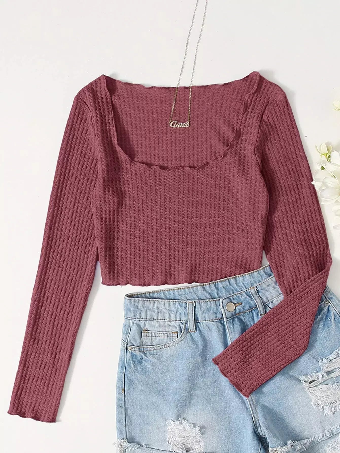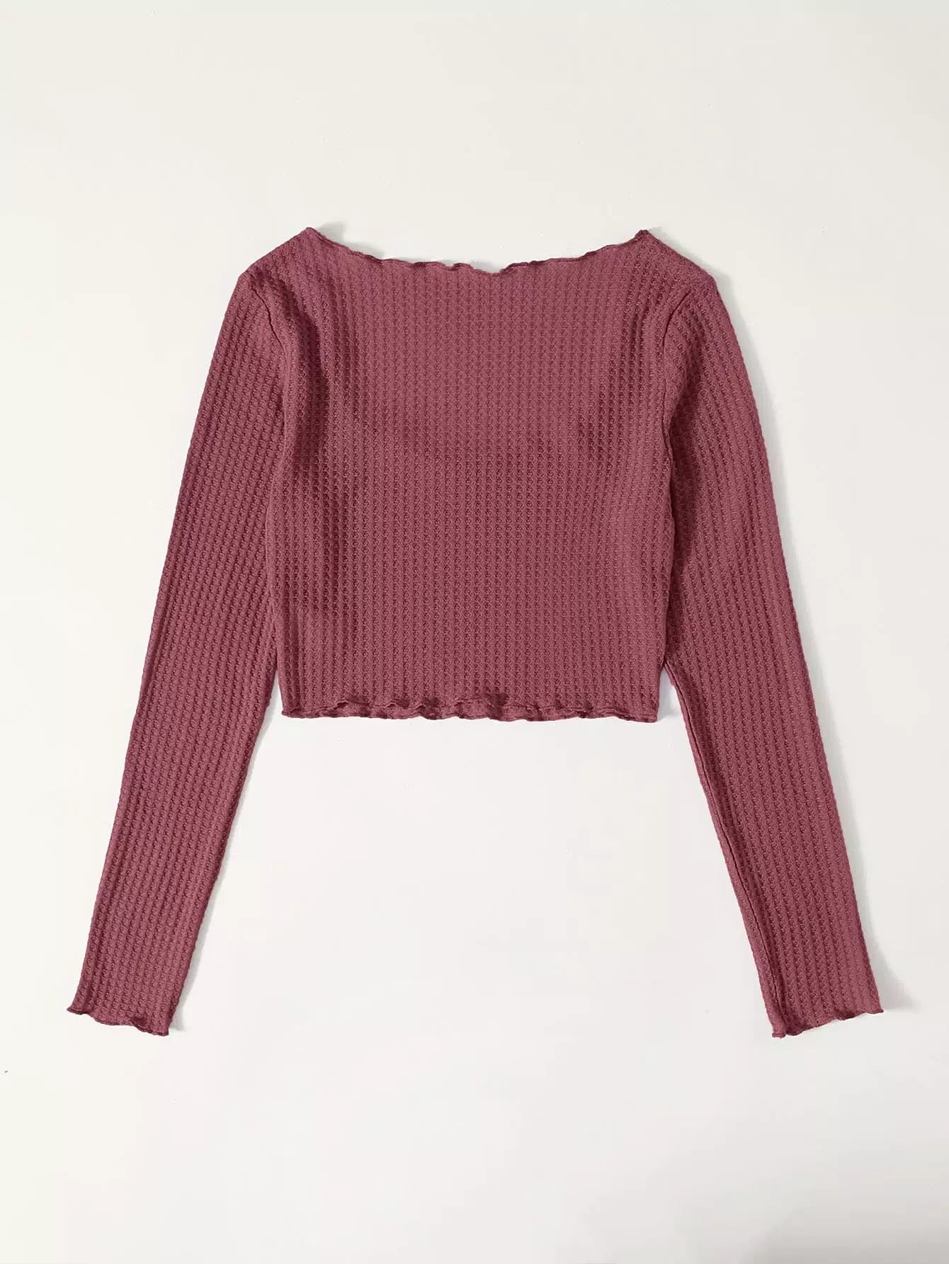 Scoop Neck Lettuce Trim Waffle Knit Top