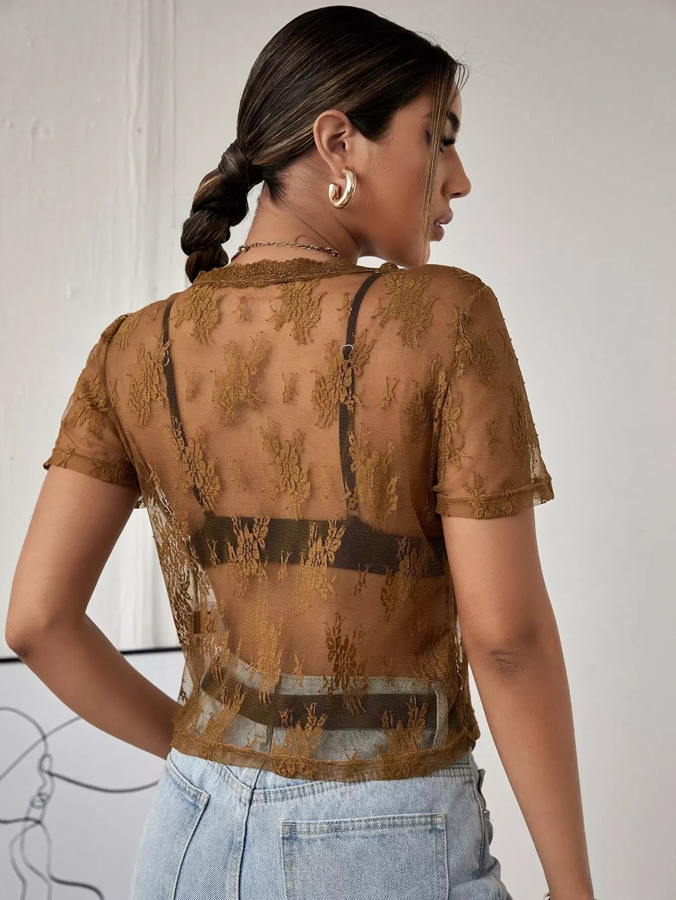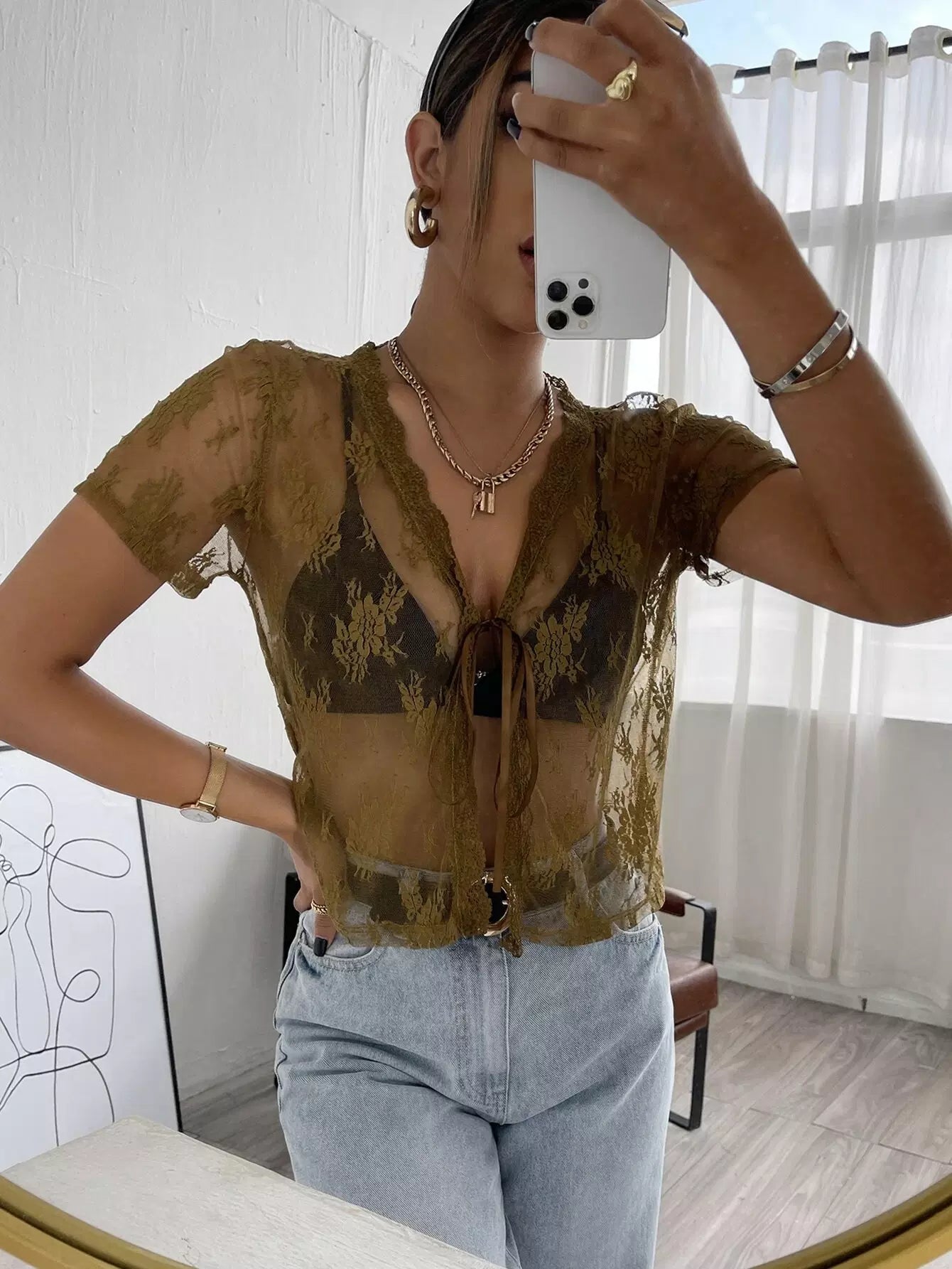 Sheer Lace Tie Front Top Without Bra