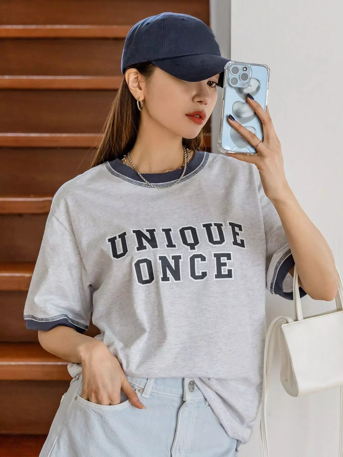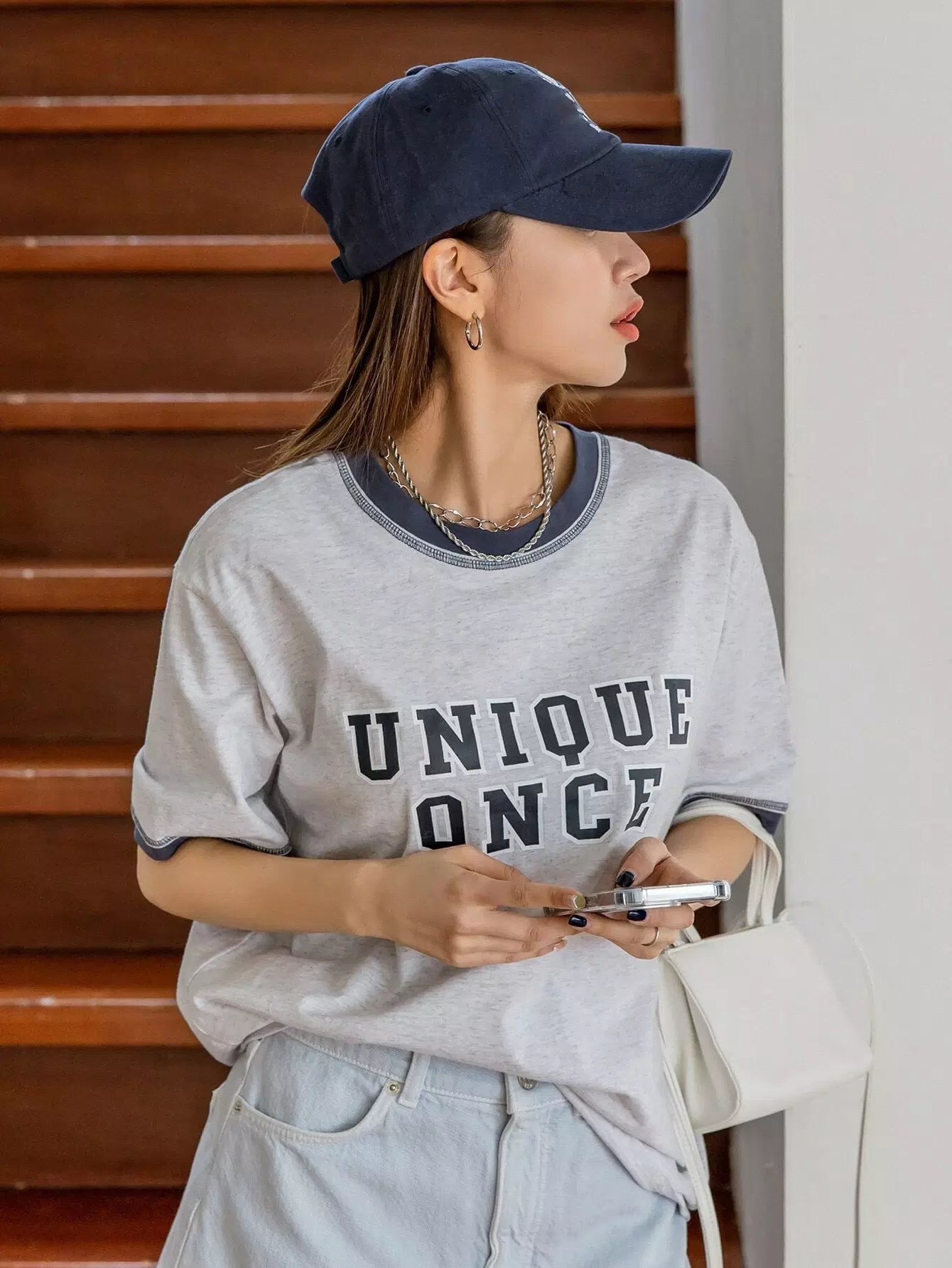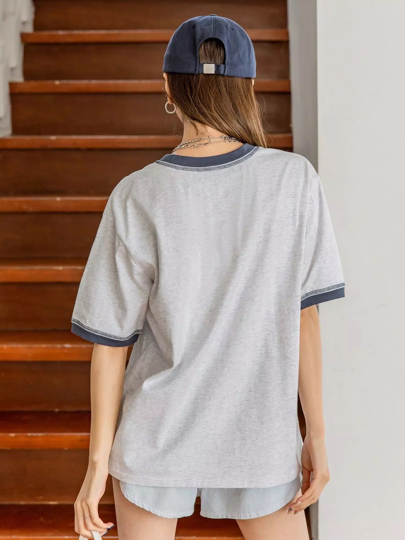 Slogan Graphic Top-stitching Contrast Trim Tee