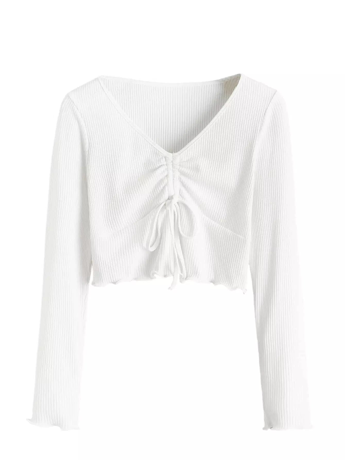 Women - Solid Drawstring Ruched Ribbed Crop Tee