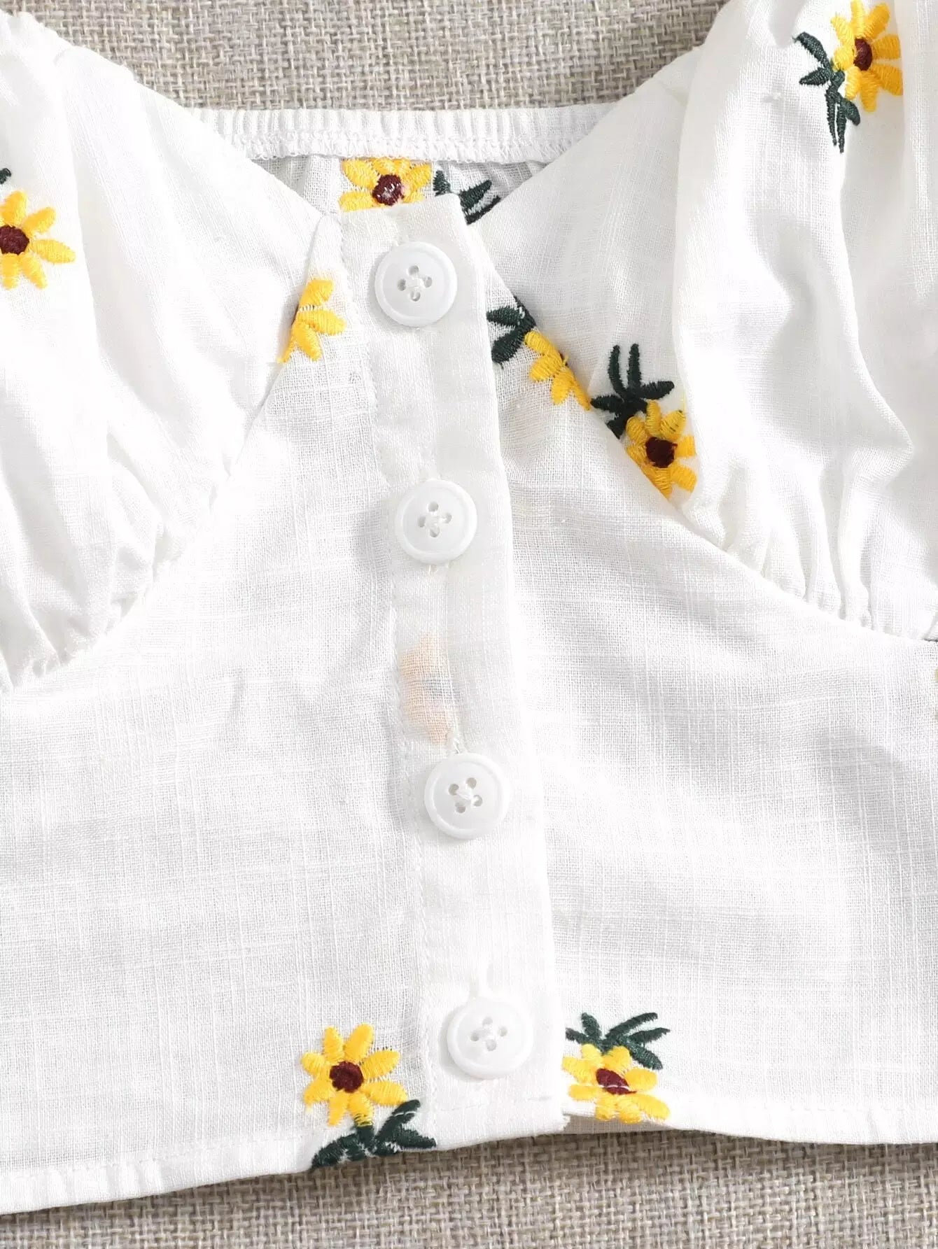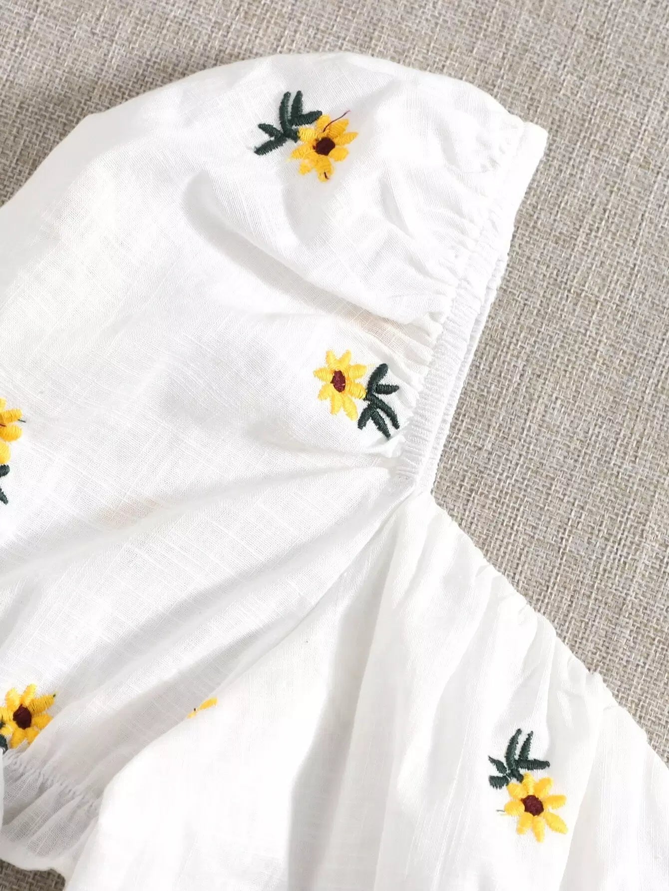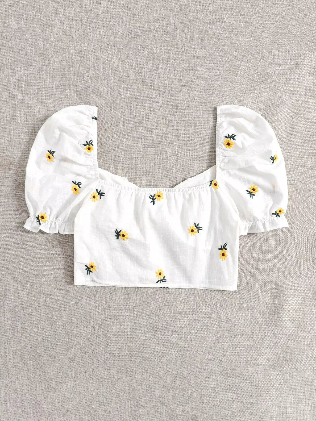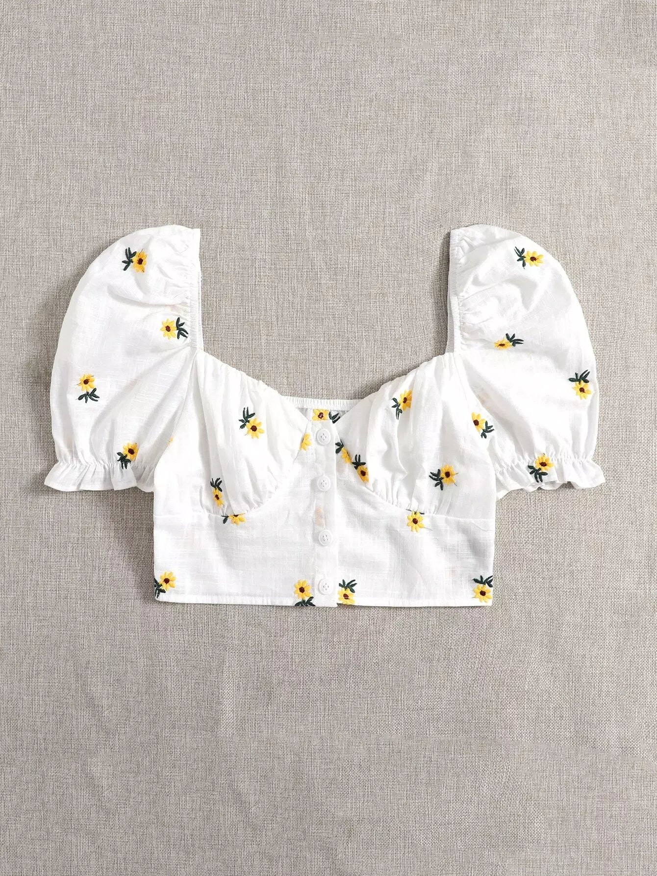 Sweetheart Neck Ruched Bust Floral Embroidery Blouse