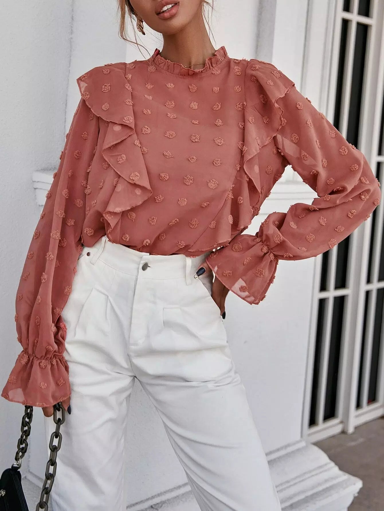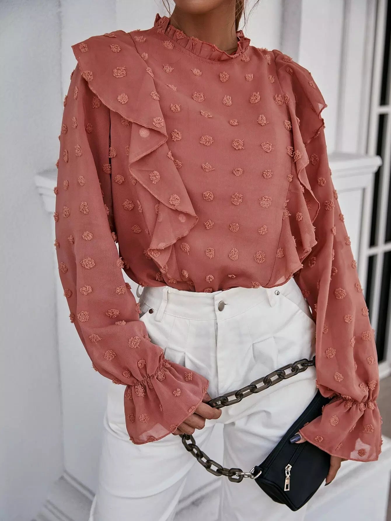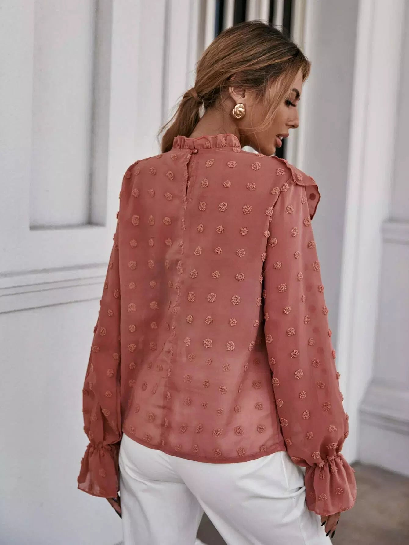 Swiss Dot Ruffle Trim Flounce Sleeve Chiffon Blouse