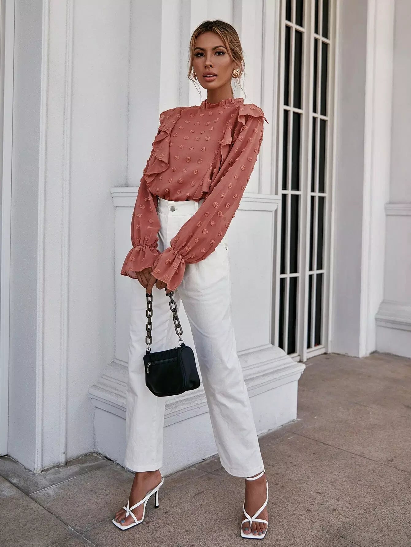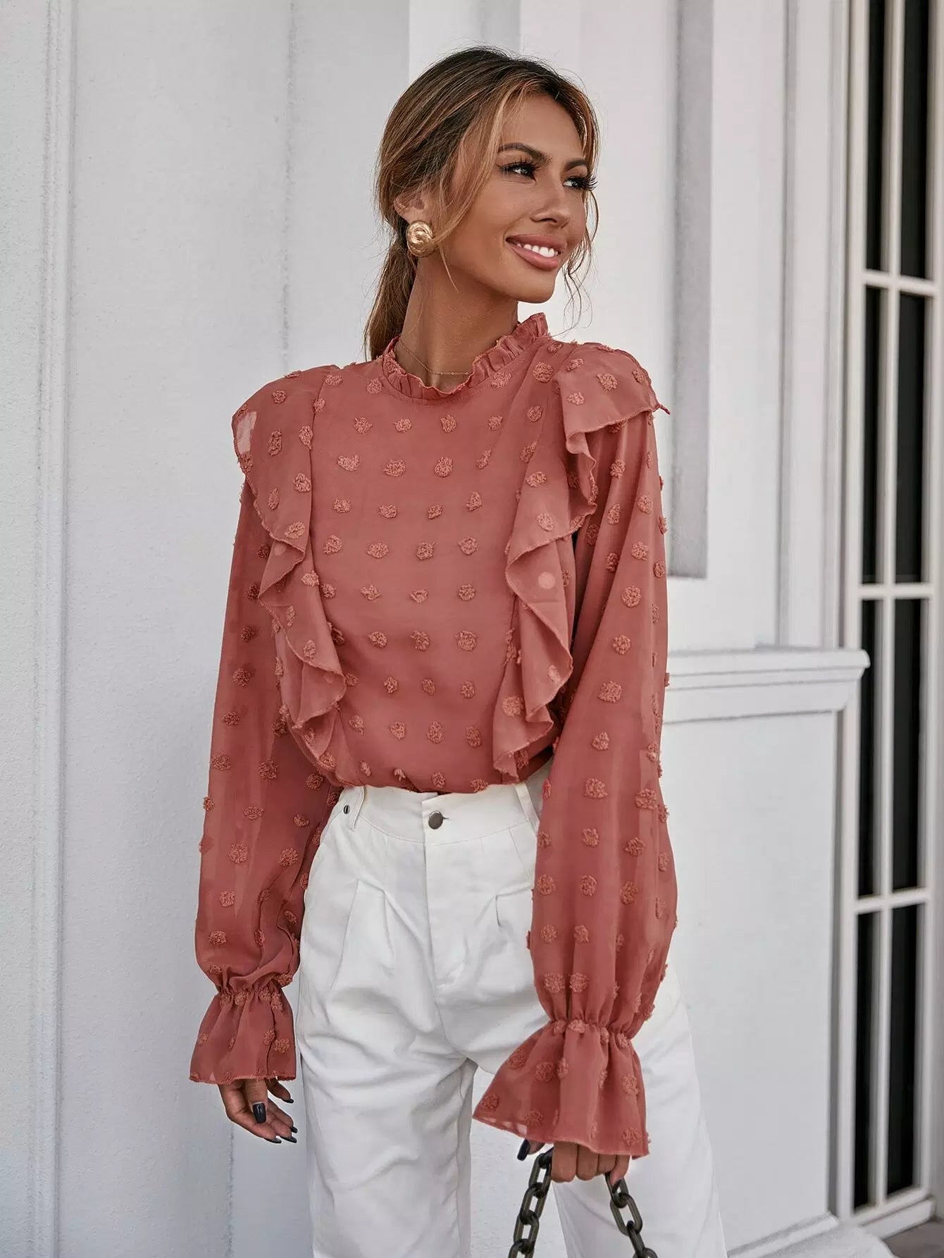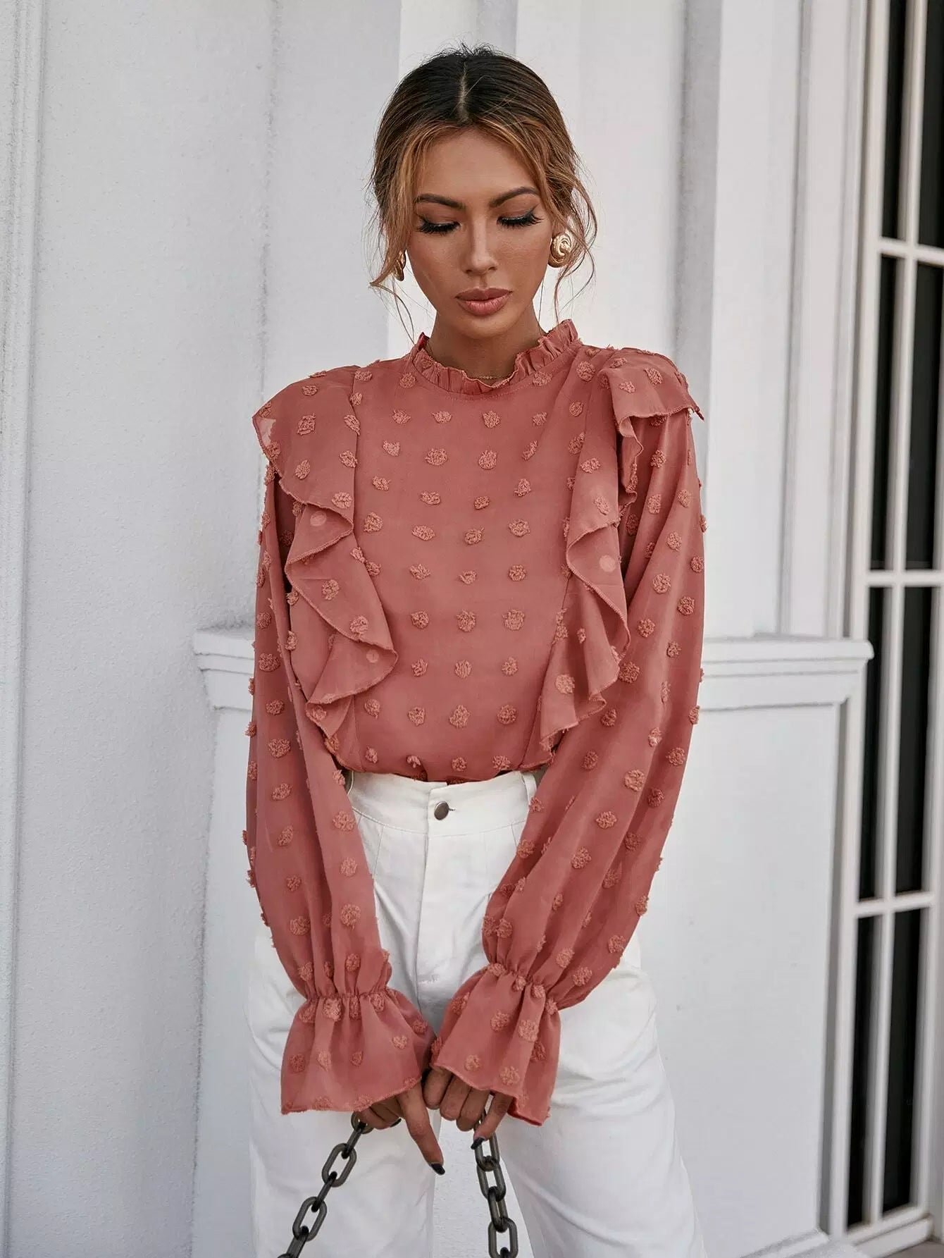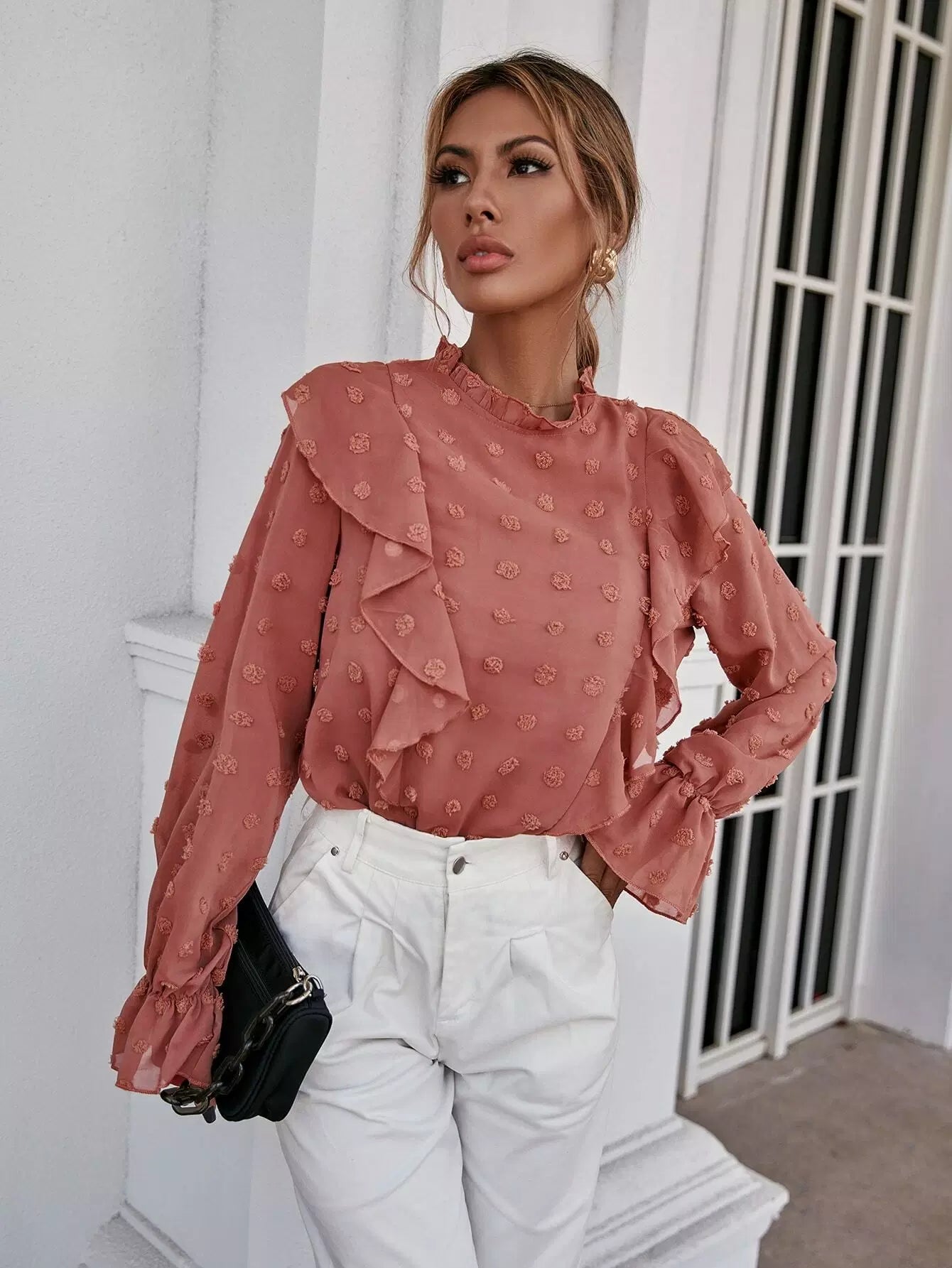 Swiss Dot Ruffle Trim Flounce Sleeve Chiffon Blouse