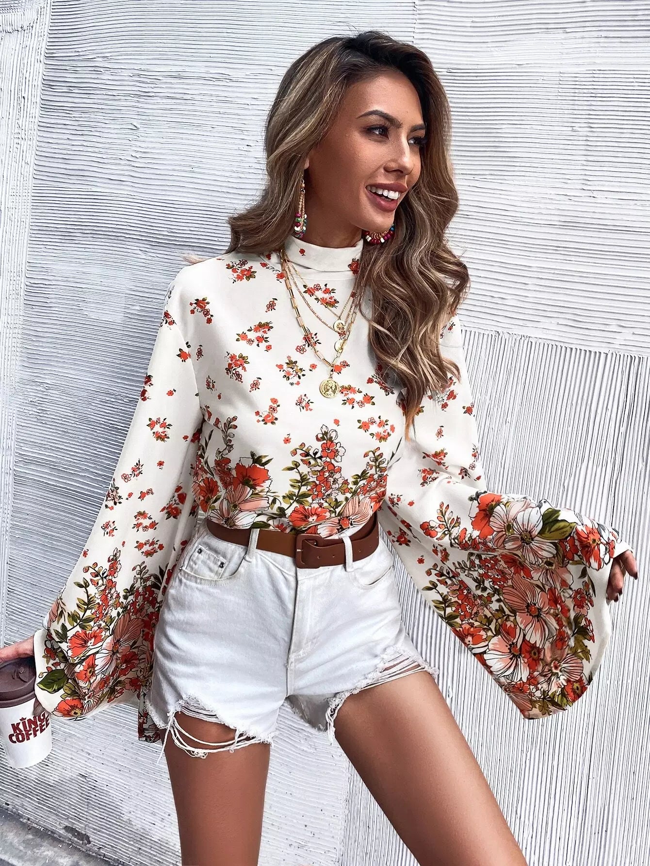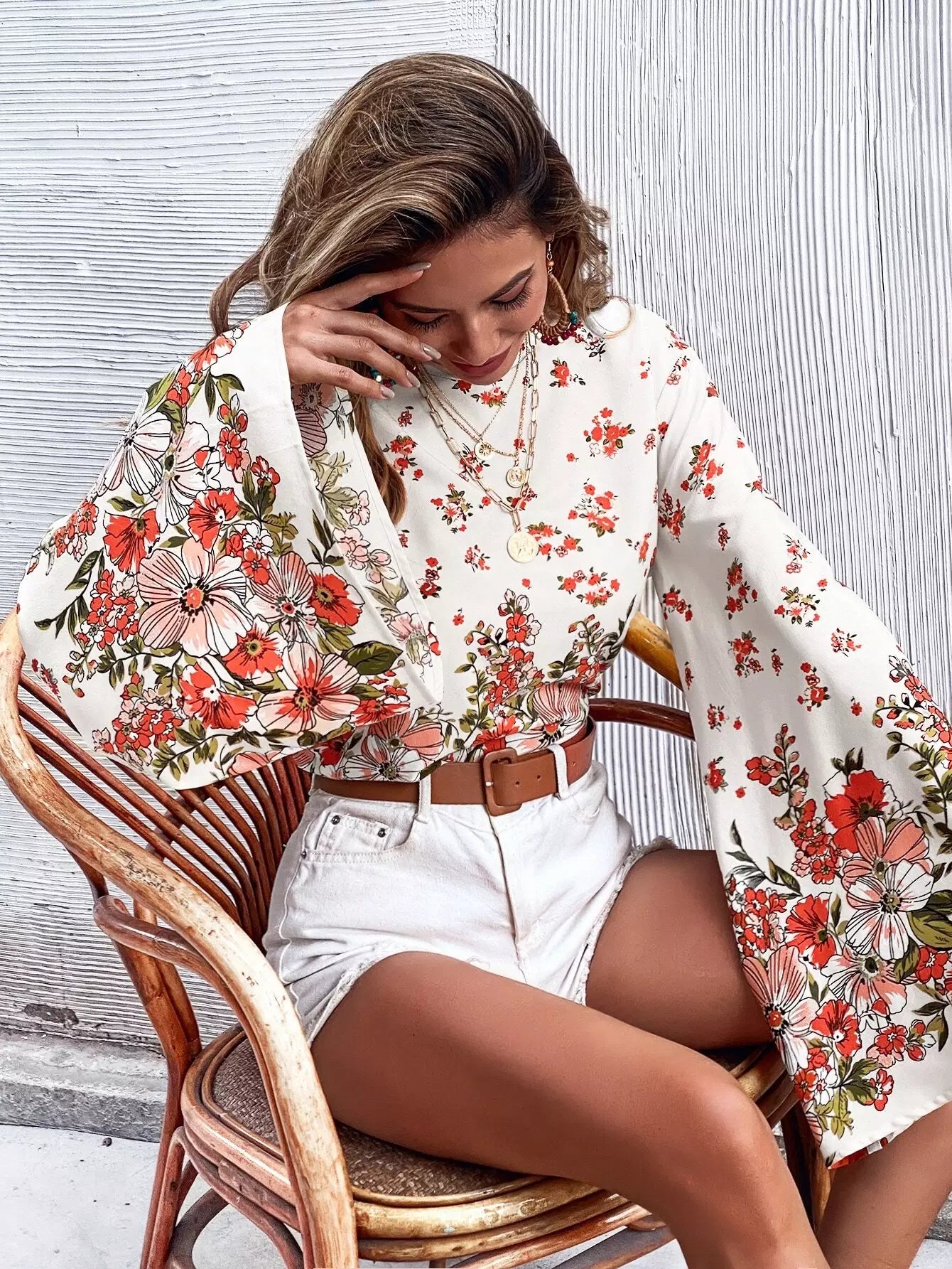 Tie Back Bell Sleeve Floral Print Blouse