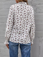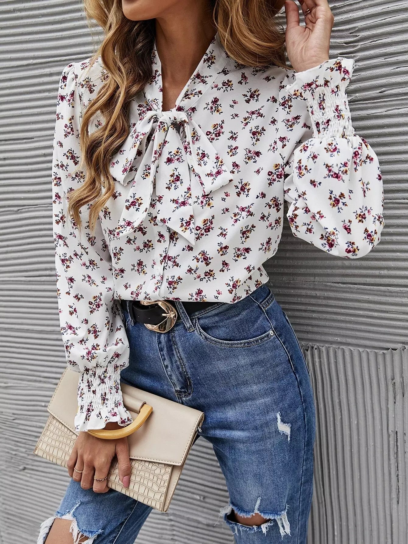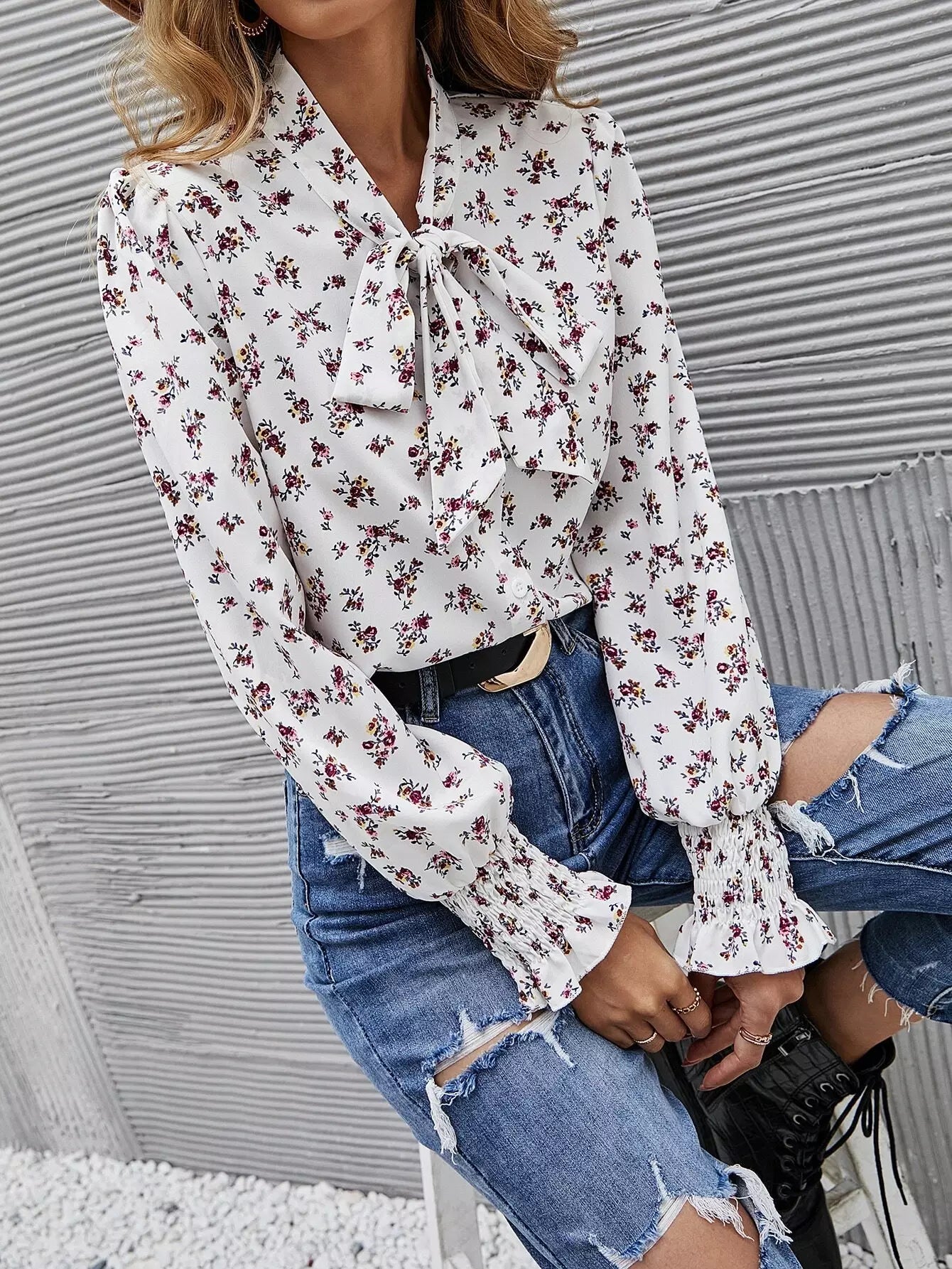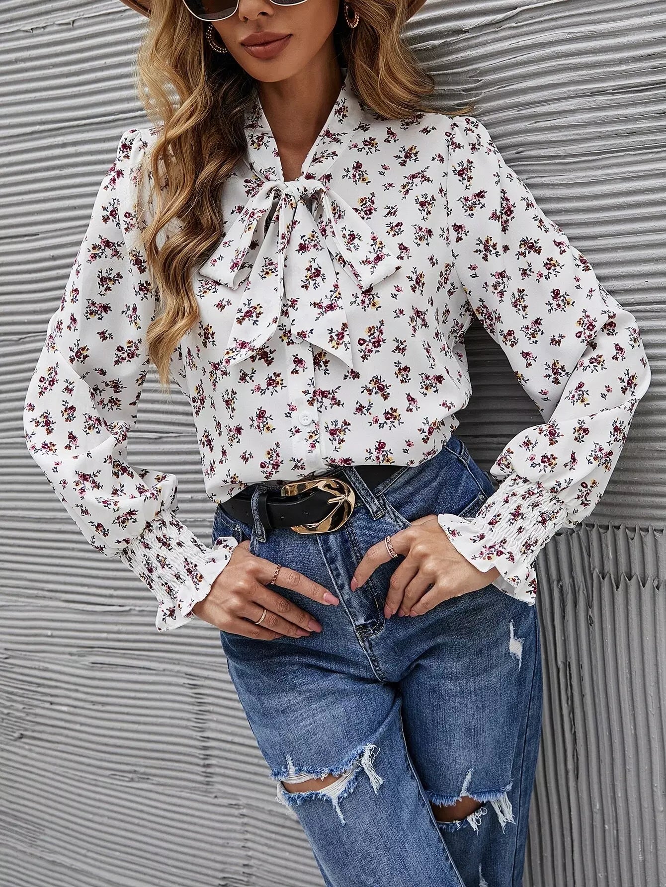 Women - Tie Neck Ditsy Floral Print Shirred Frill Cuff Blouse