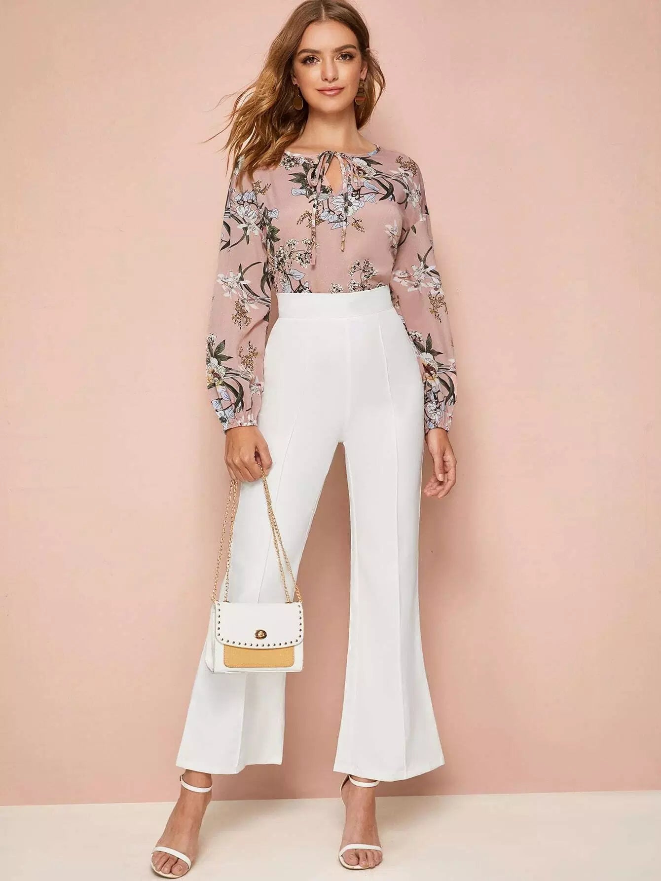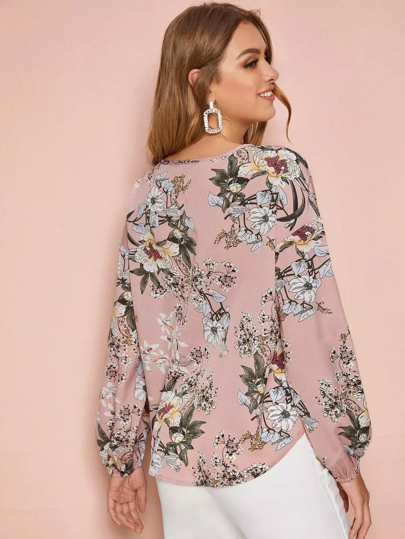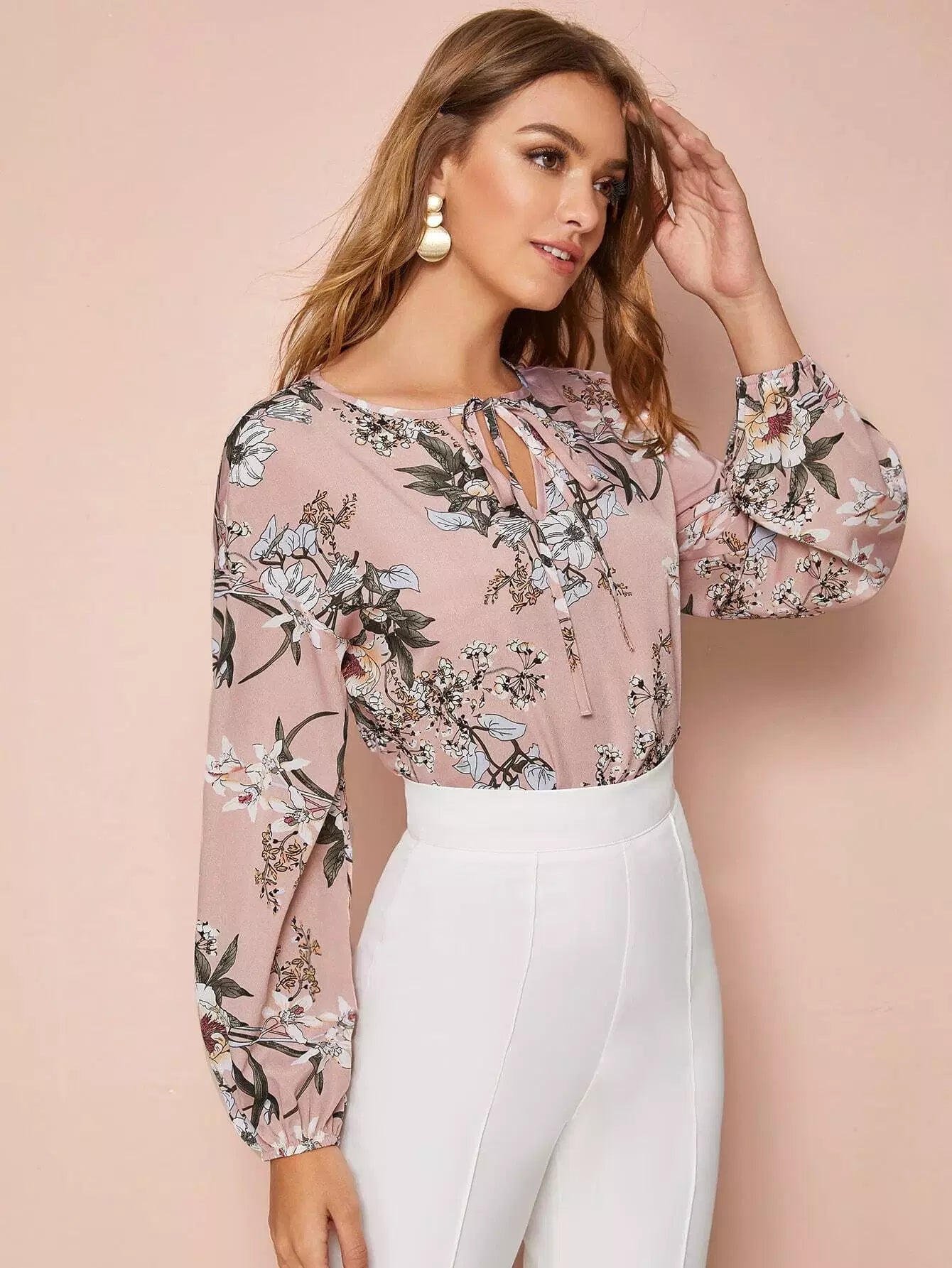 Tie Neck Lantern Sleeve Botanical Top