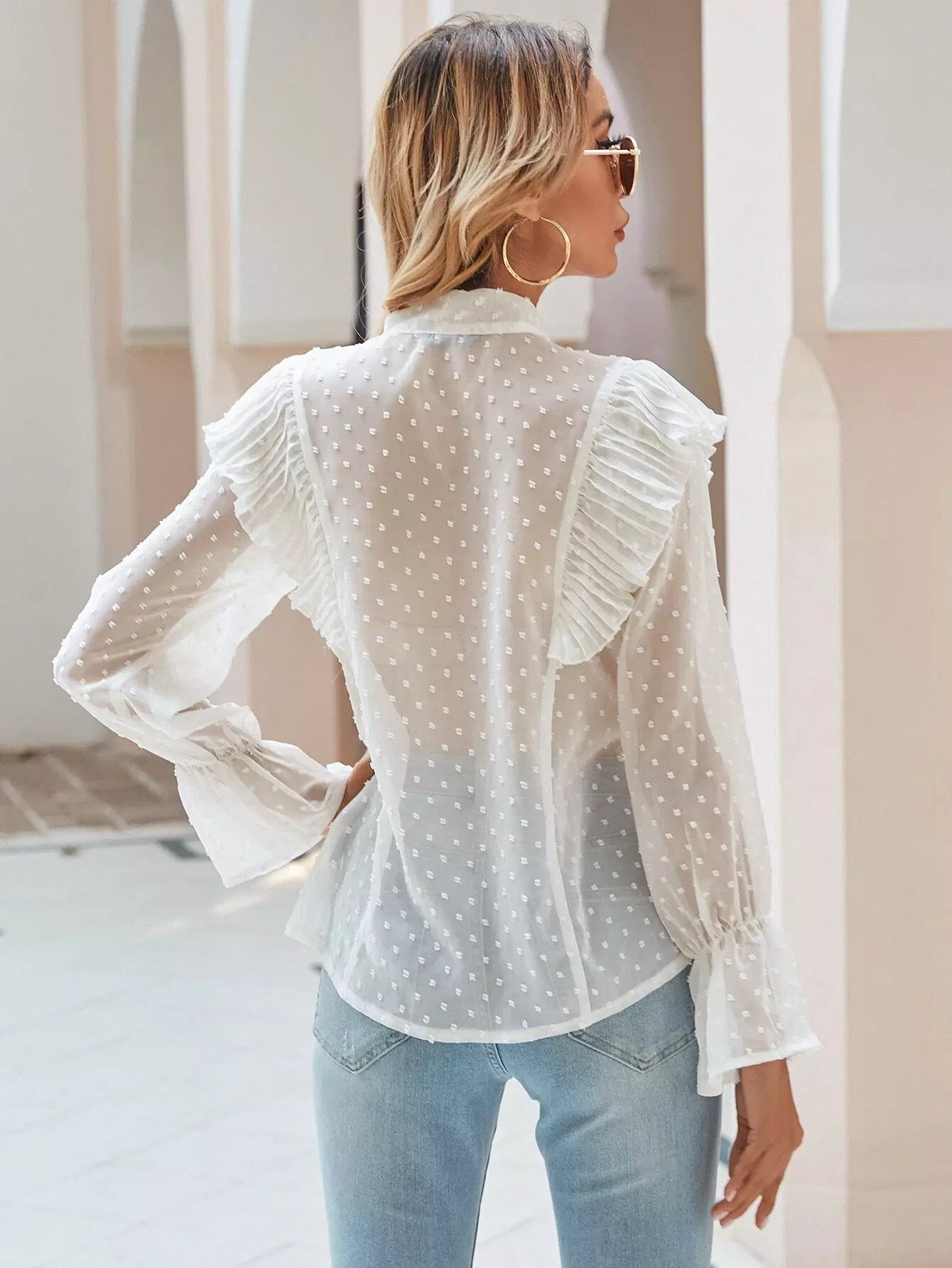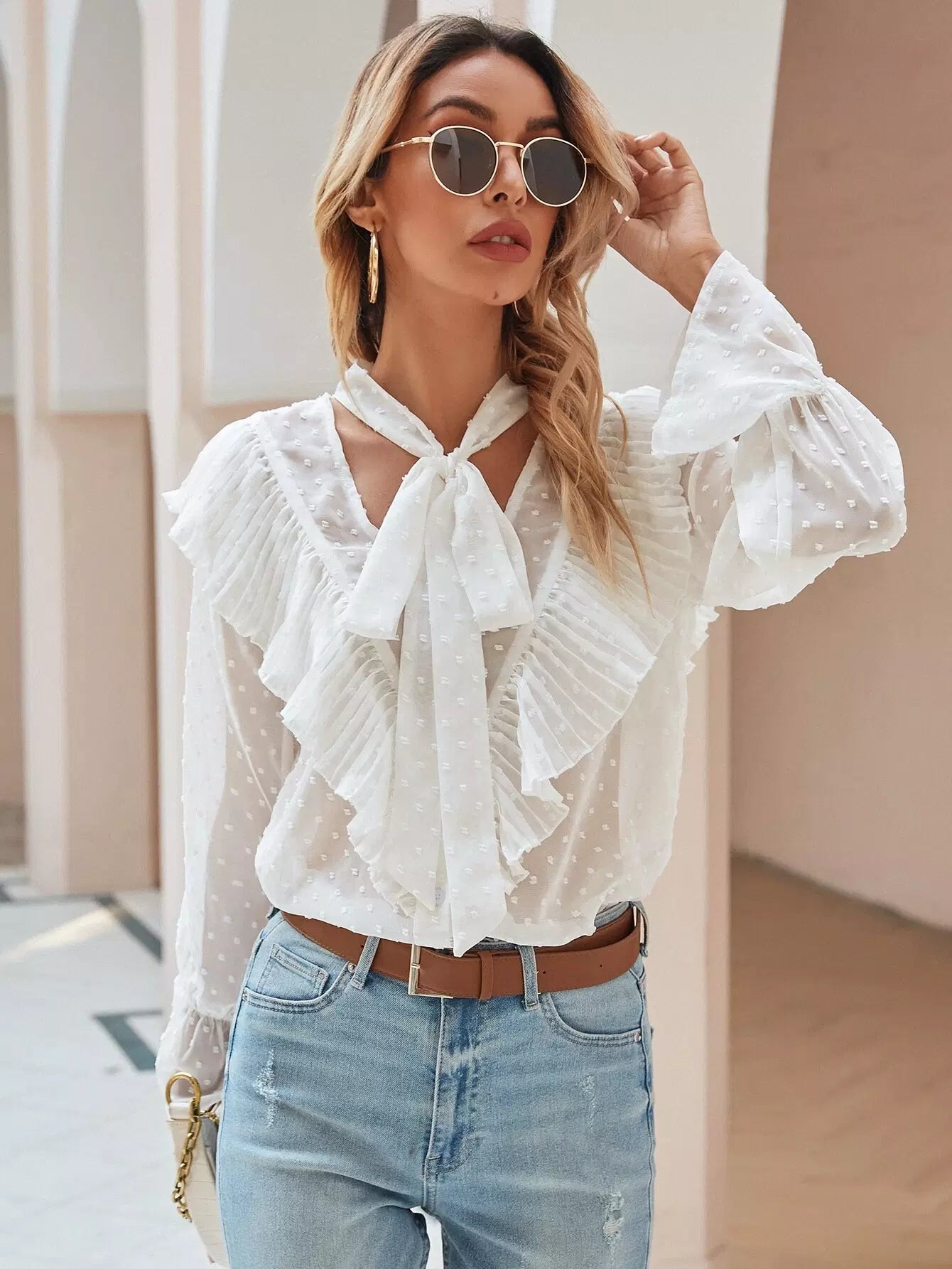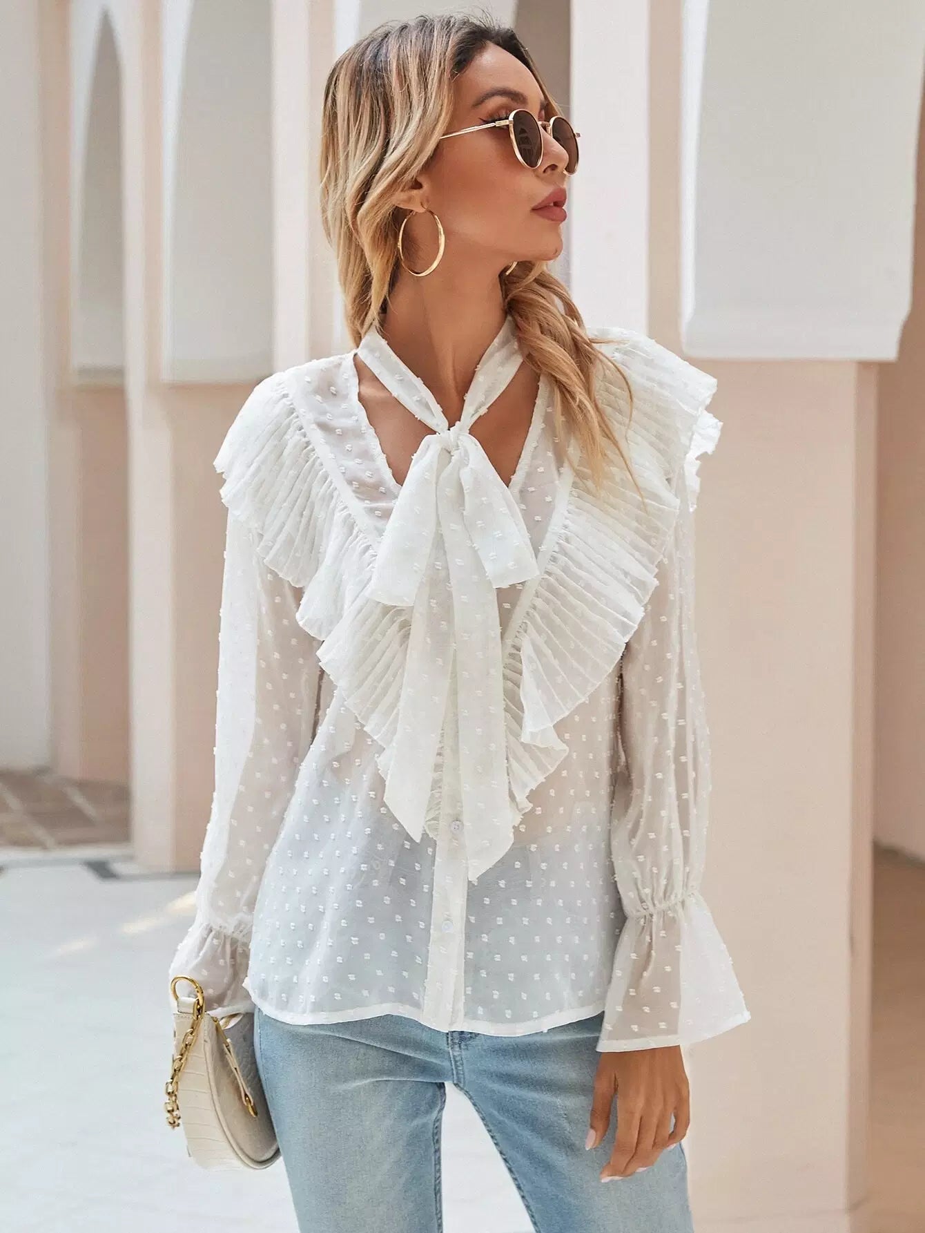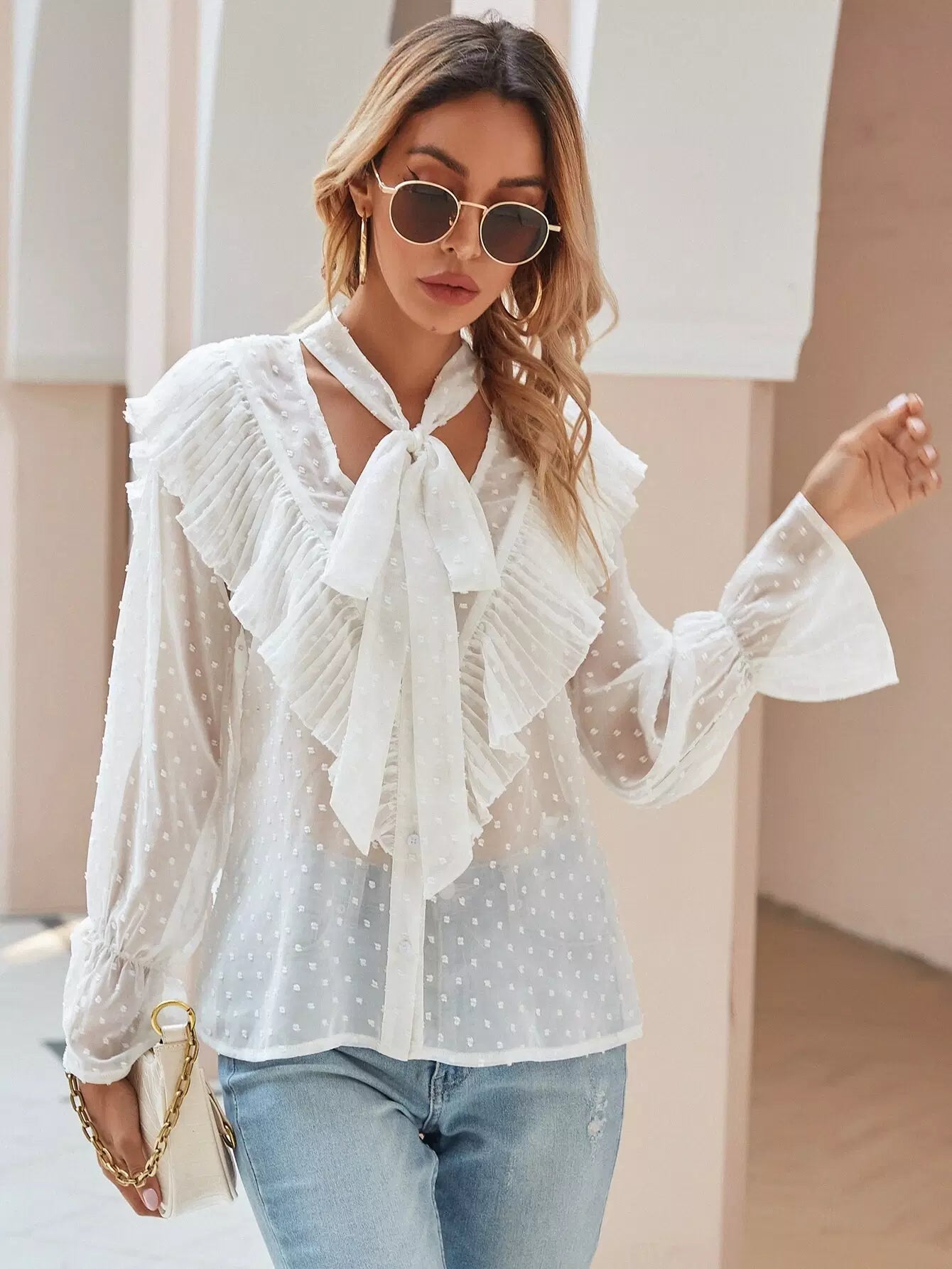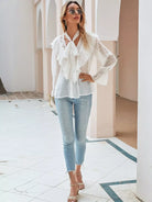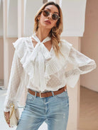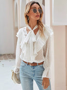 Tie Neck Swiss Dot Ruffle Trim Blouse