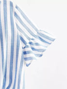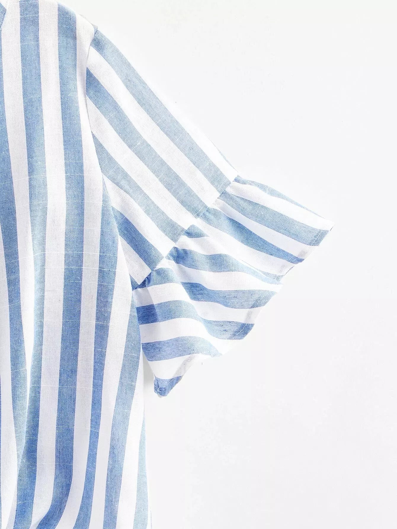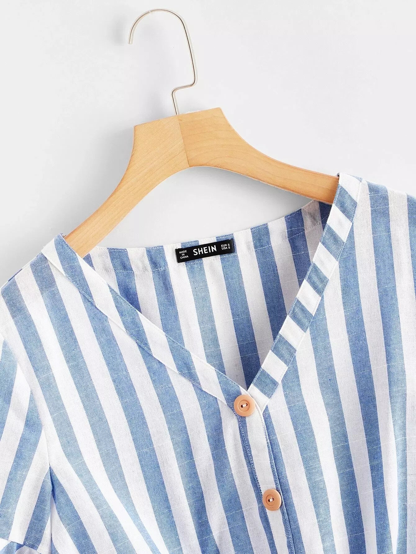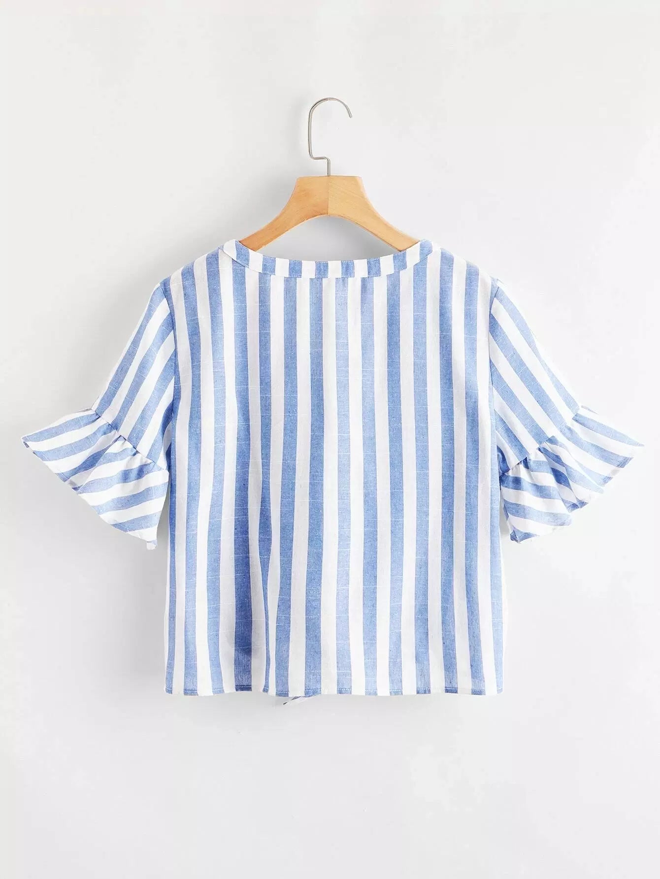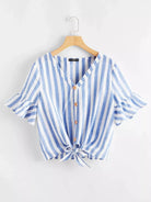 Women - V-neck Ruffle Cuff Knot Hem Striped Top
