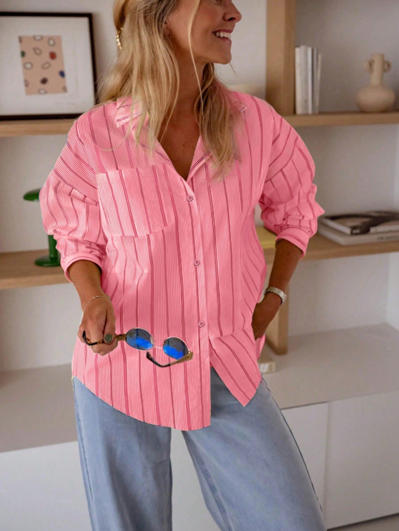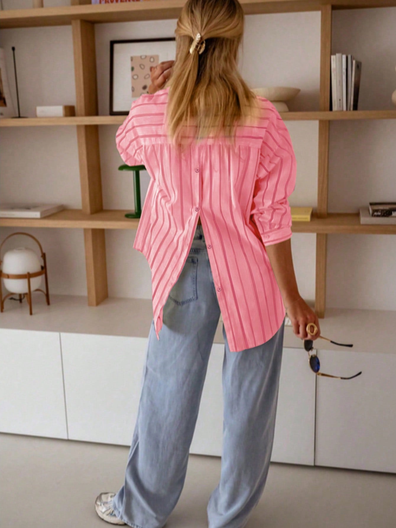 Women's Striped Button Up Blouse With Unique Back Slit And Pocket Design, Elegant