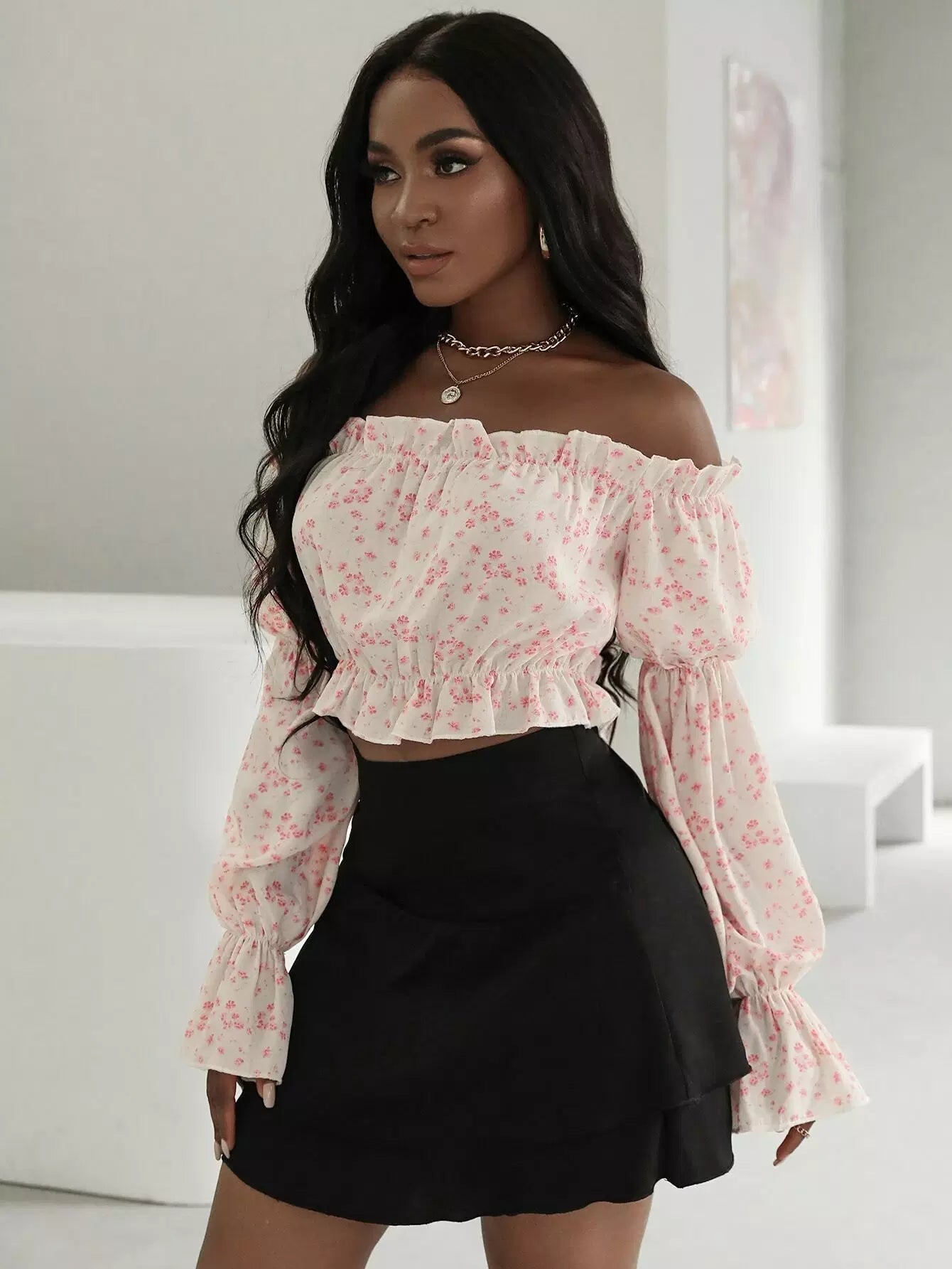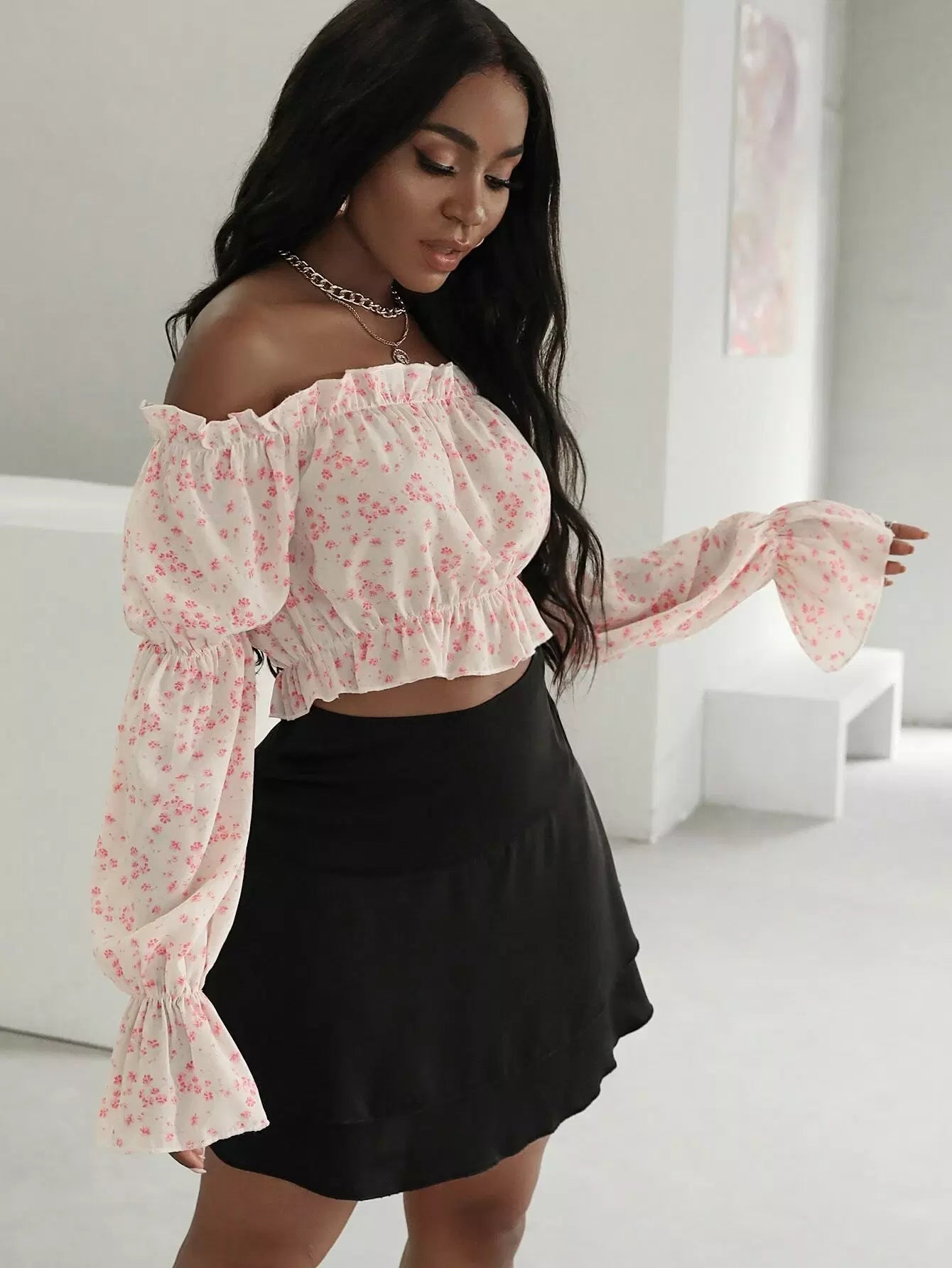 Wrap Cross Tie Back Lantern Sleeve Ditsy Floral Crop Top