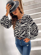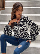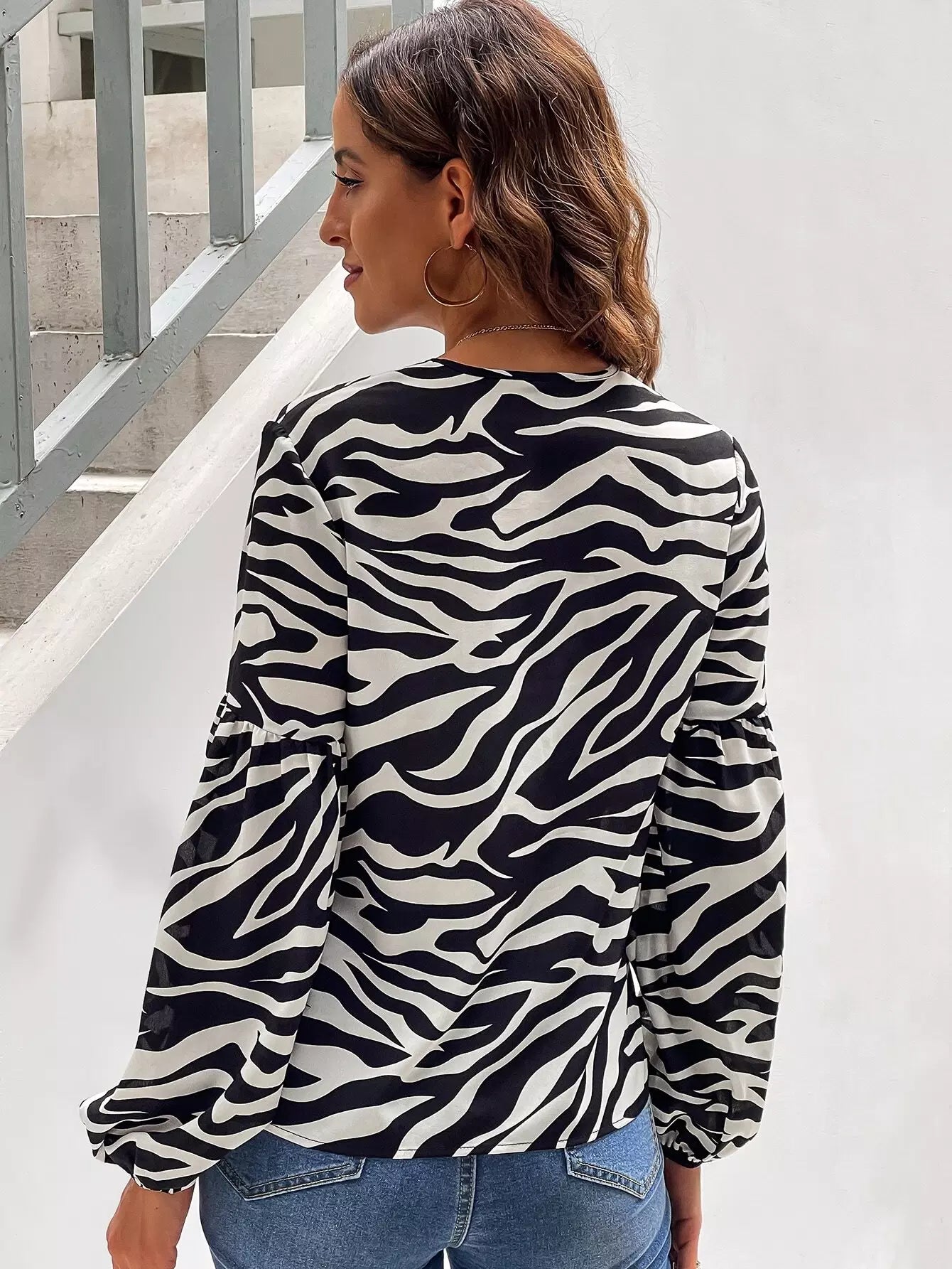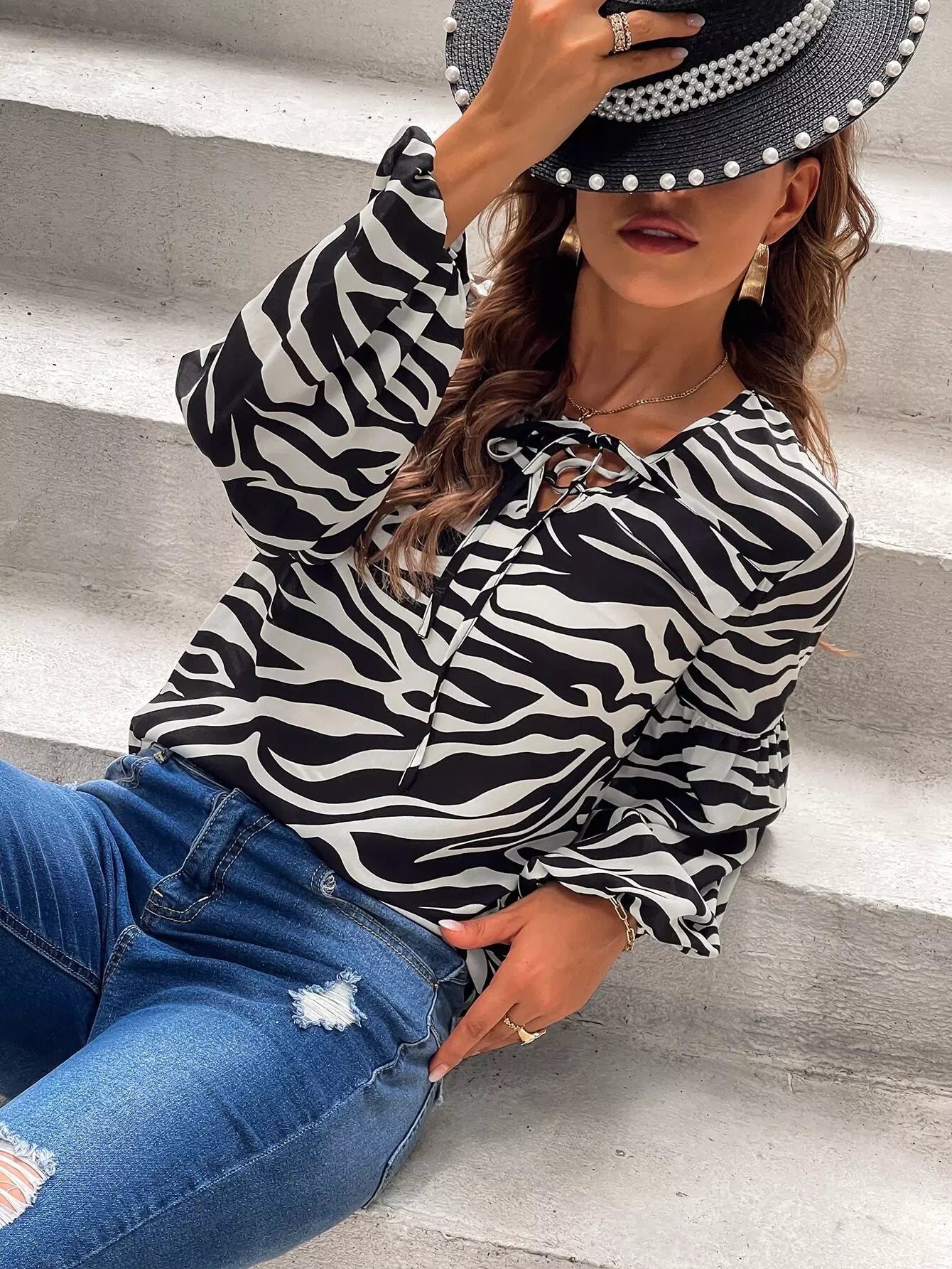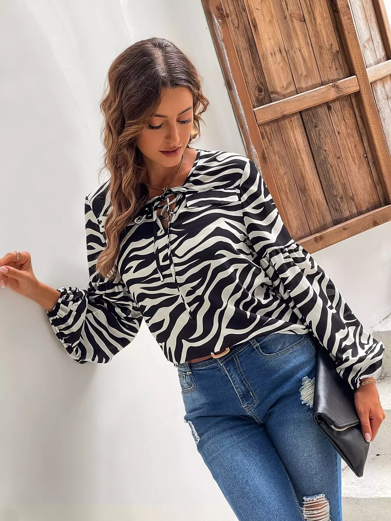 Zebra Striped Lace-up Bishop Sleeve Blouse