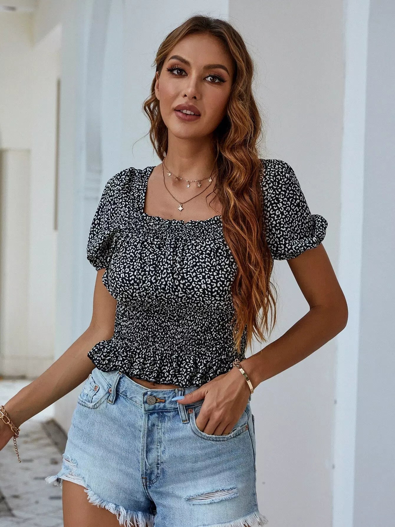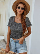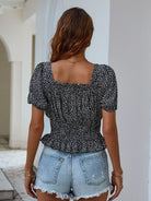 All Over Print Shirred Peplum Blouse