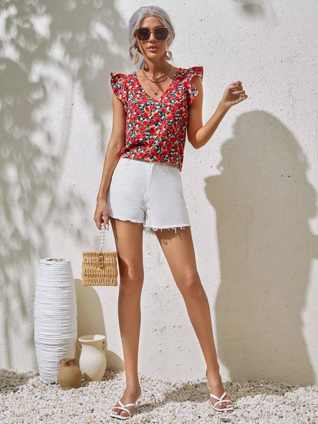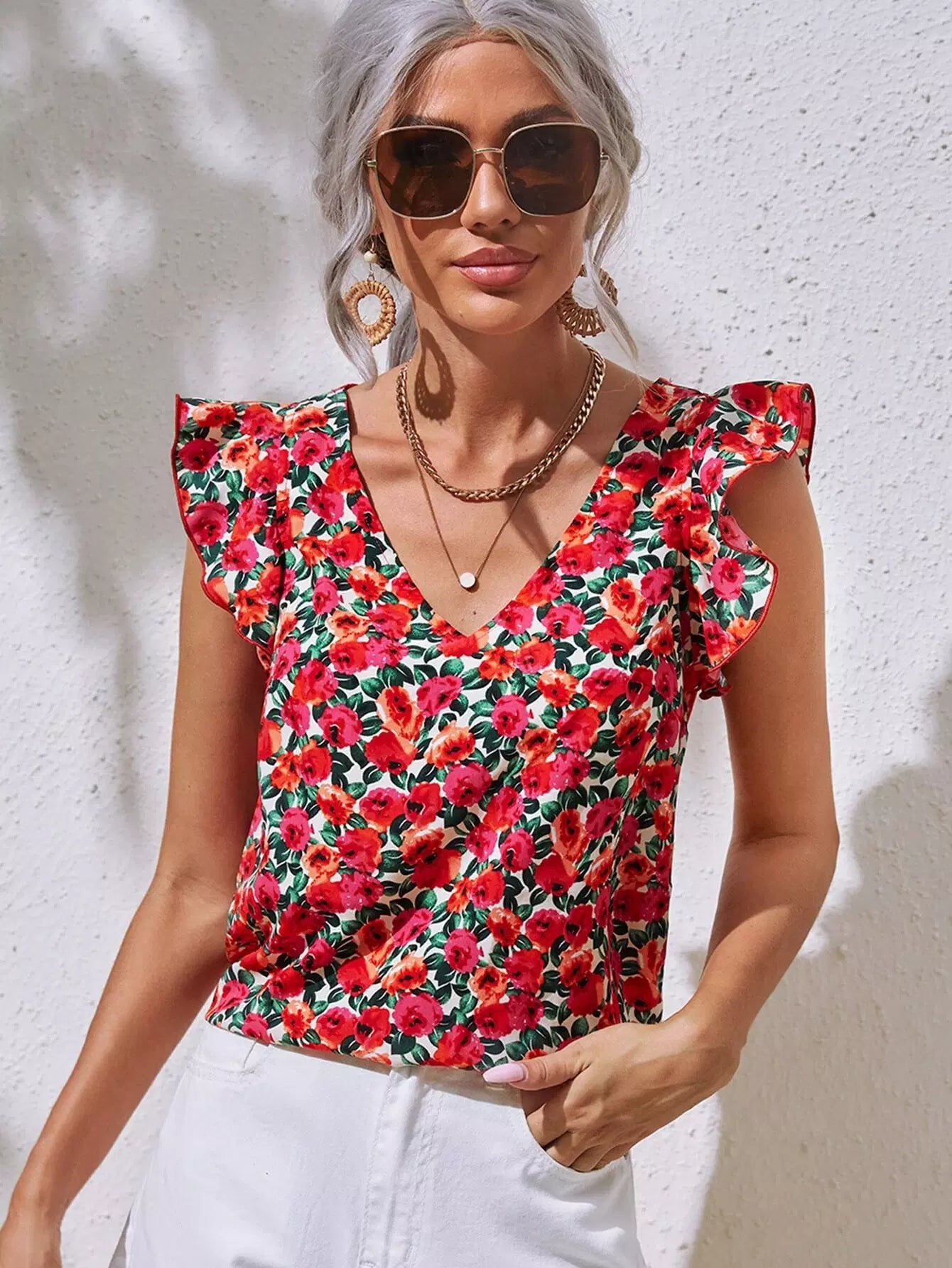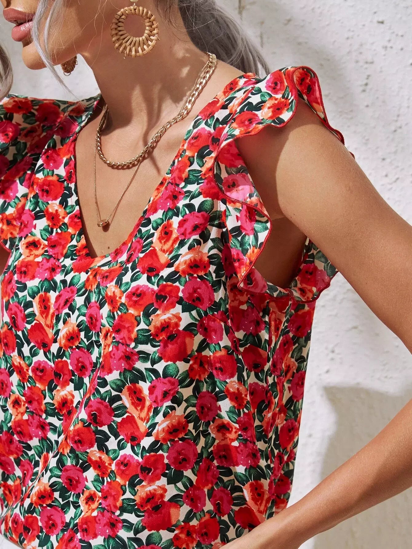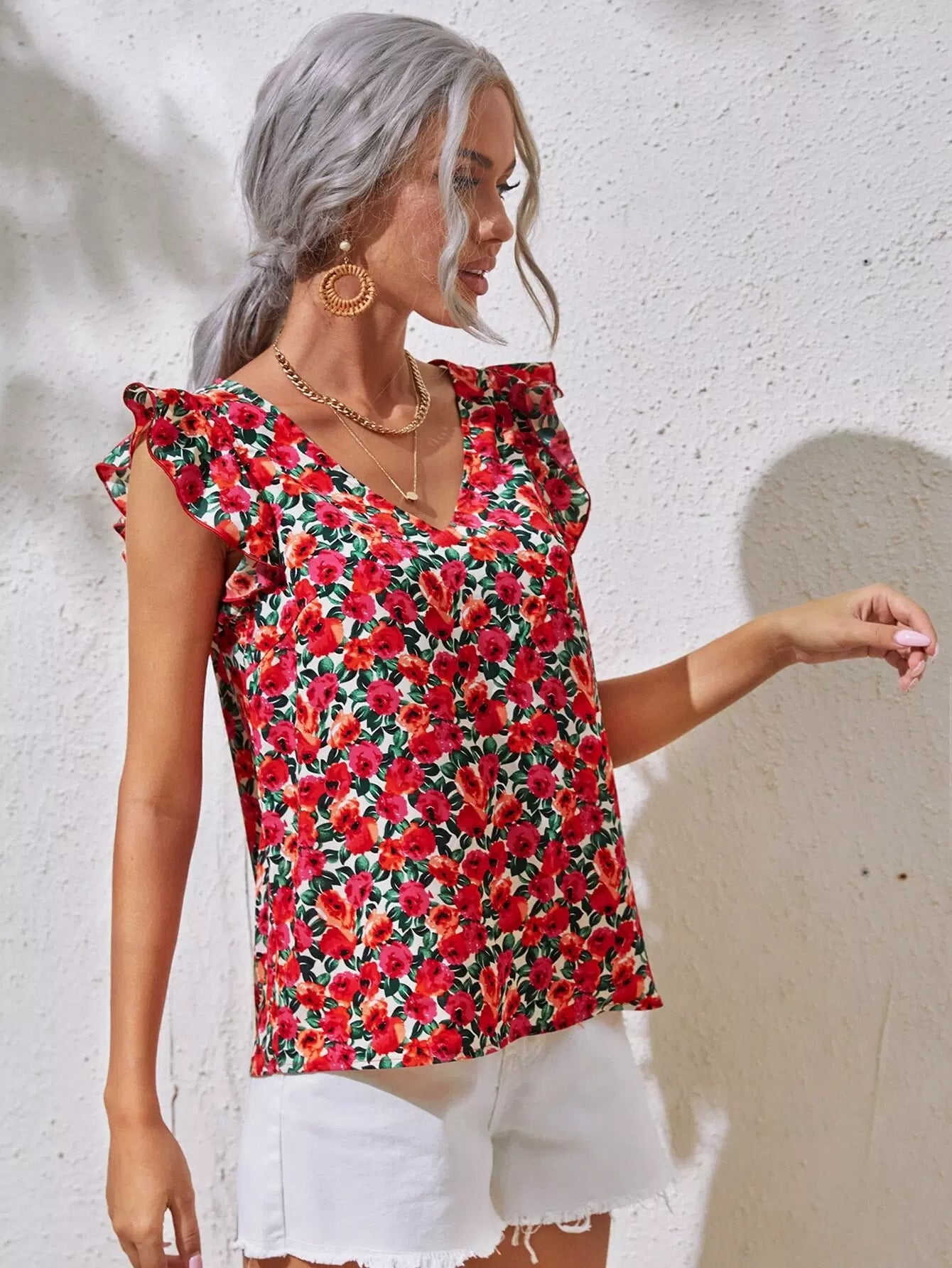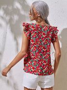 Allover Floral Print V Neck Ruffle Armhole Top