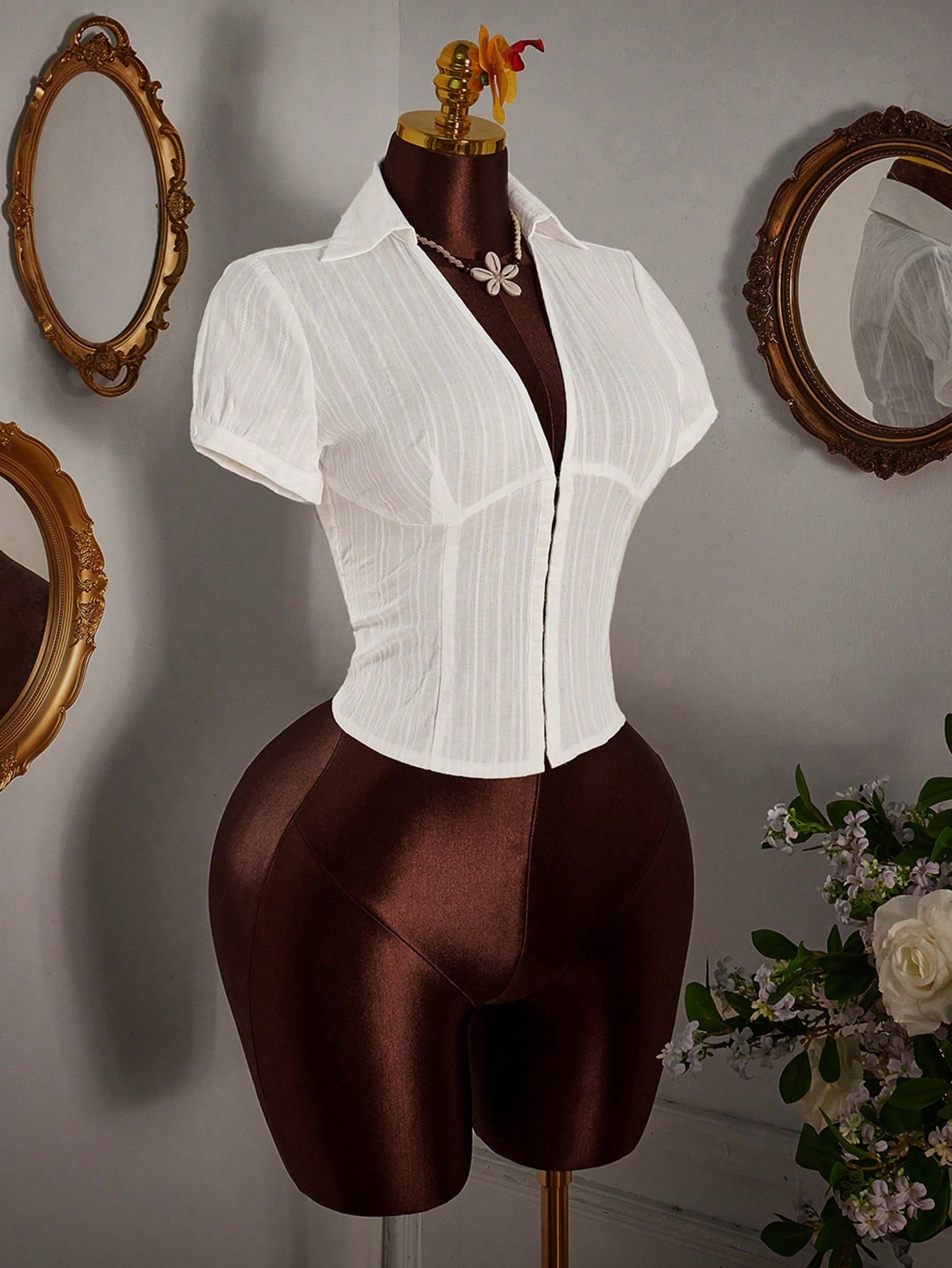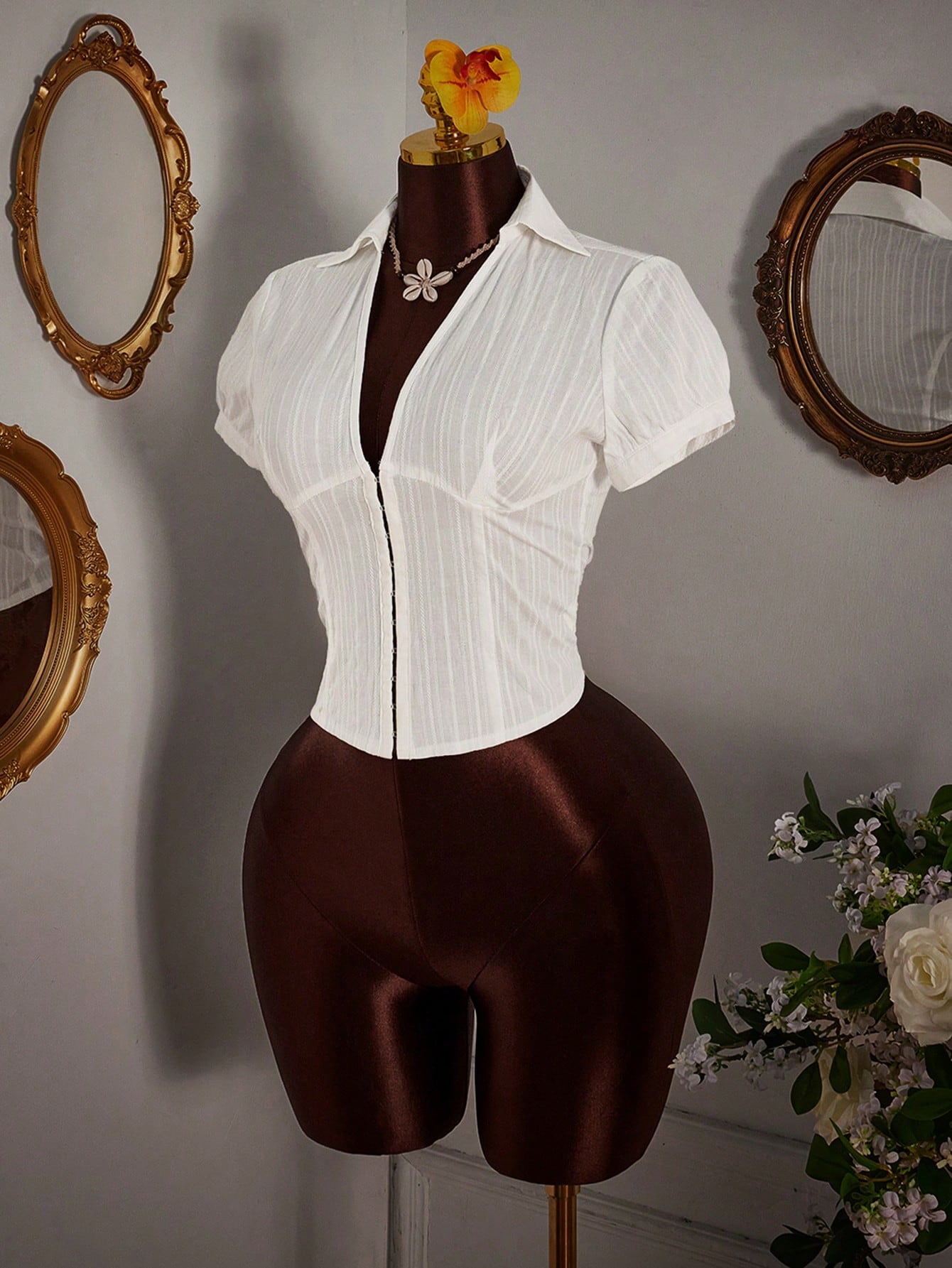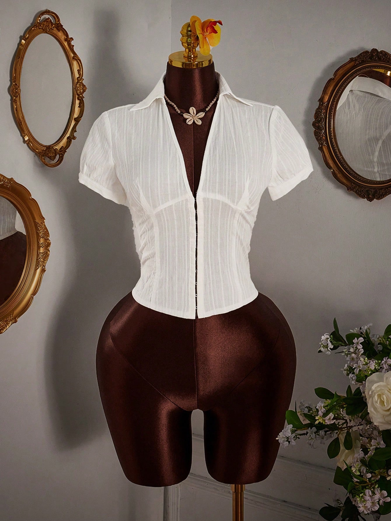 Amplova 1pc Women's Slim Fit V-Neck Polo Collar Metal Button Shirt