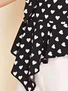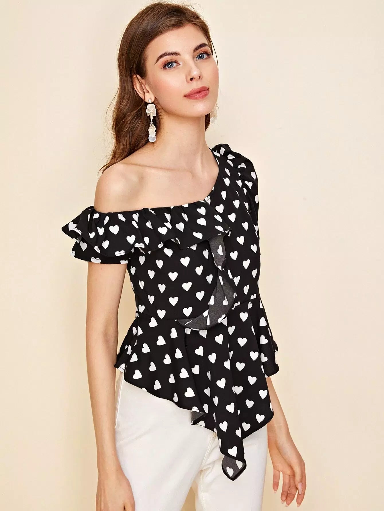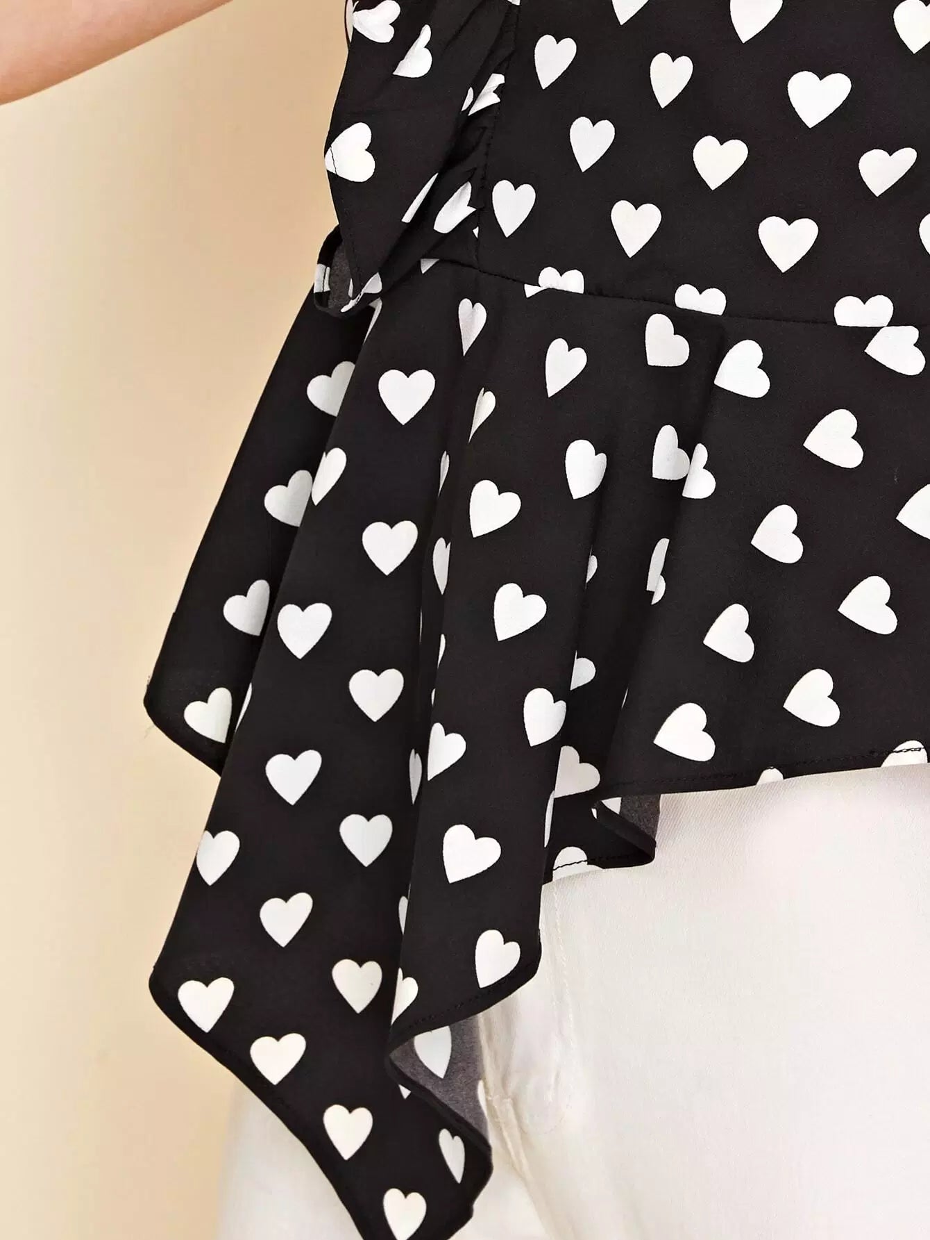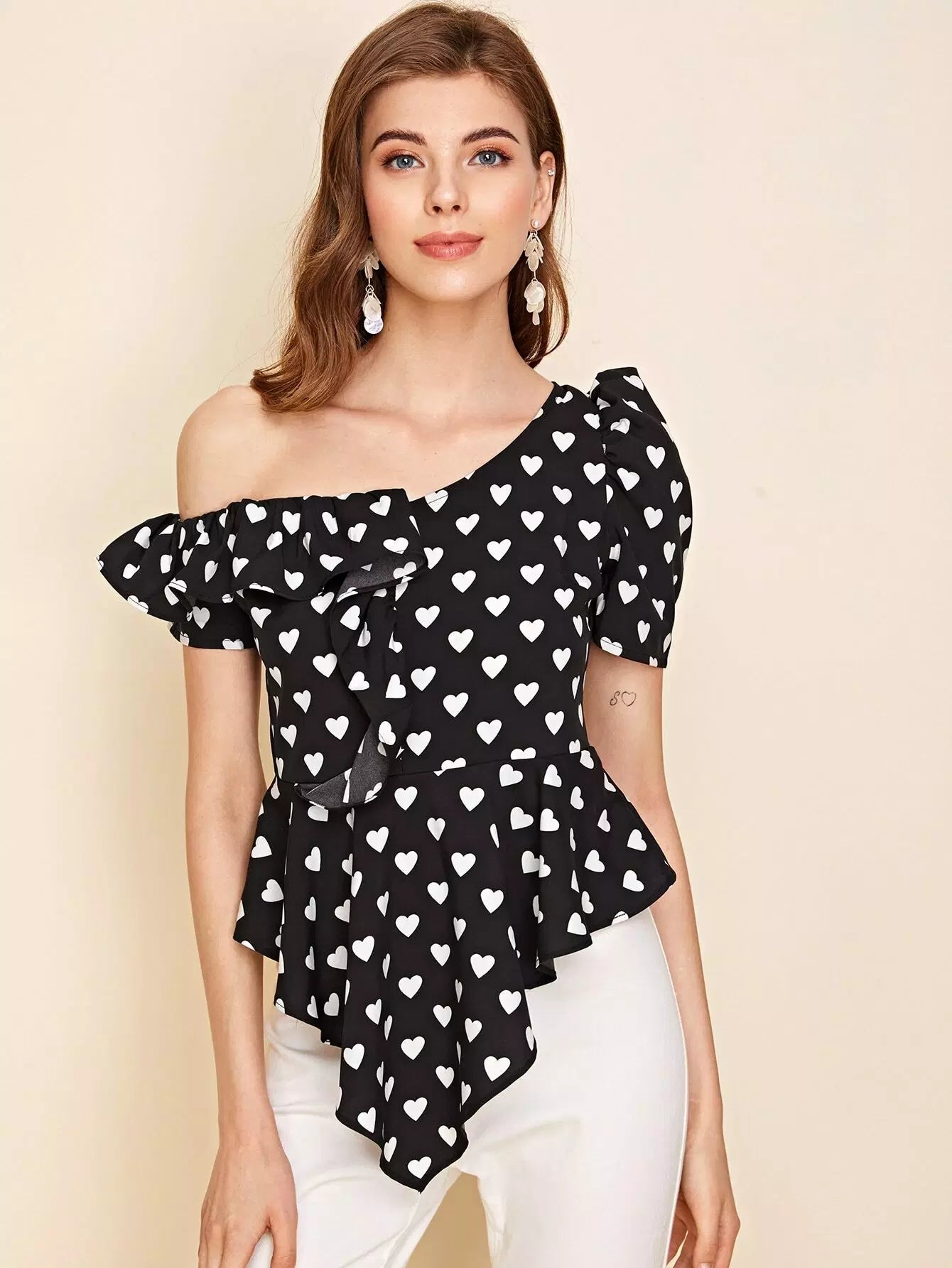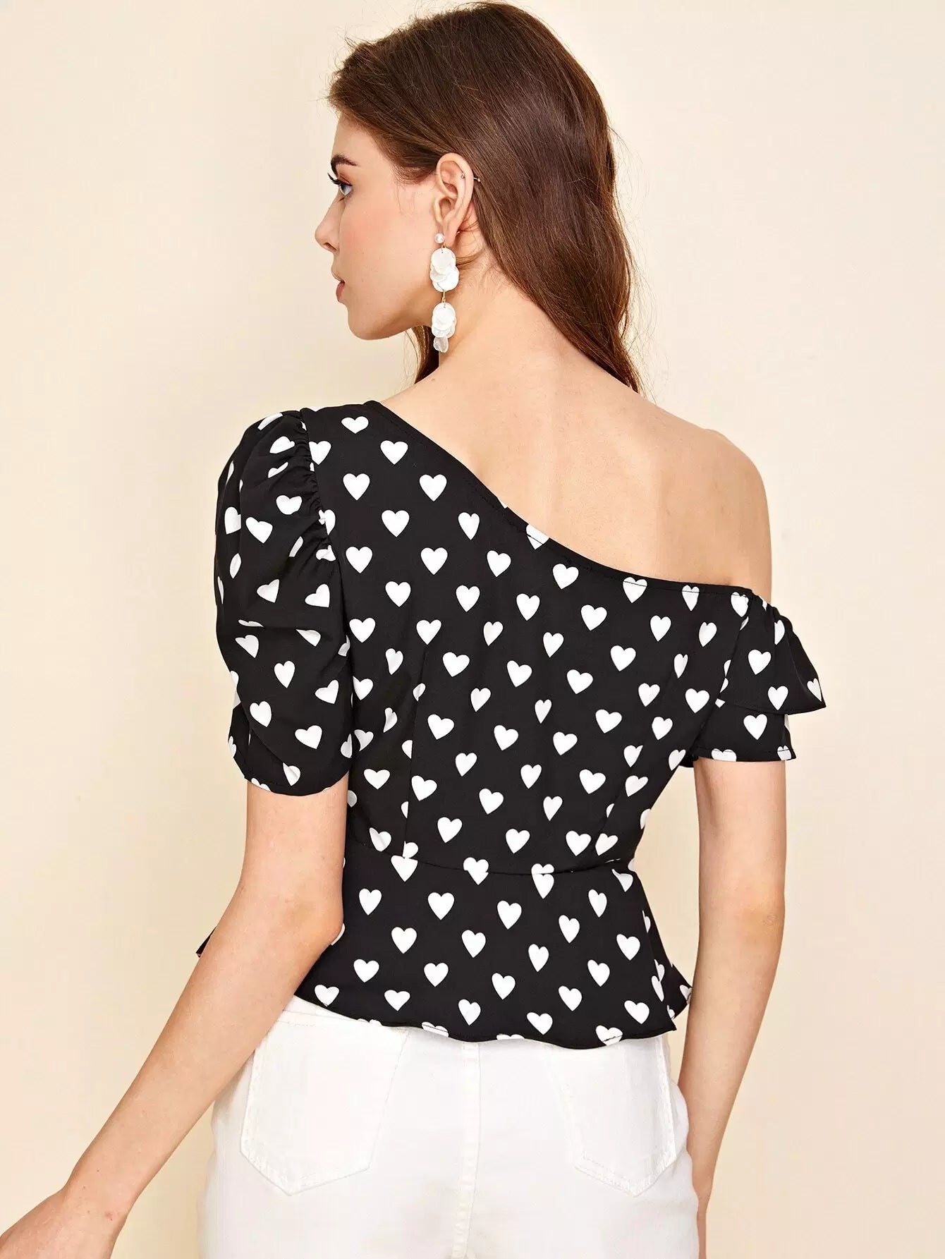 Women - Asymmetrical Neck Heart Print Peplum Top