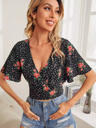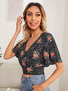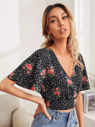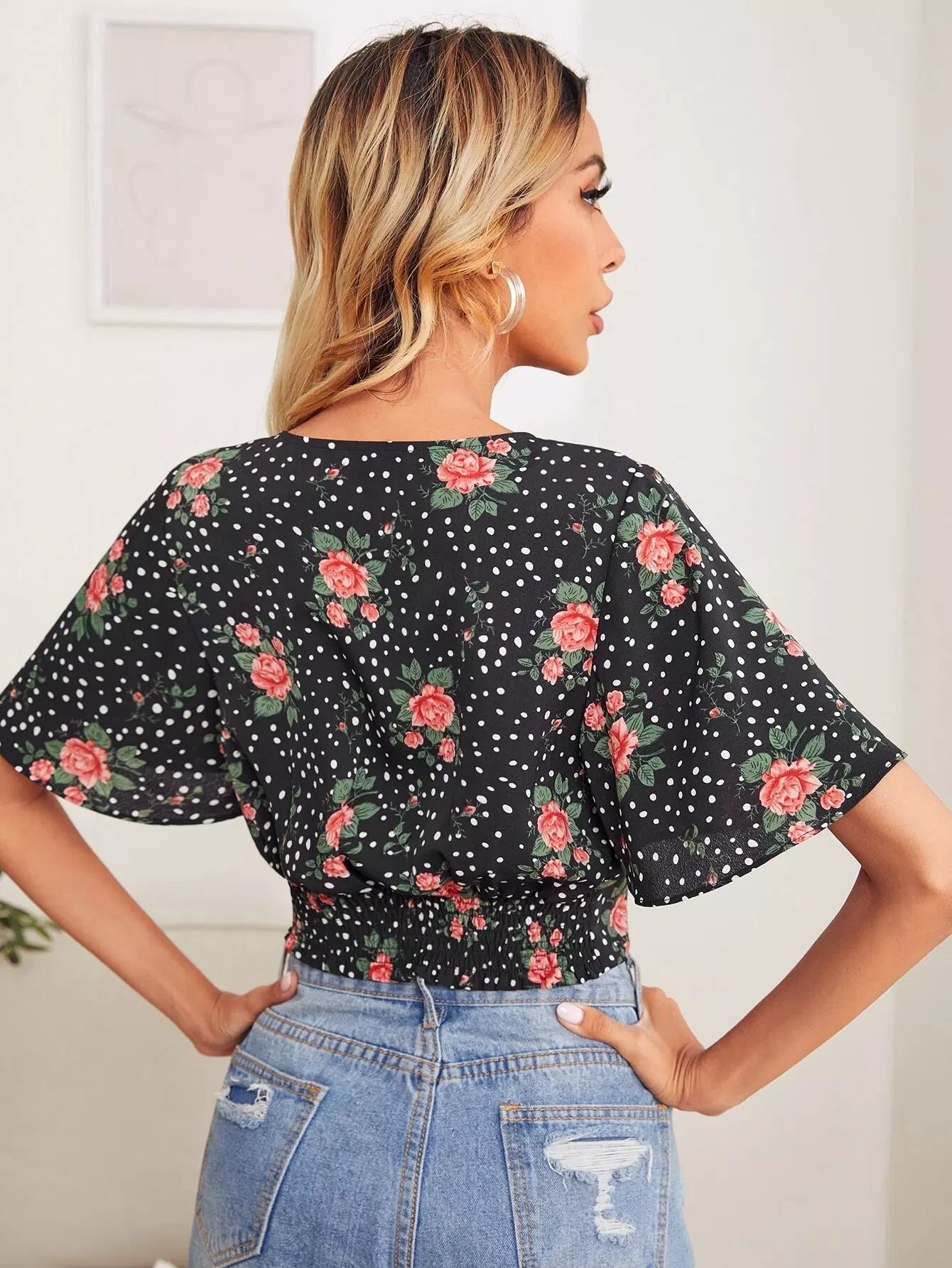 Bell Sleeve Surplice Neck Polka Dot & Floral Top