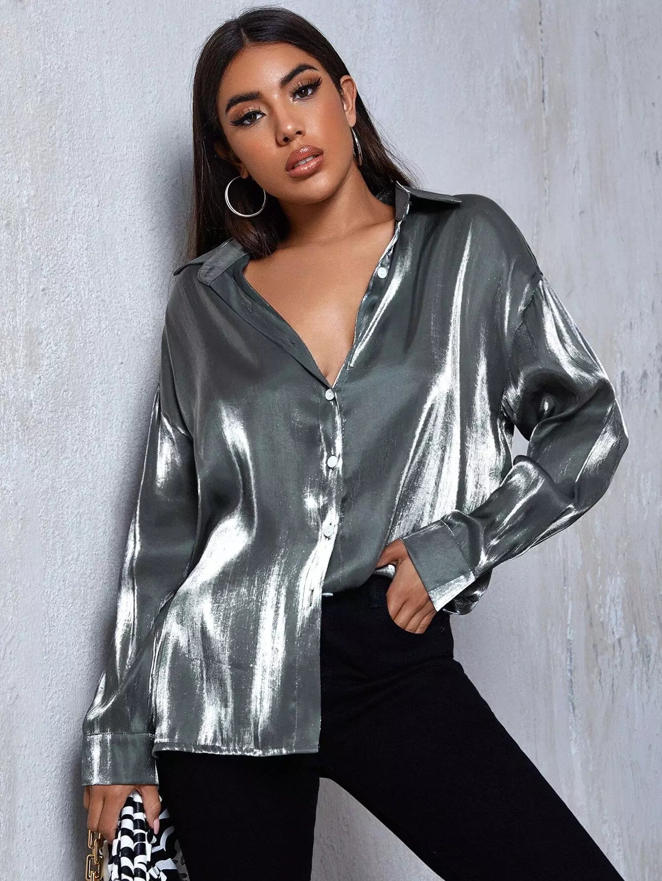 Button Front Drop Shoulder Metallic Top