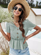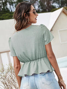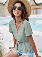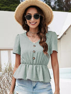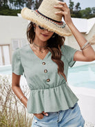 Button Front Puff Sleeve Dalmatian Peplum Top