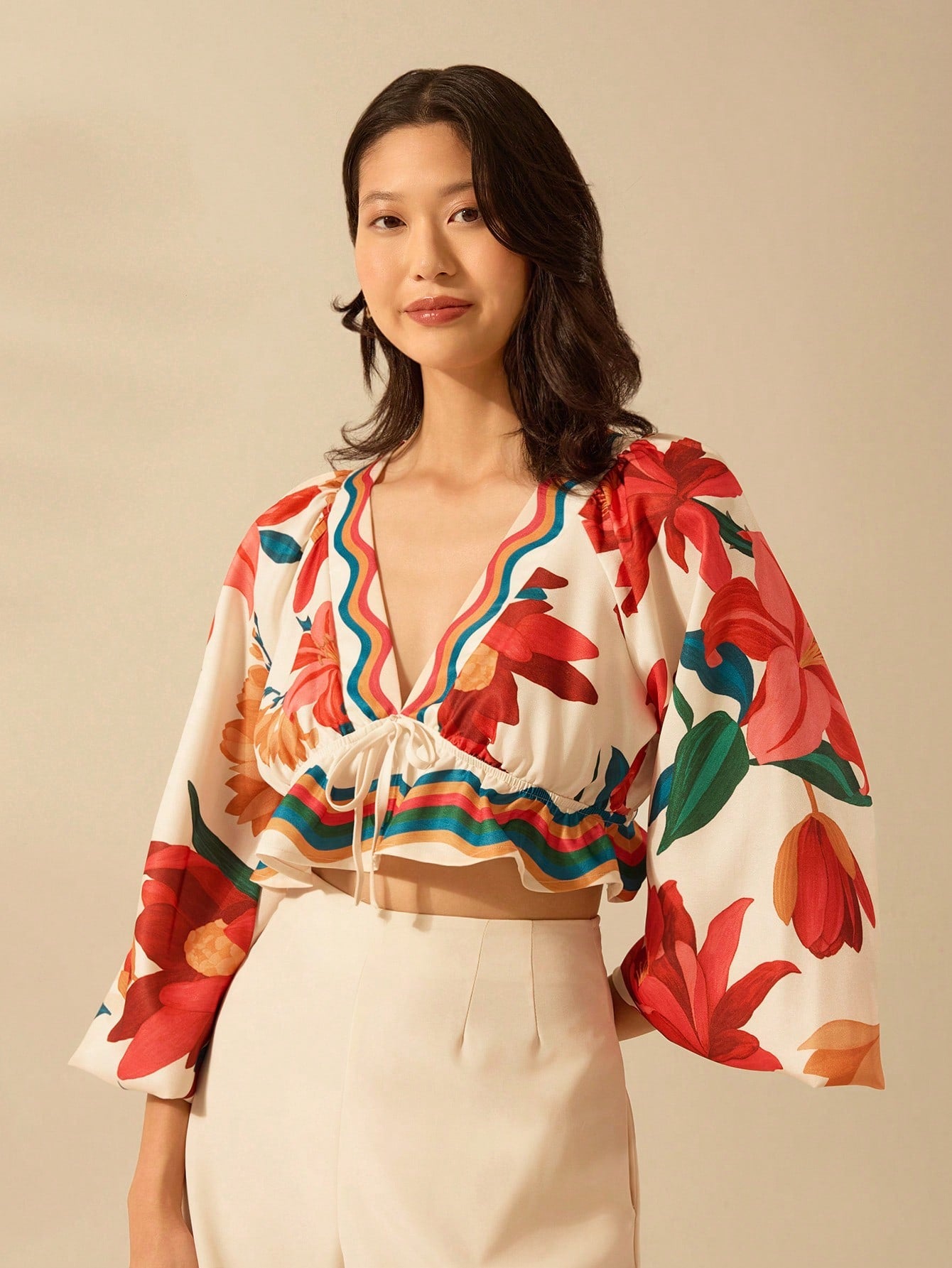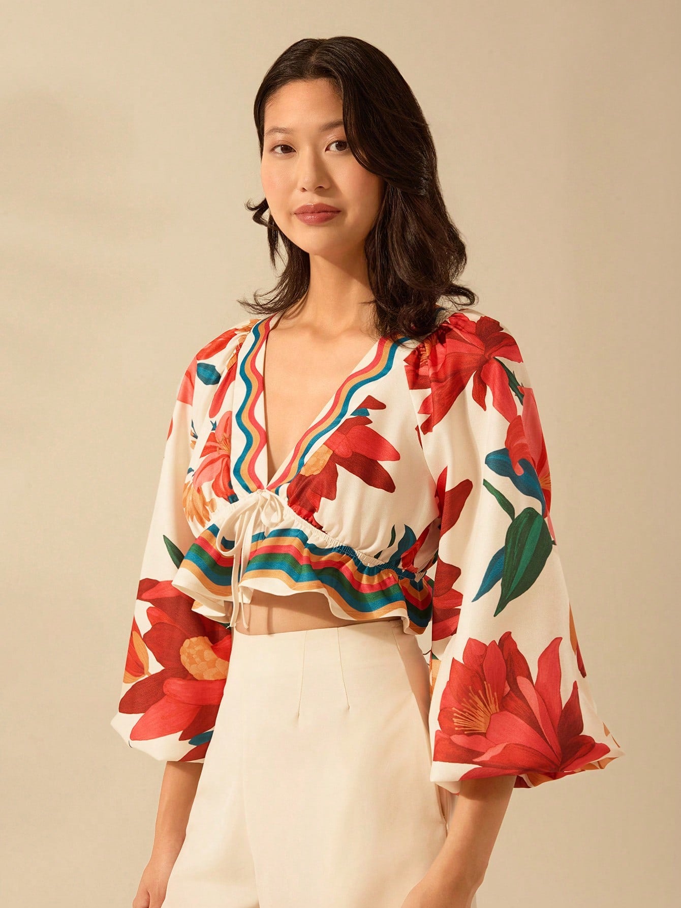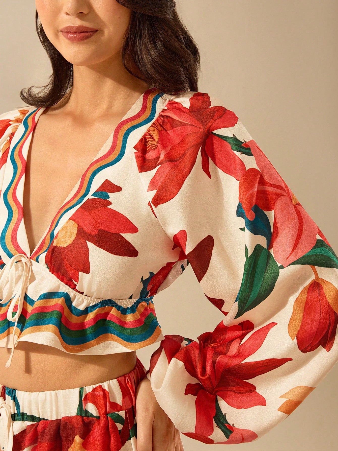 CAJUNI Women's Boho Vacation Tropical Floral Print Deep V-Neck Lantern Sleeve Tie Front Blouse, Casual