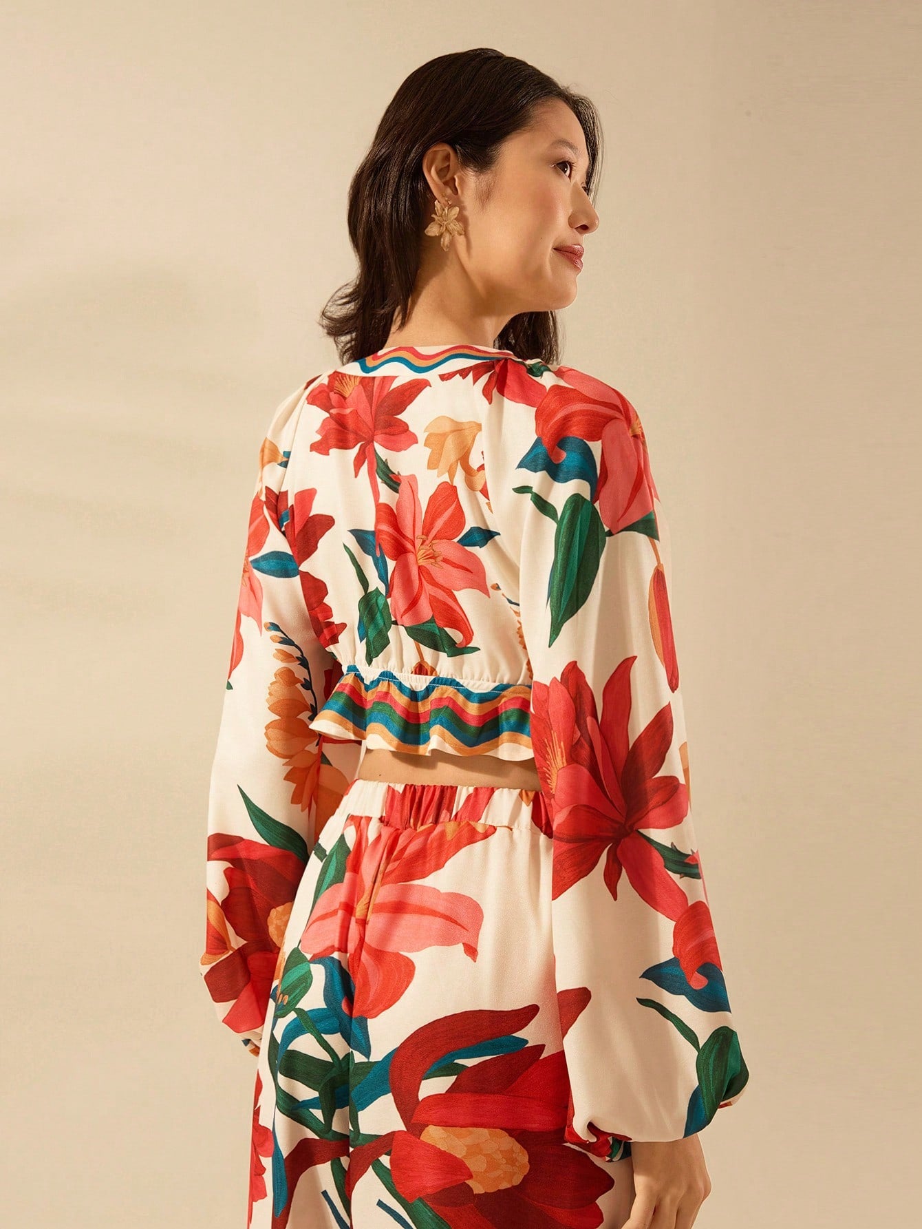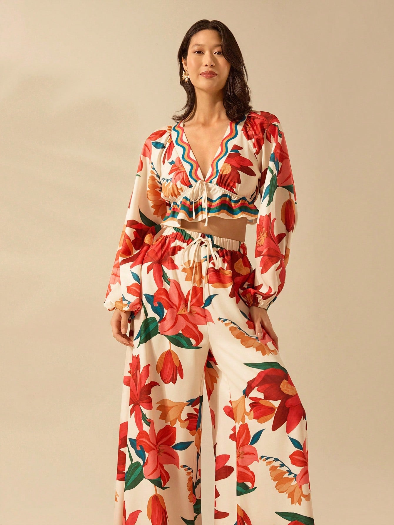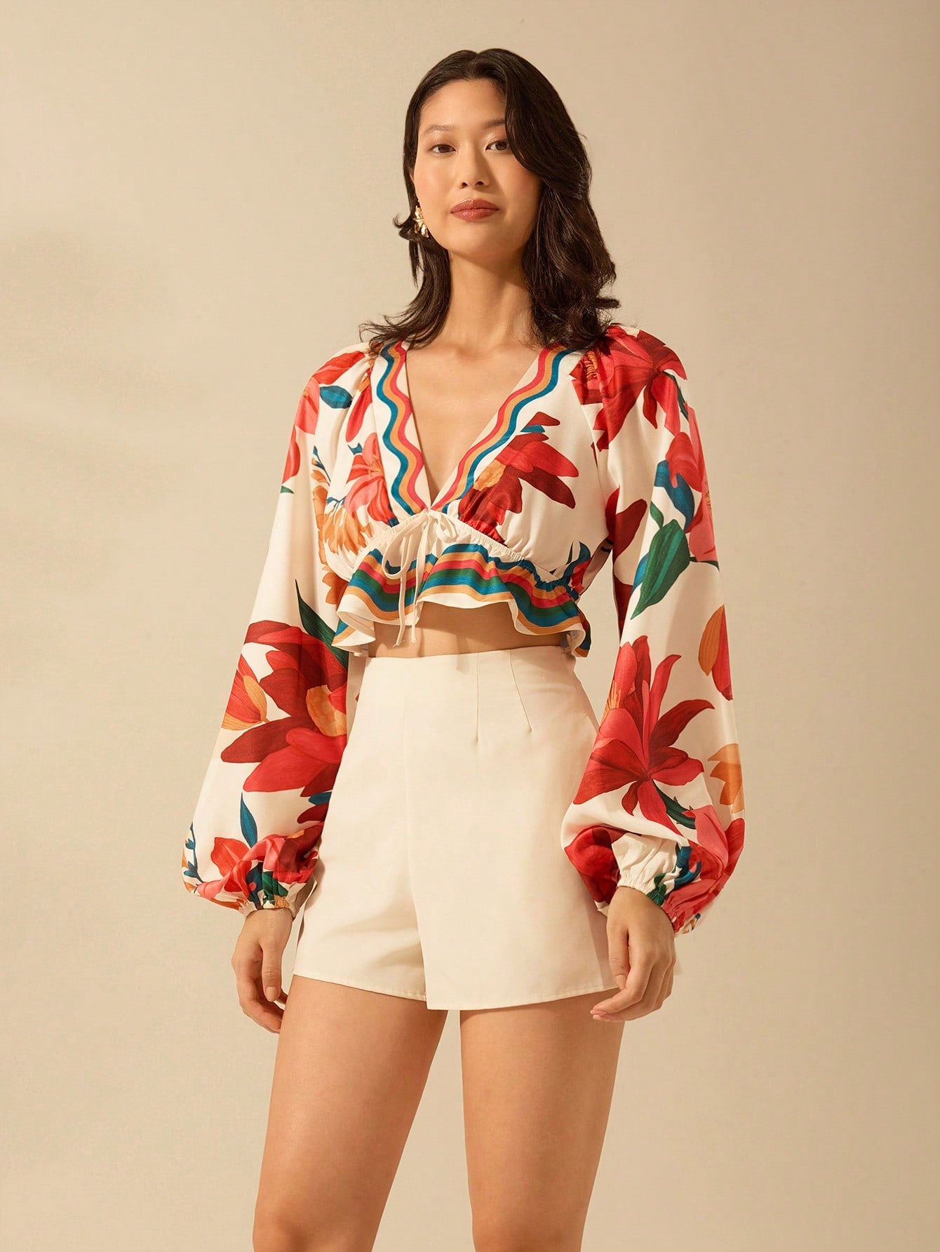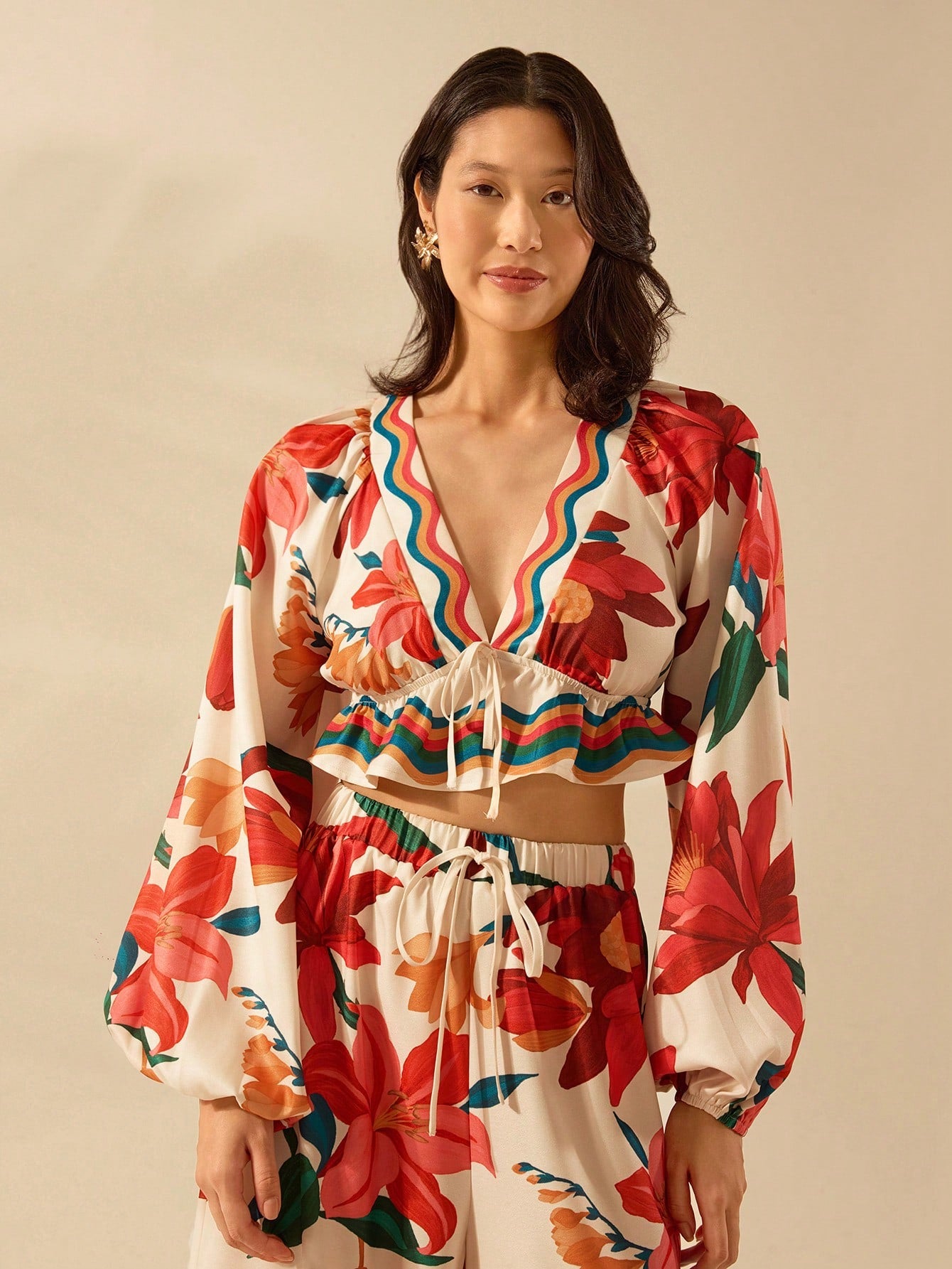 CAJUNI Women's Boho Vacation Tropical Floral Print Deep V-Neck Lantern Sleeve Tie Front Blouse, Casual