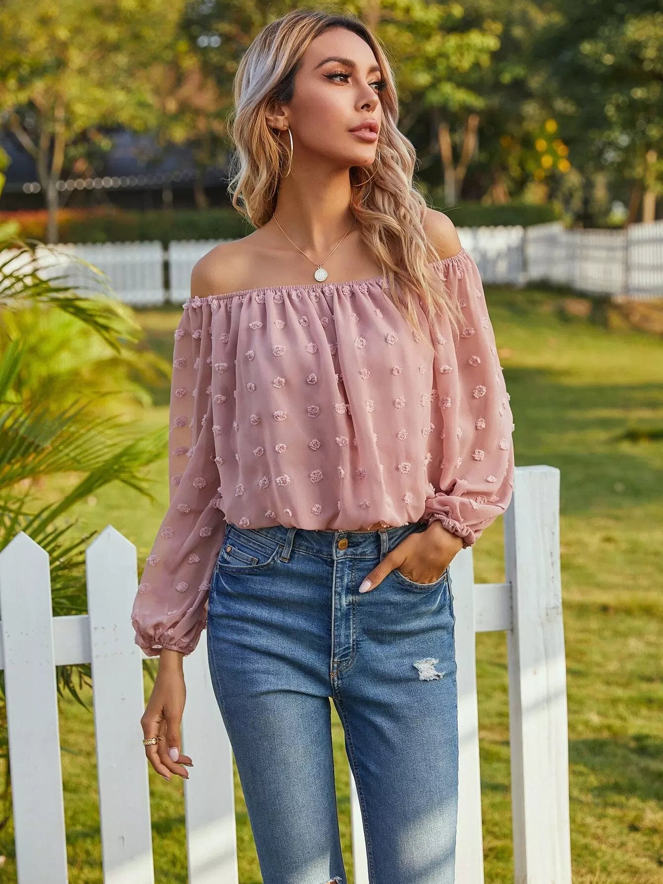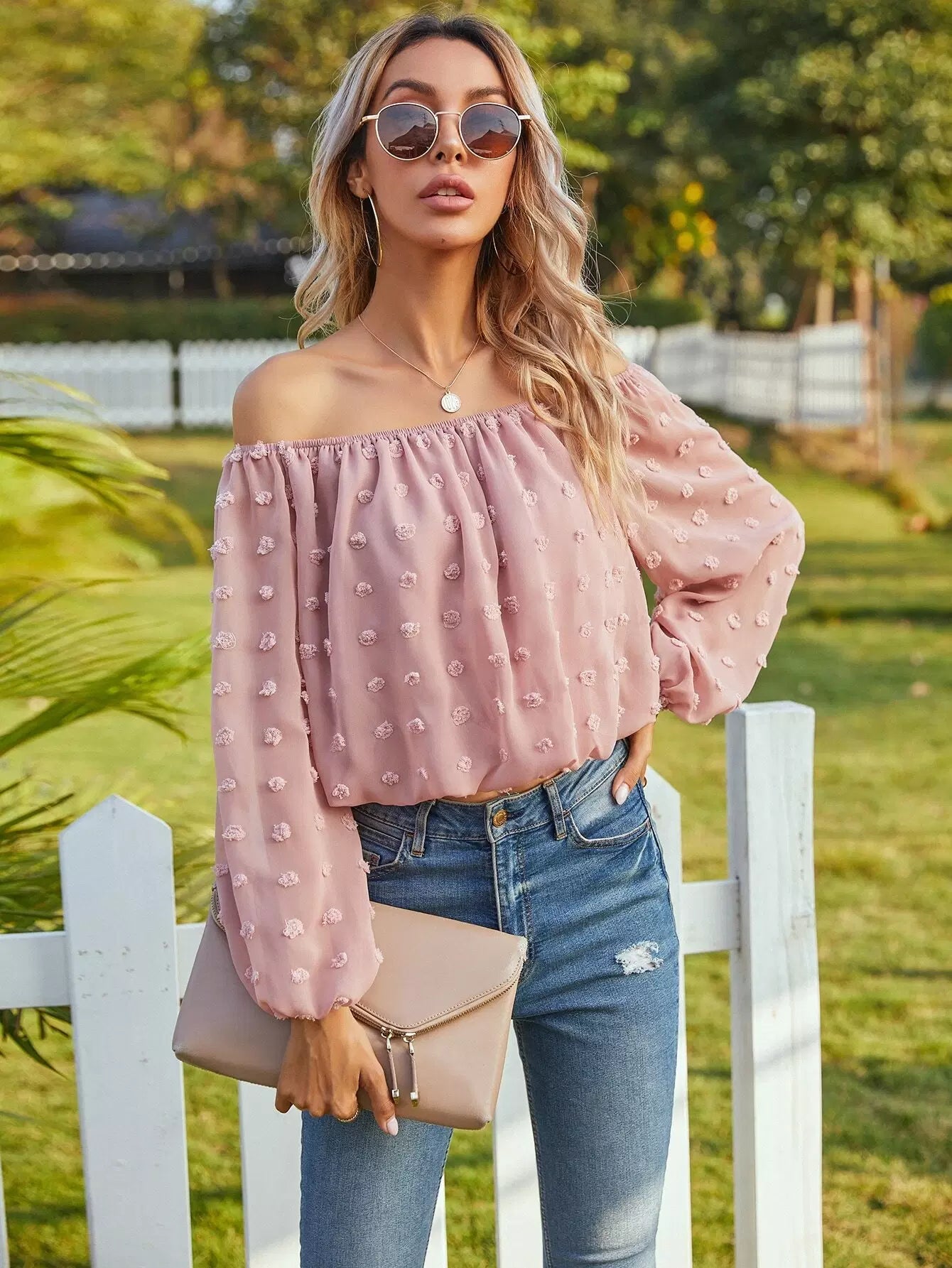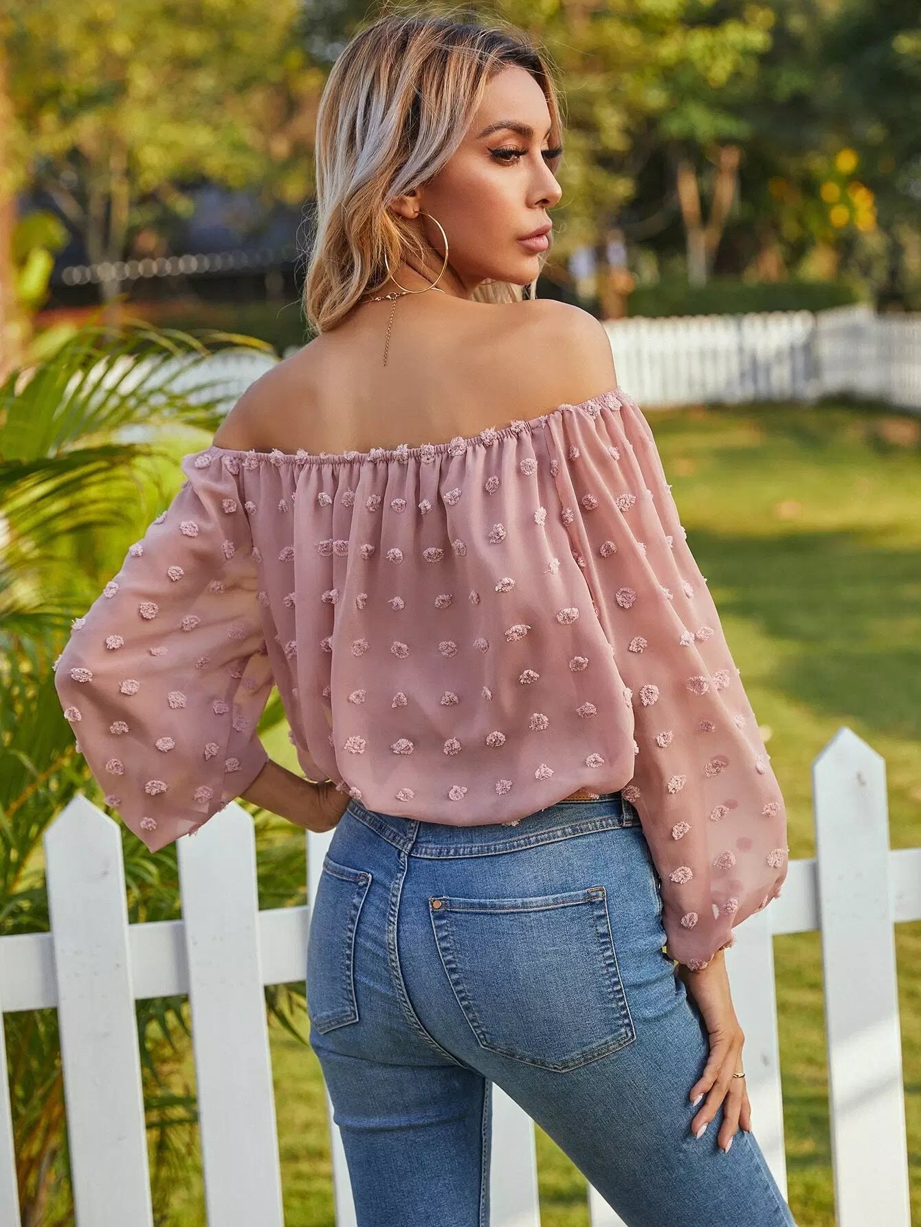Chiffon Swiss Dot Bishop Sleeve Bardot Blouse