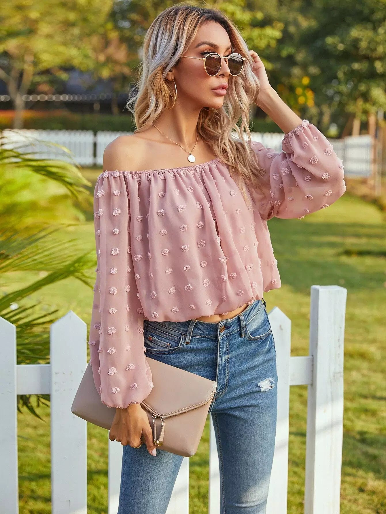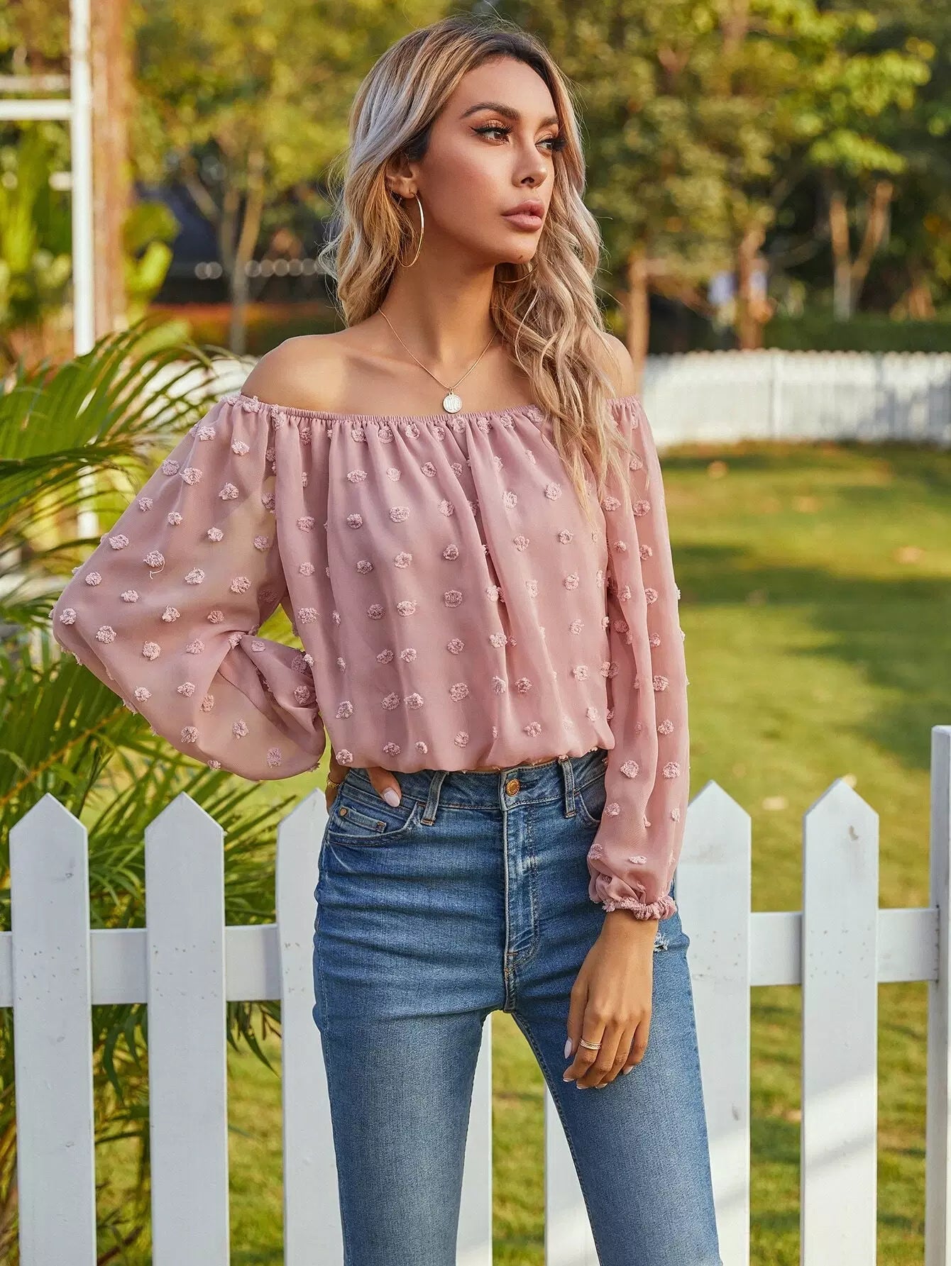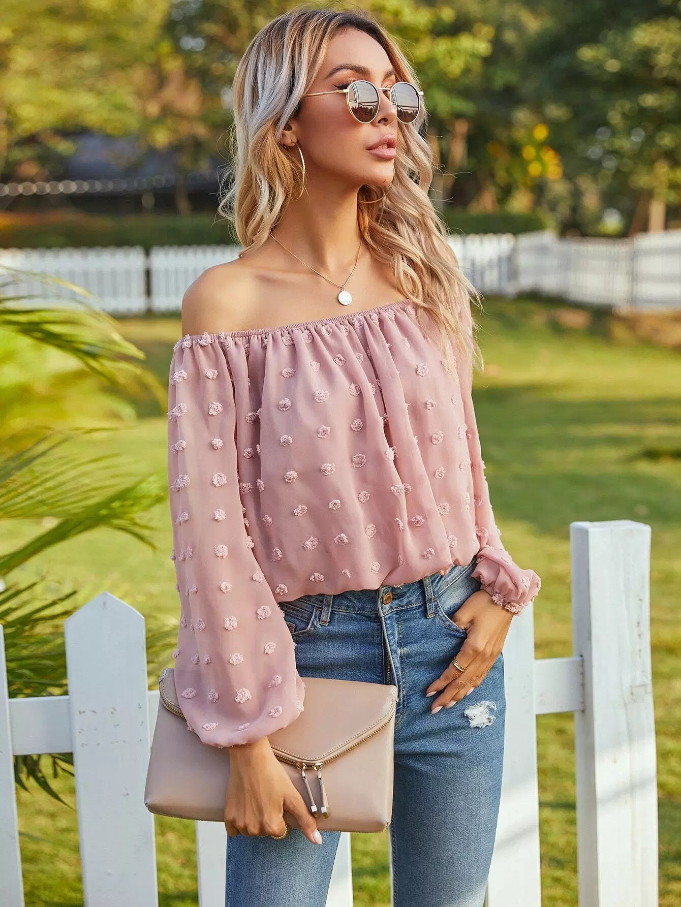 Chiffon Swiss Dot Bishop Sleeve Bardot Blouse