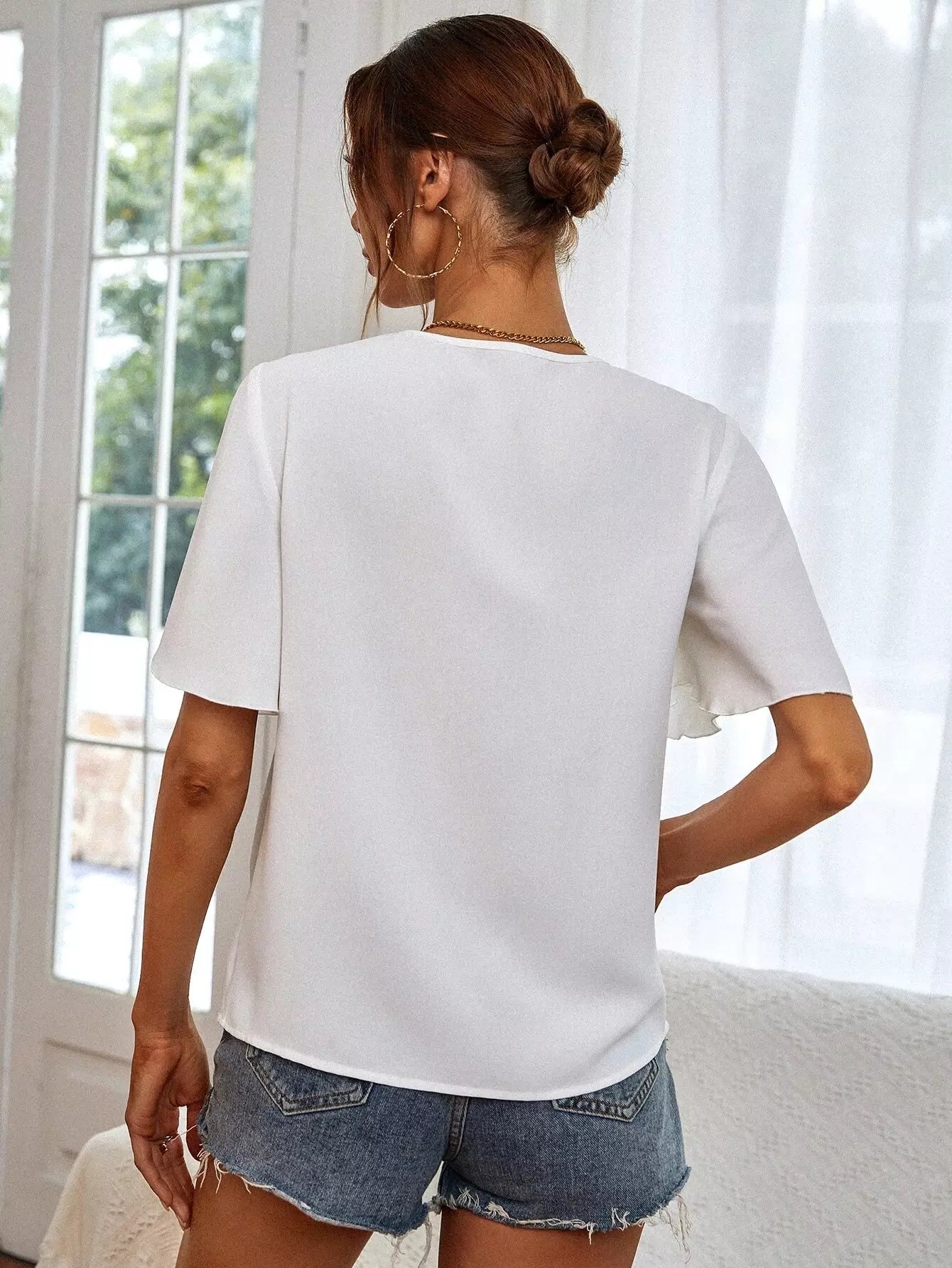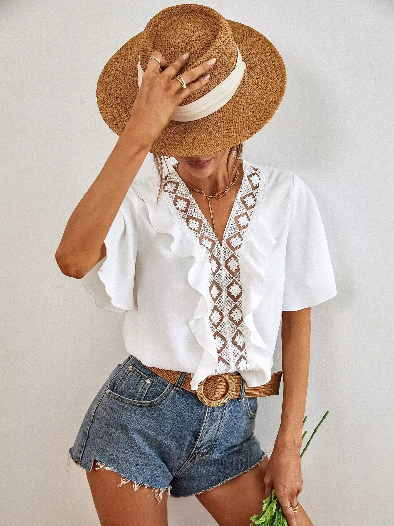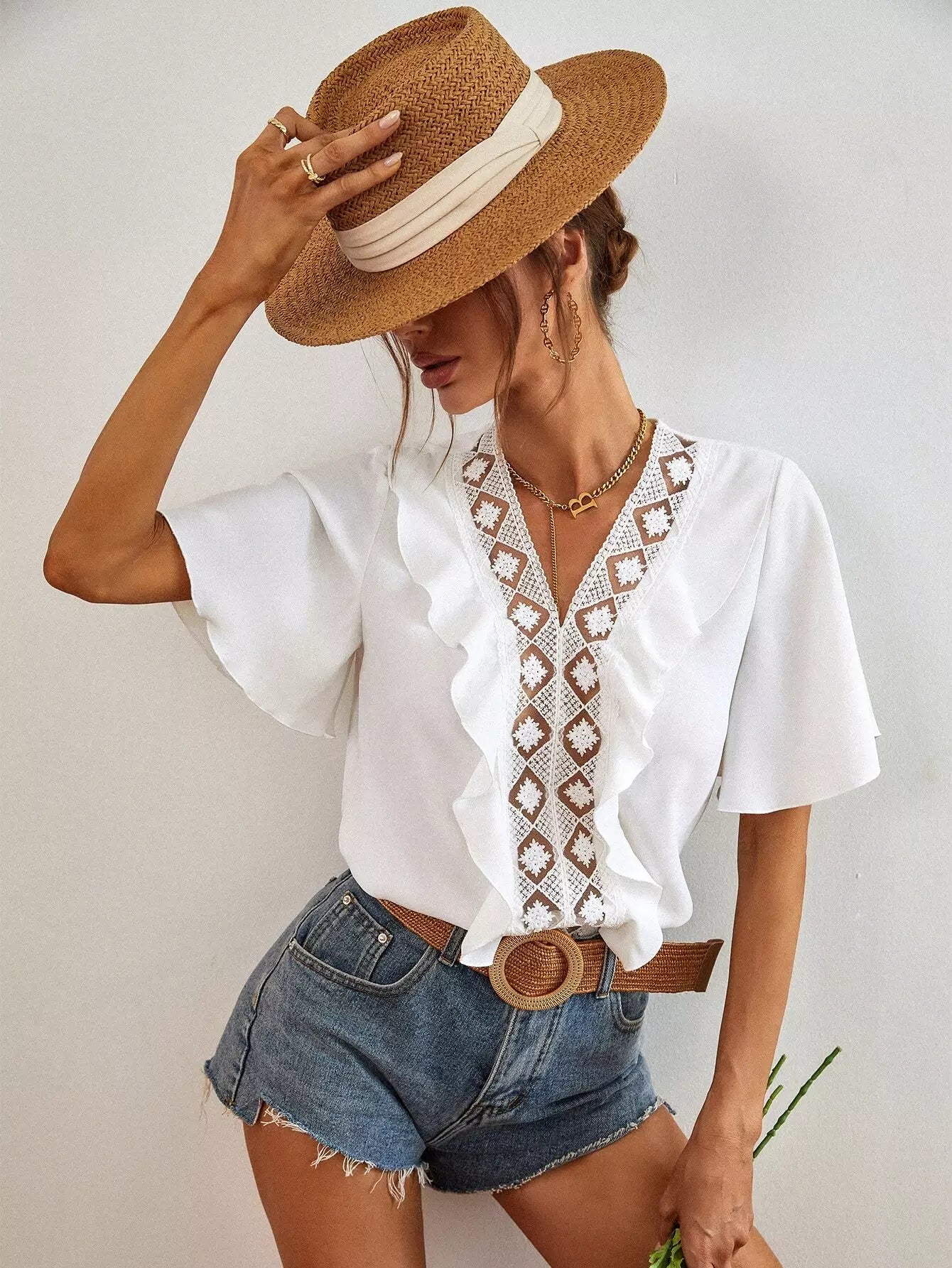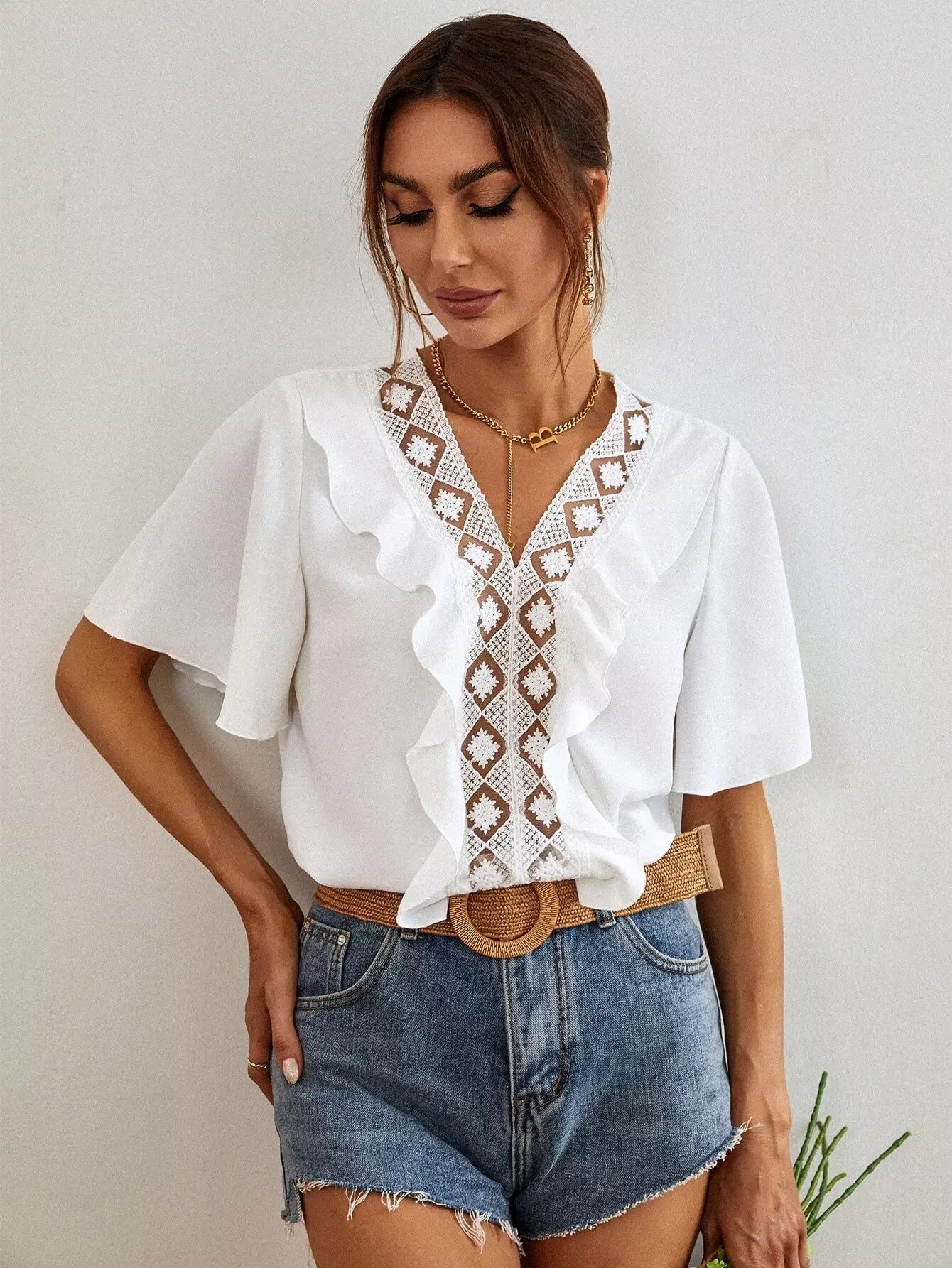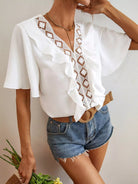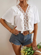 Contrast Lace Ruffle Trim Butterfly Sleeve Blouse