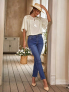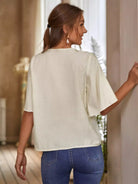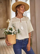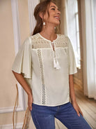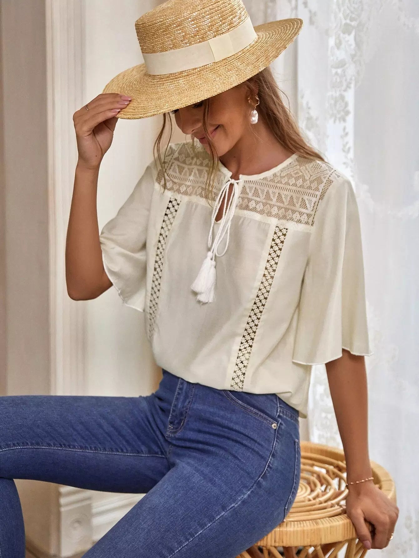 Contrast Lace Tie Neck Flutter Sleeve Blouse