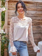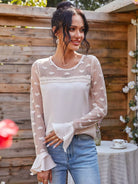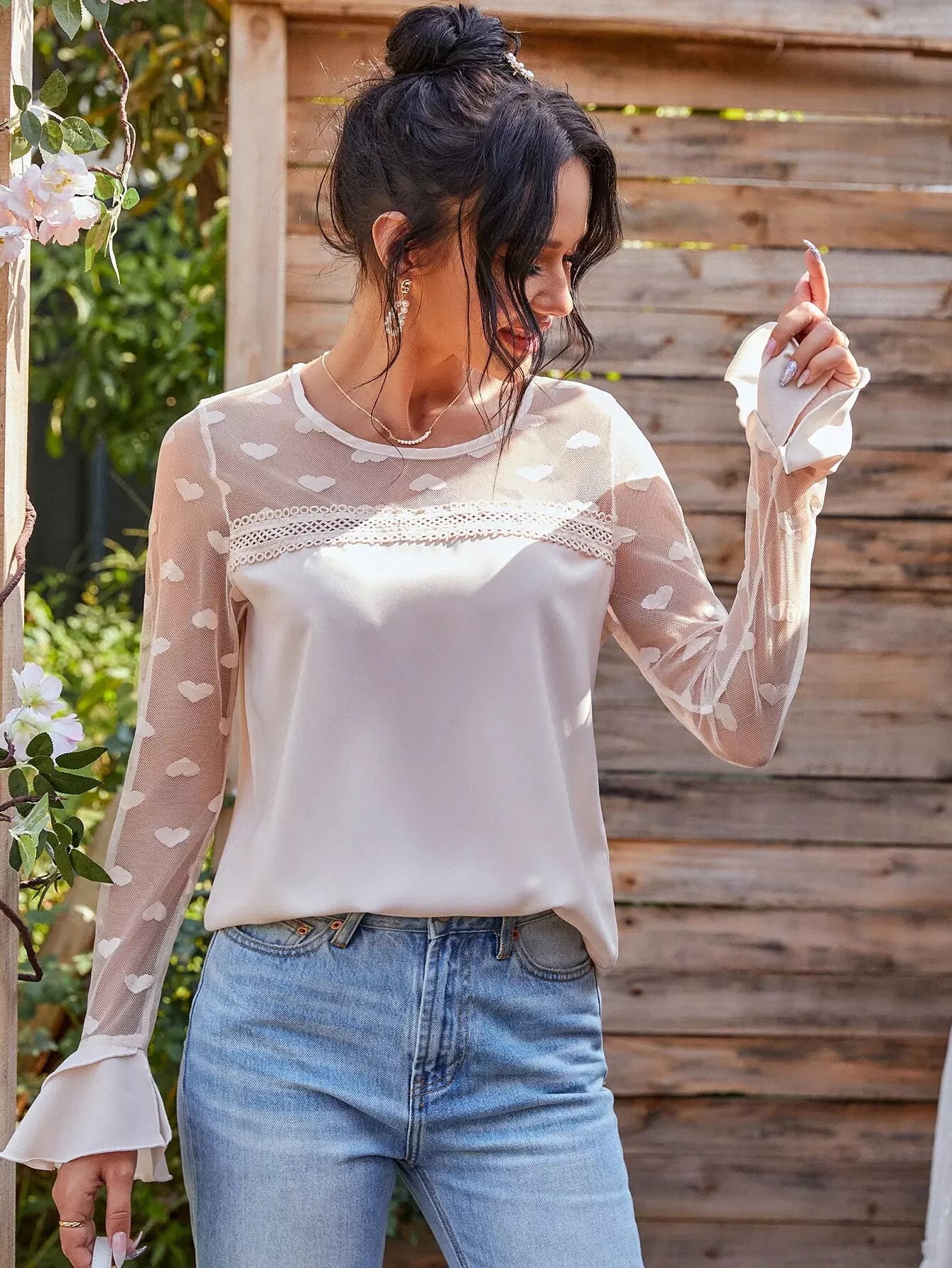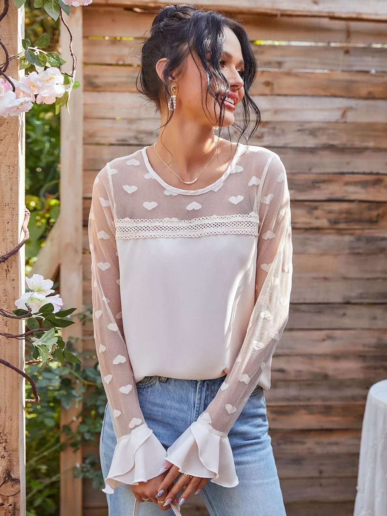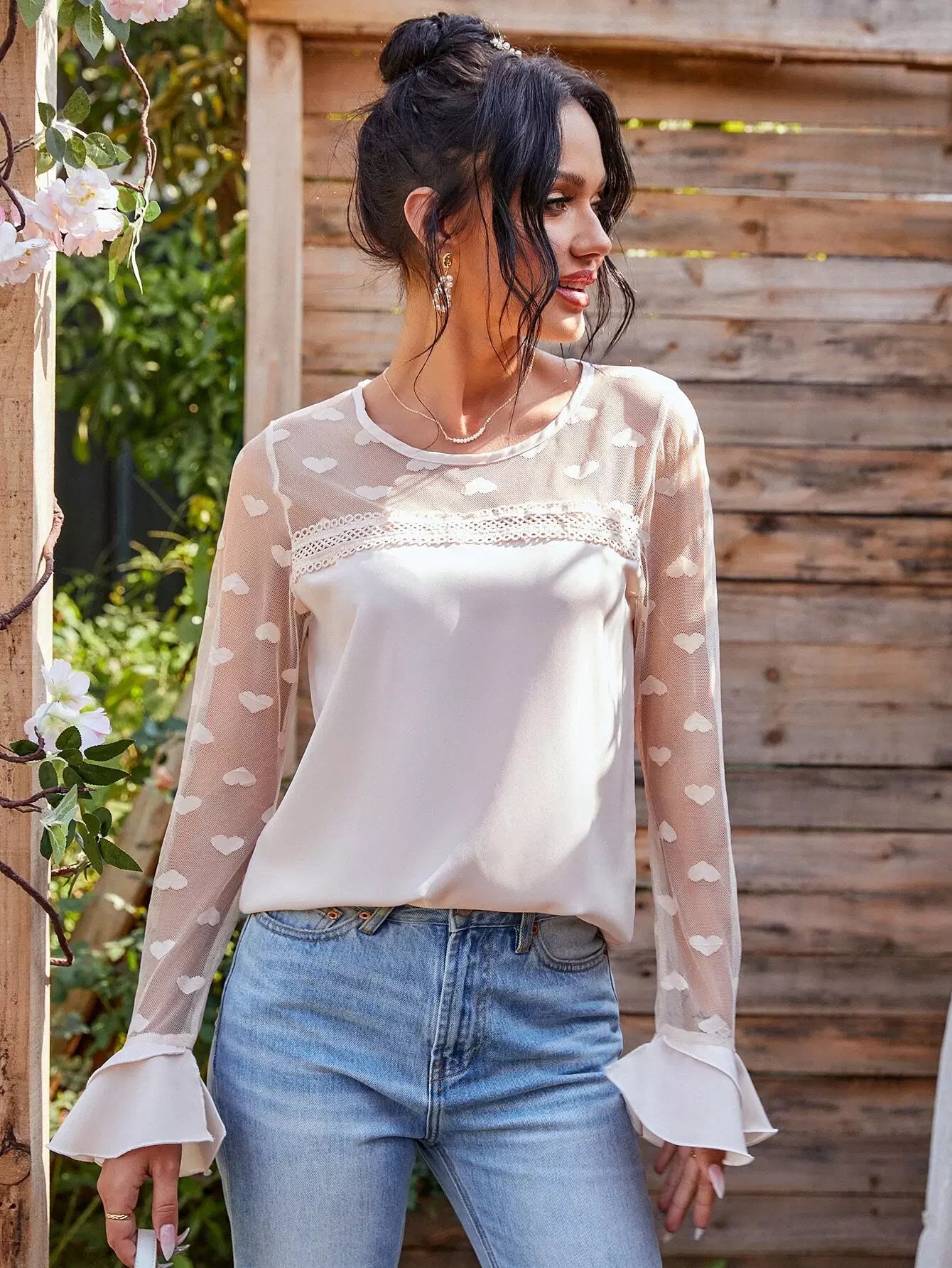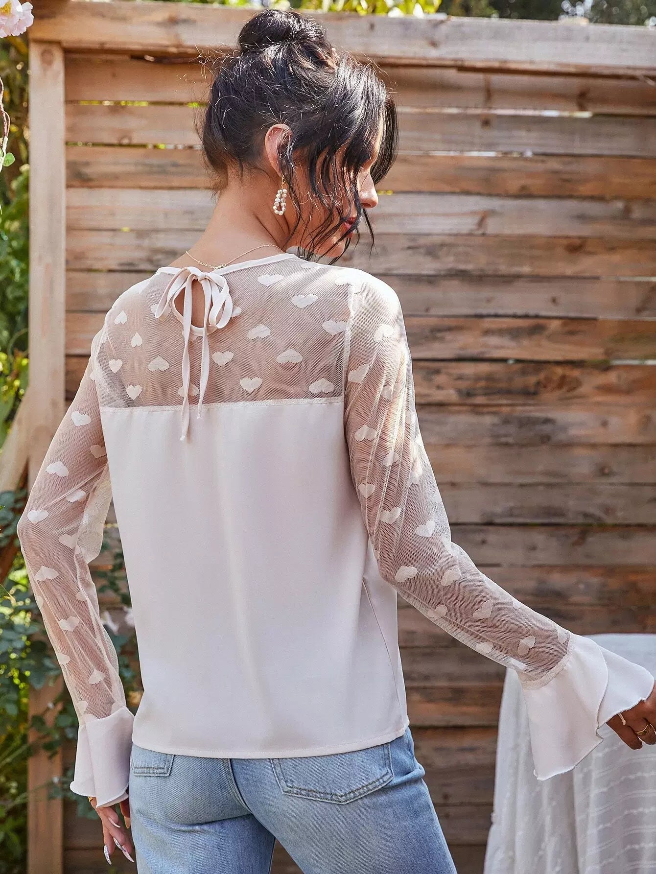 Contrast Mesh Heart Pattern Flounce Sleeve Blouse