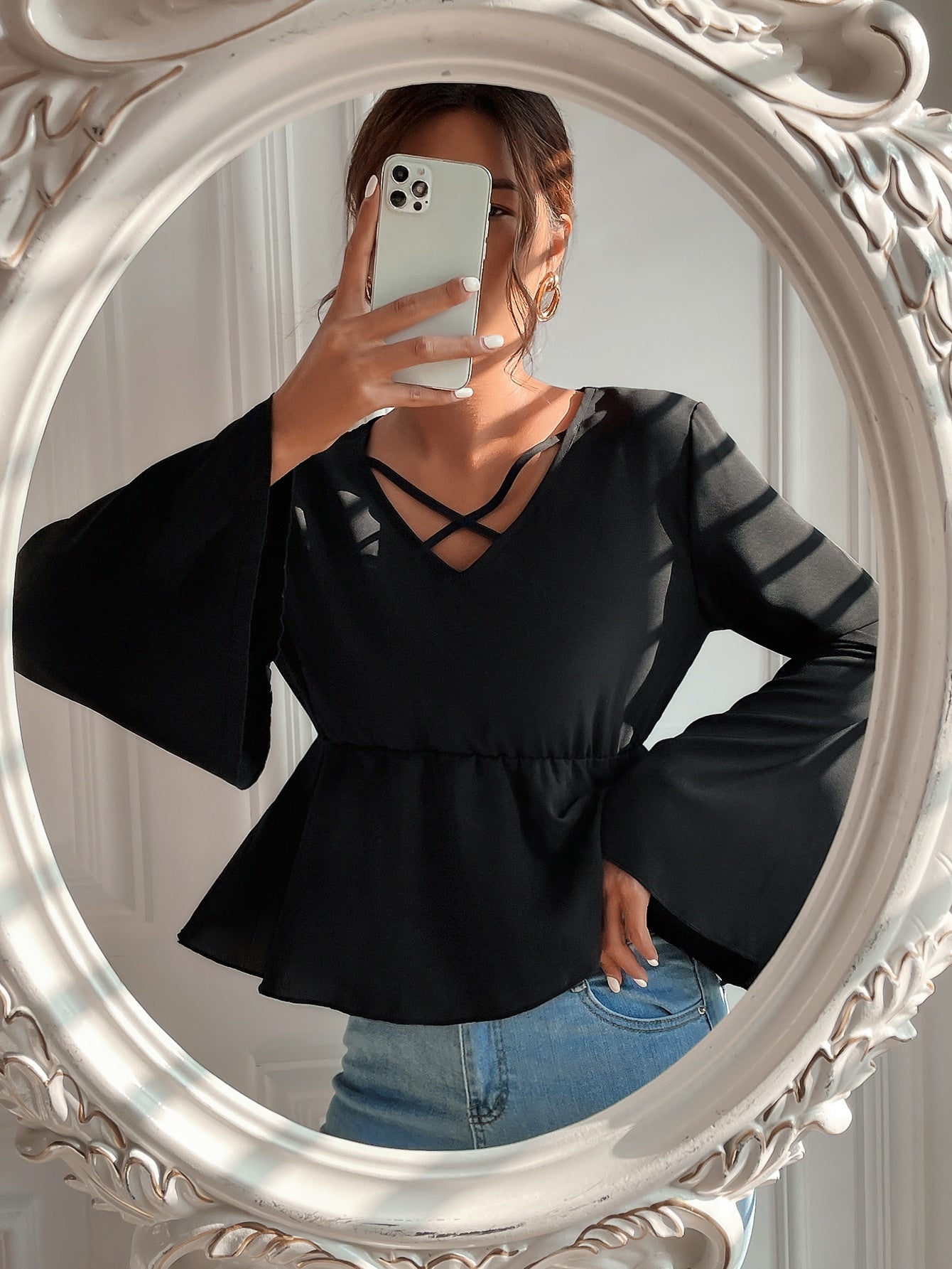 Crisscross Flounce Sleeve Peplum Blouse