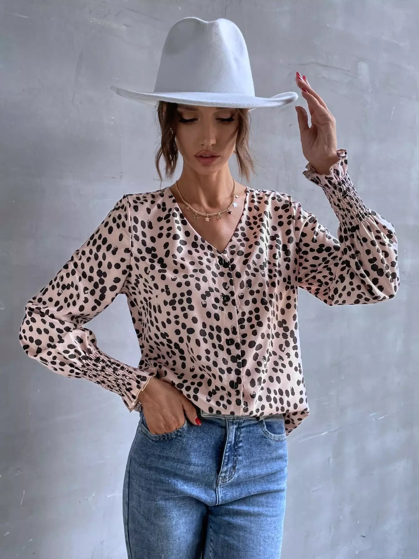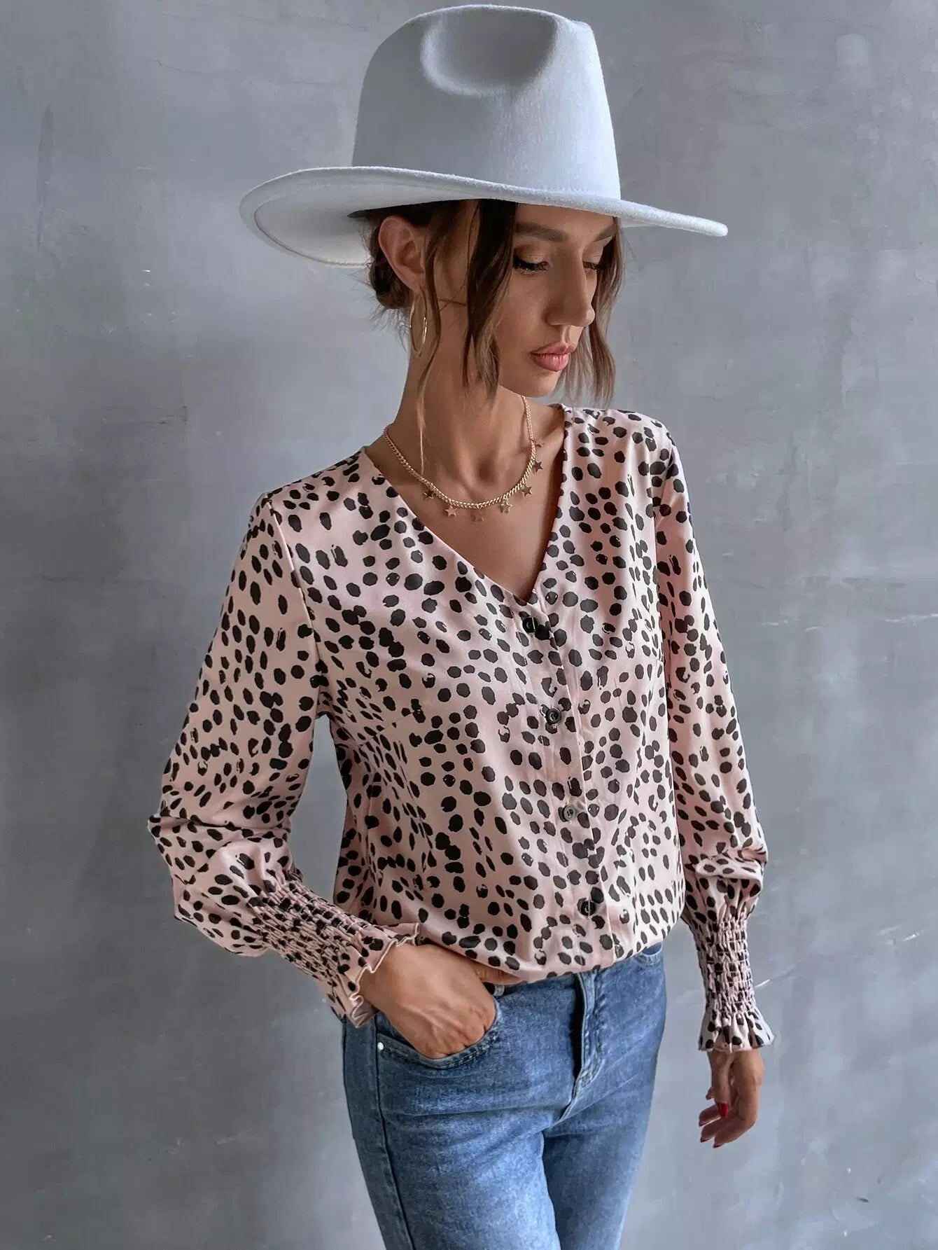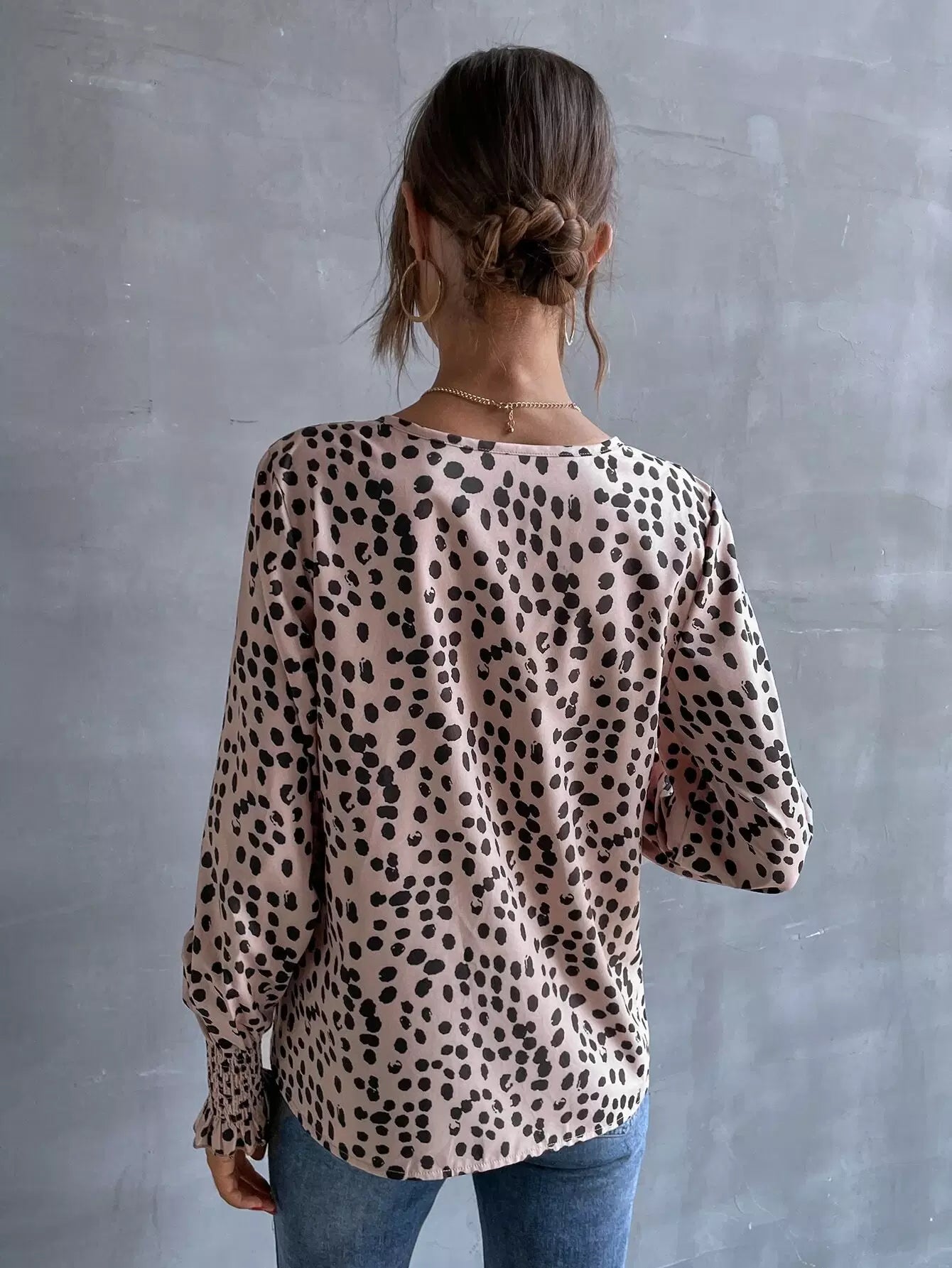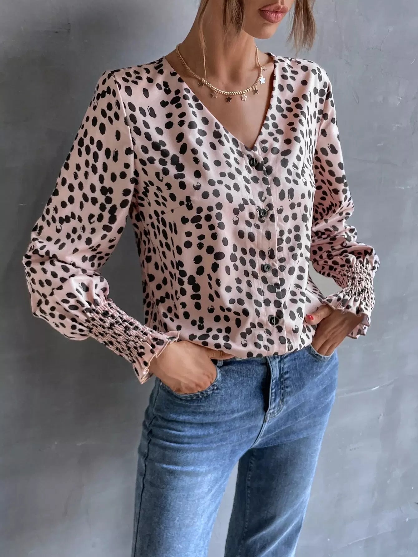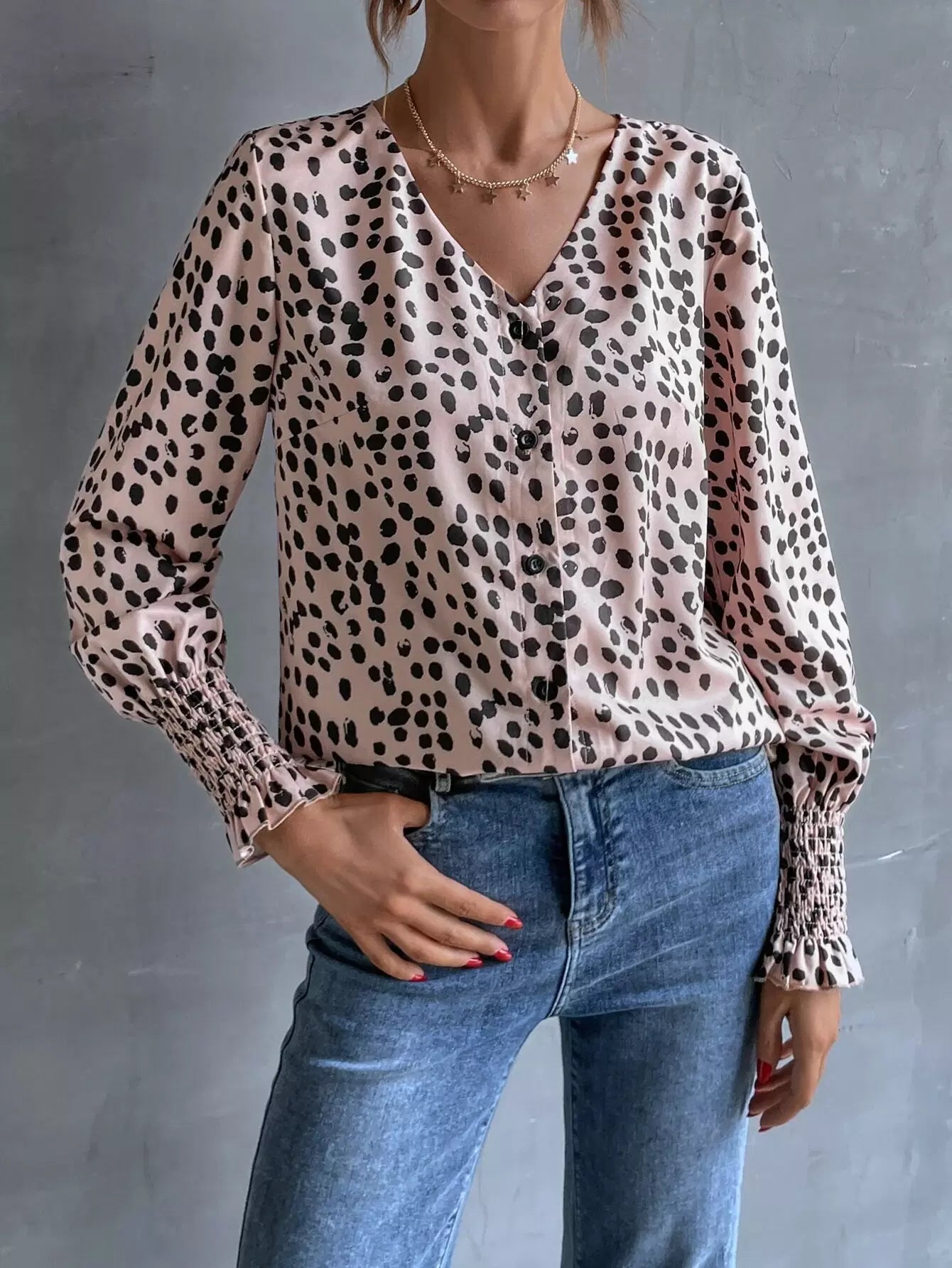 Dalmatian Print Shirred Cuff Frill Trim Blouse