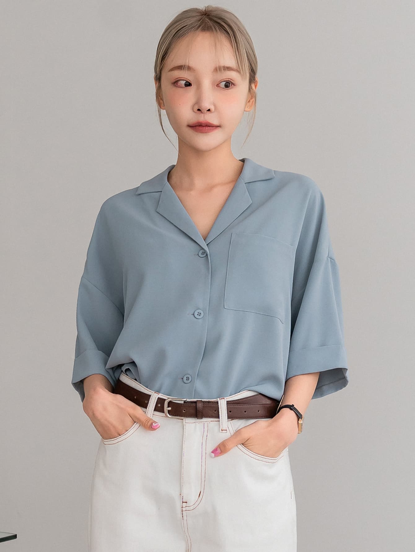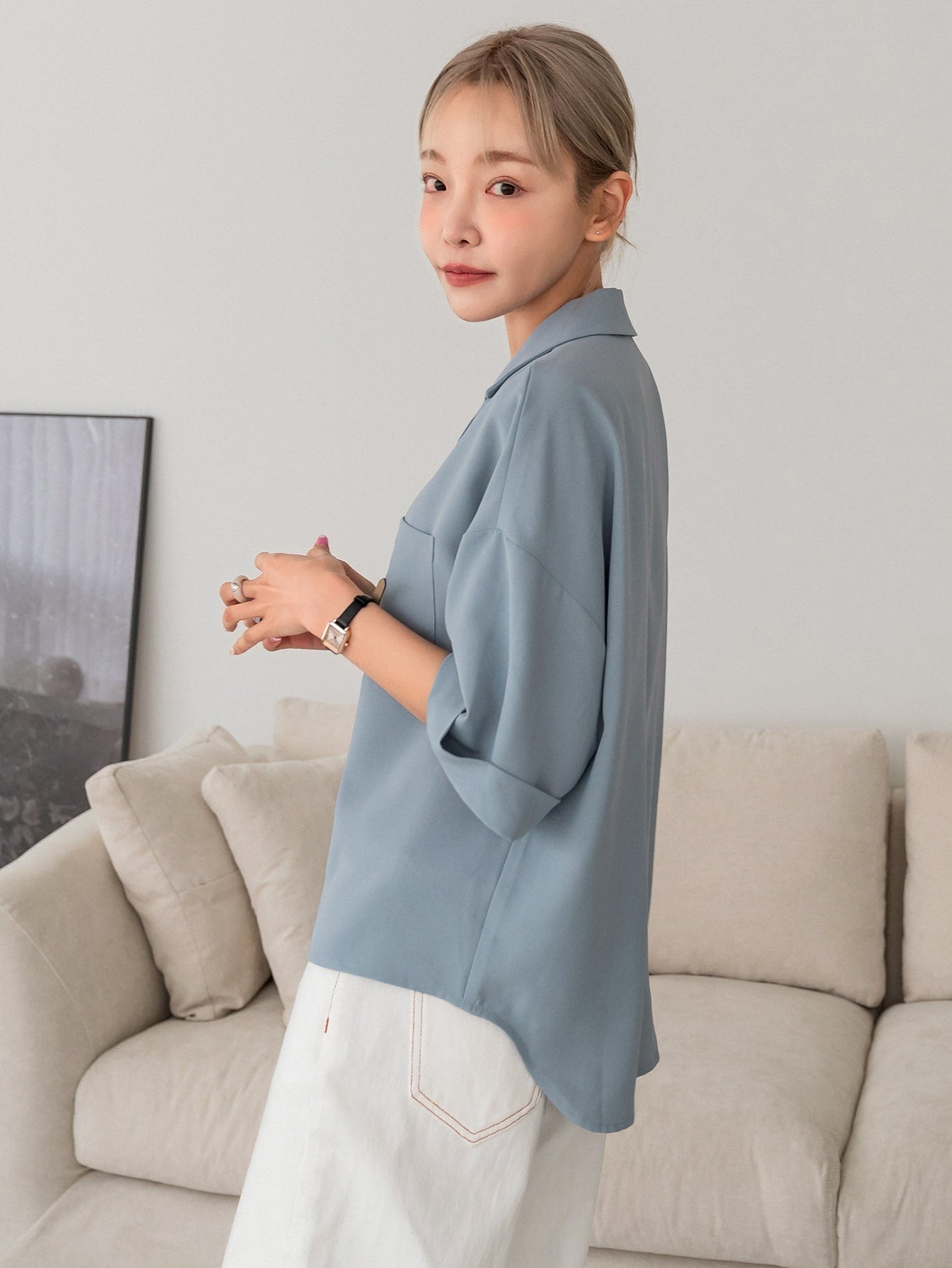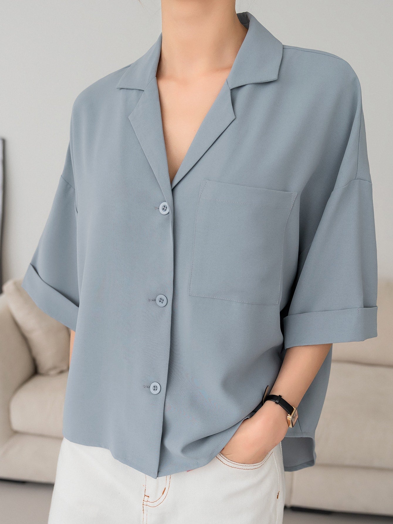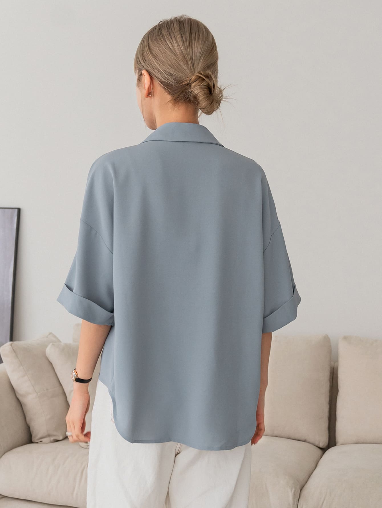 DAZY Button Front Drop Shoulder Blouse Business Casual Women