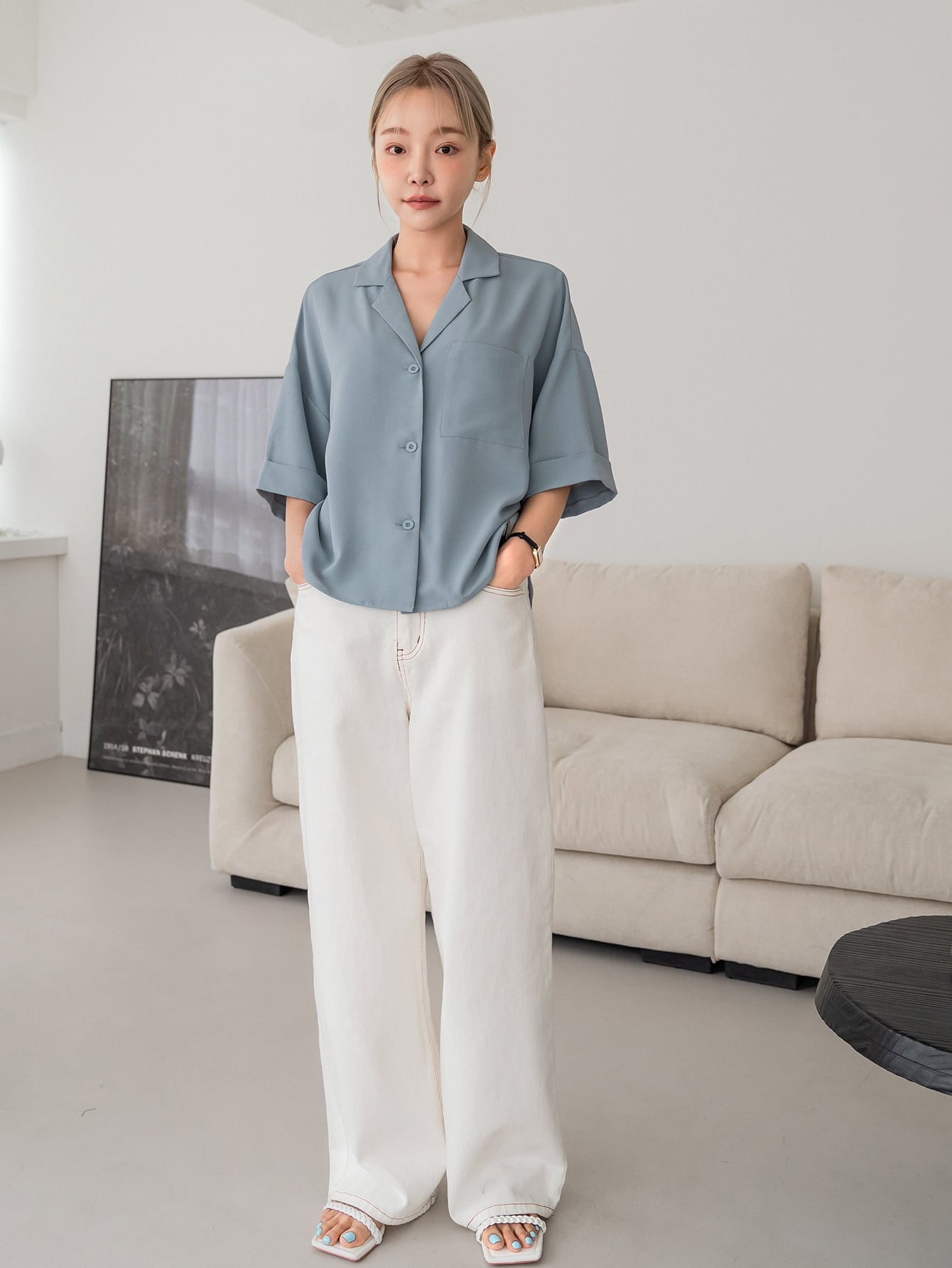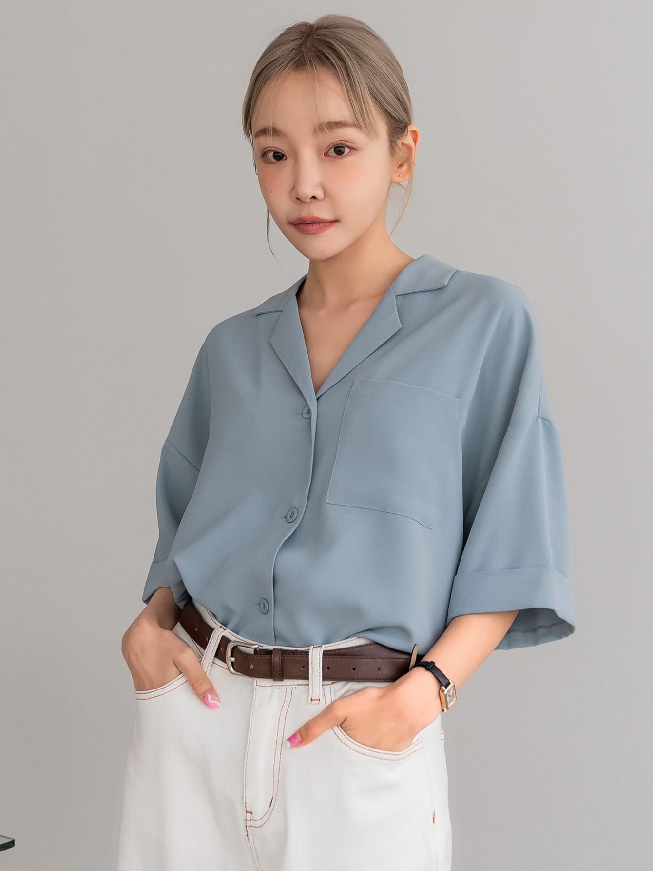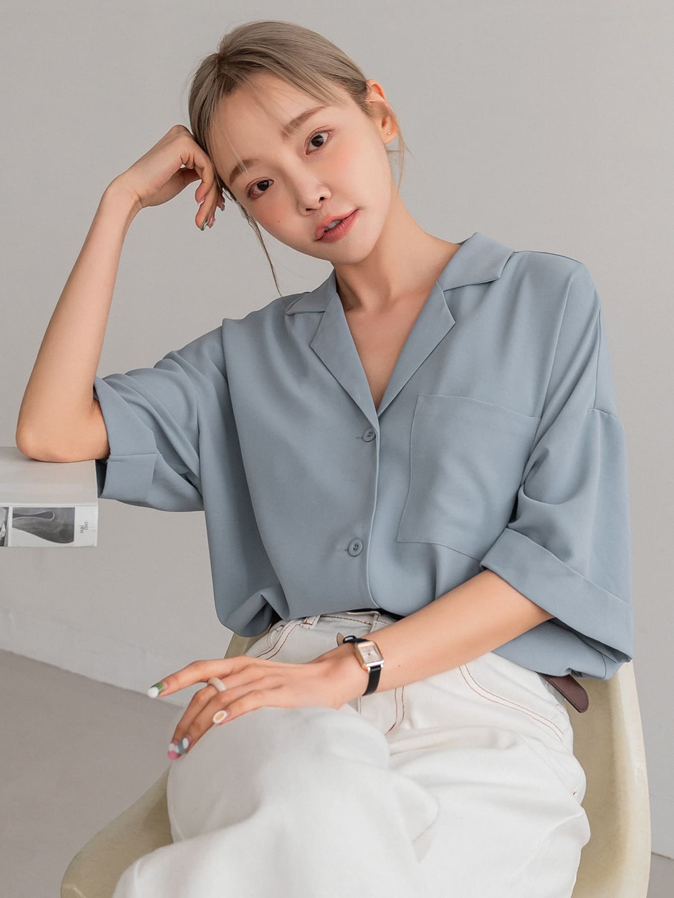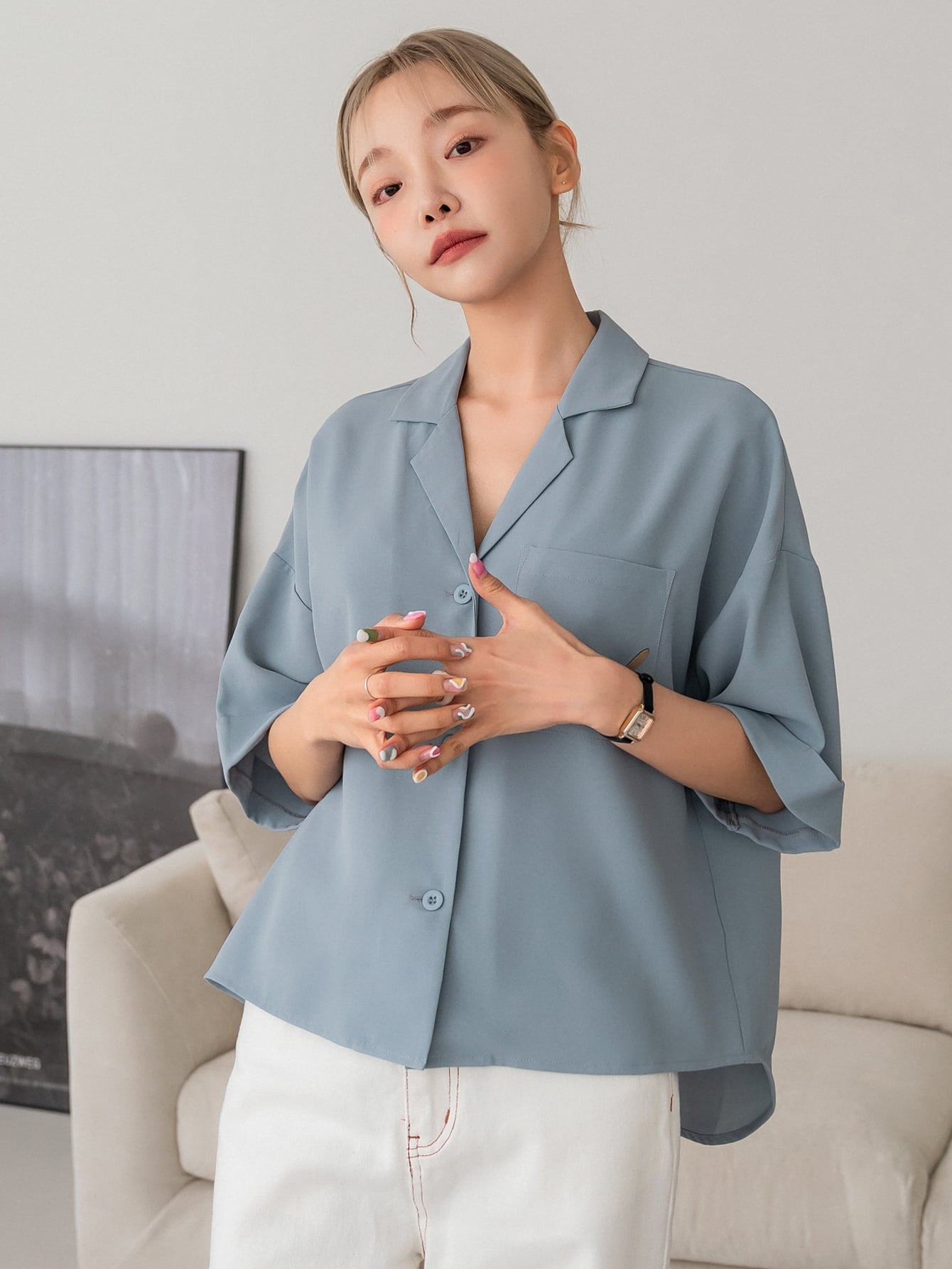 DAZY Button Front Drop Shoulder Blouse Business Casual Women