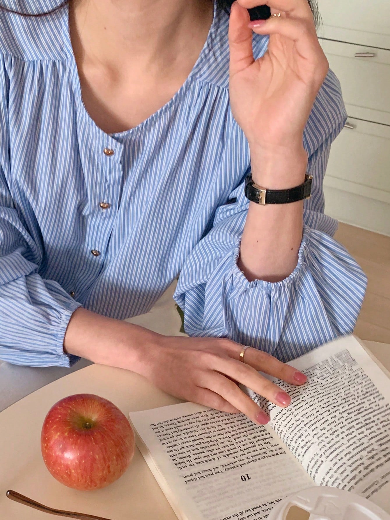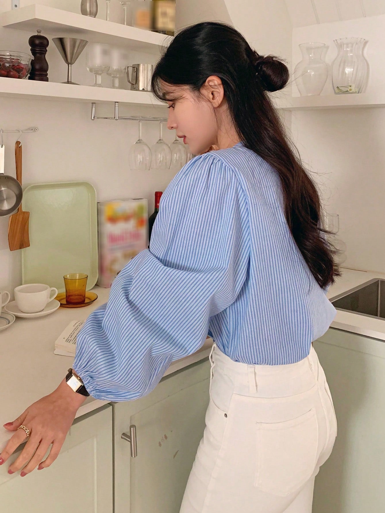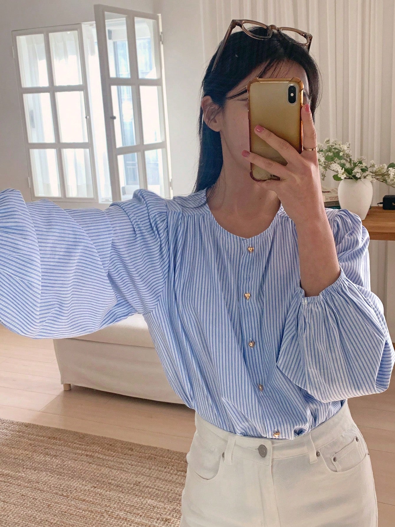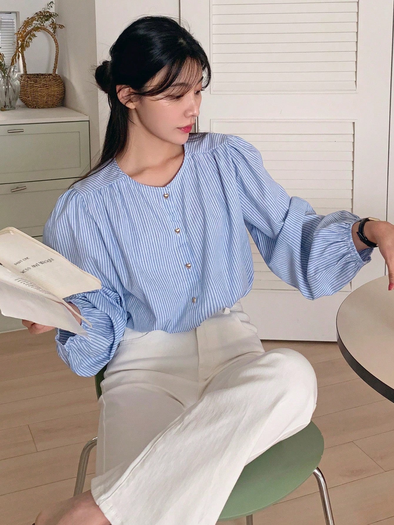 DAZY Women's Round Neck Puff Sleeve Striped Detailed Shirt