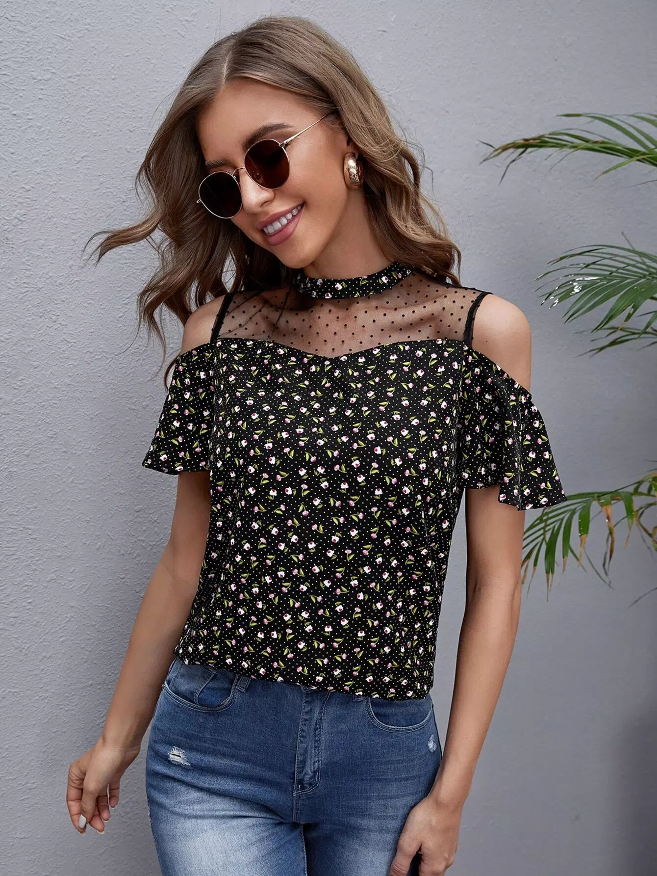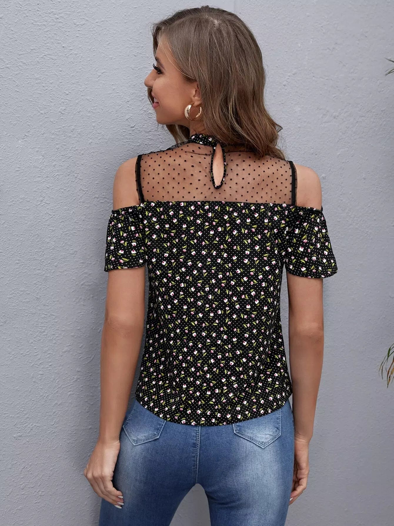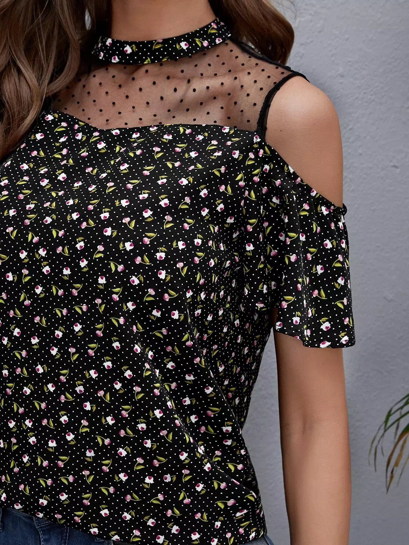 Women - Ditsy Floral Cold Shoulder Sheer Mesh Yoke Top